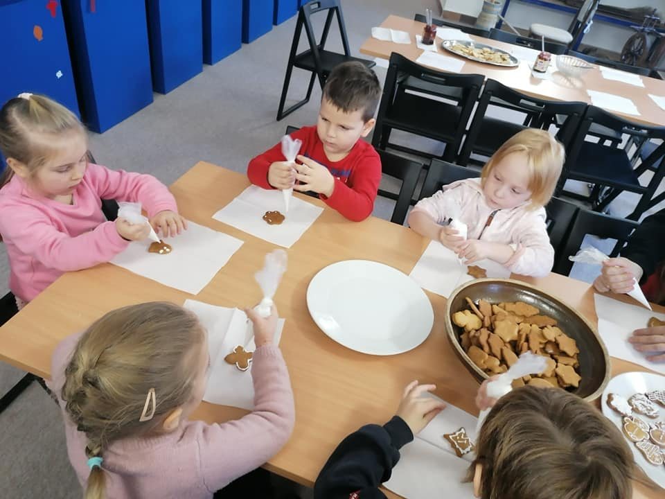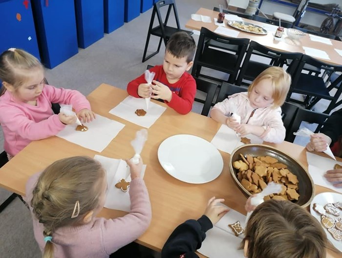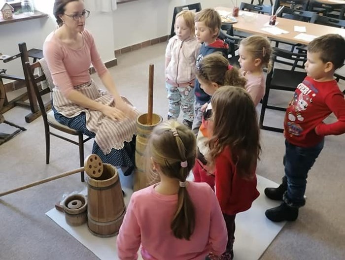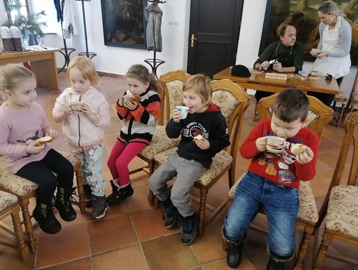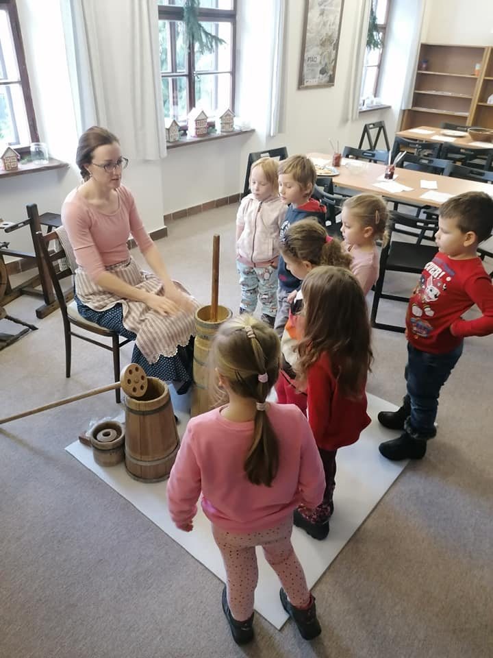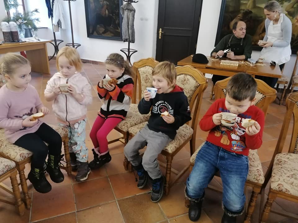 V pondělí 13.12.2021 se děti z oddělení Hvězdiček vydaly na výlet do Nového Jičína, na edukační program v Žerotínském zámku, kde si vyslechly vyprávění o vánočních zvycích našich prarodičů. Povídání bylo doplněno ukázkami výroby tradičních předmětů týkajících se Vánoc a děti mohly poznat, jak se předlo na kolovratu či jak se vyřezávalo ze dřeva. V rámci programu si ozdobily baňku i perníček, slepily cukroví a vyzkoušely si stloukání másla. Prožili jsme krásné dopoledne v atmosféře adventního času.