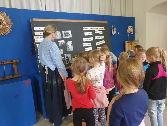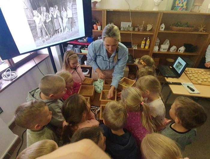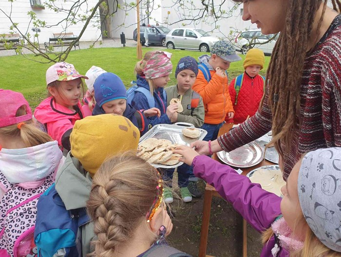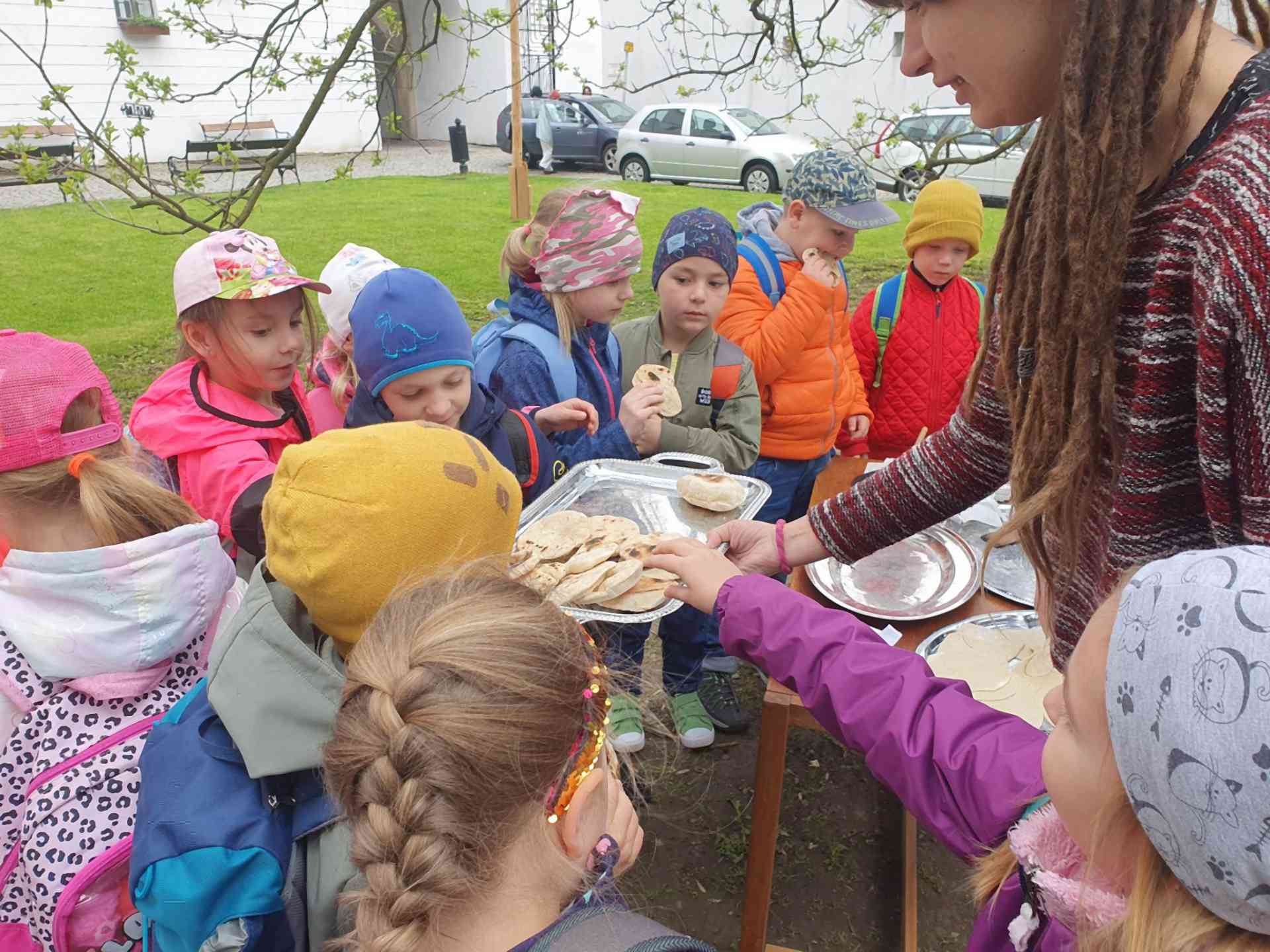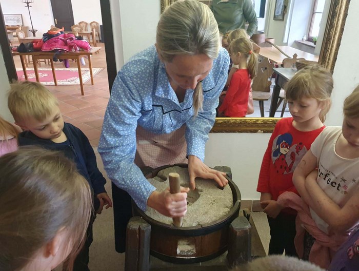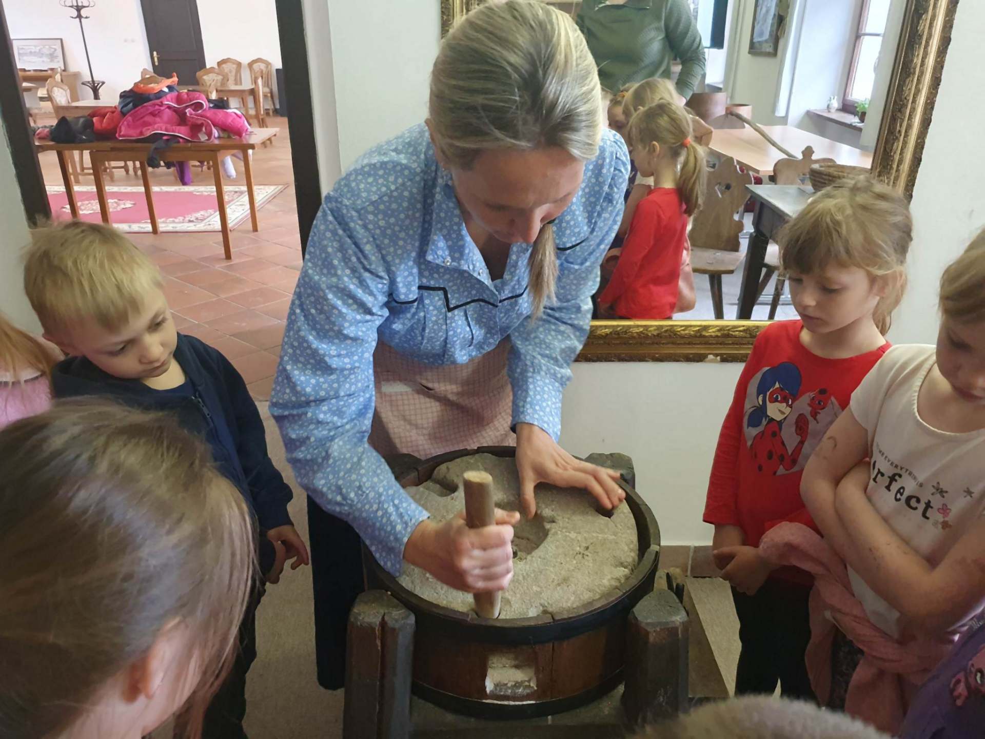 Bylo nebylo, jednou si jedno malé nadělení… ehm, chci říci oddělení, bylo to oddělení Soviček, co šlo upéct chleba na Žerotínský zámek. Ráno se sešly Sovičky u autobusu s batůžky, co v nich měly svačinky od maminek. Cesta byla brnkačka, vždyť tyhle děti zná už i pan řidič. Na zámku jsme se dozvěděli, jak se dříve dělával poctivý chleba. Namleli jsme si vlastní mouku, uváleli si chlebovou placku a tu pak opekli na ohni. Byla vážně moc dobrá.