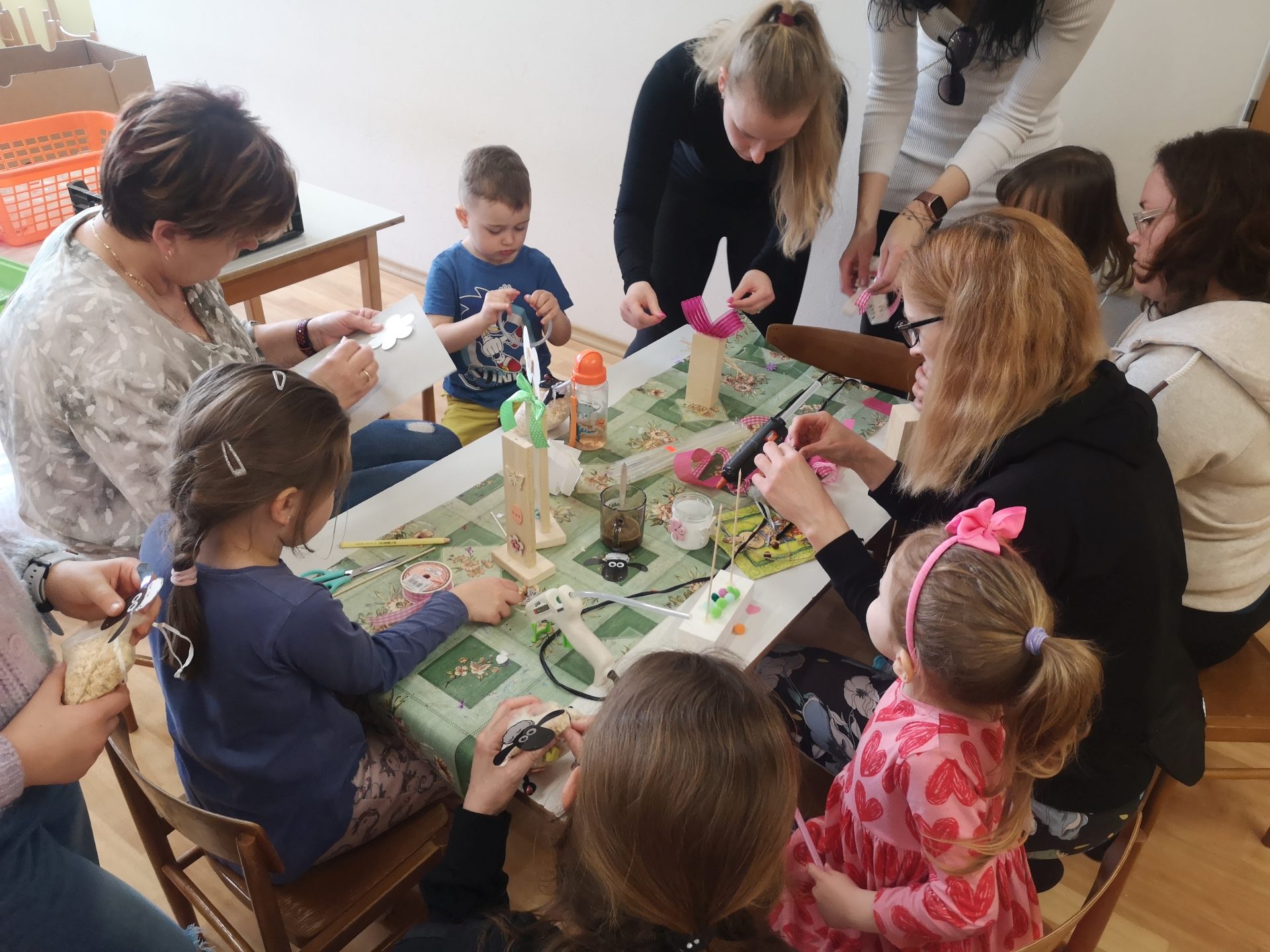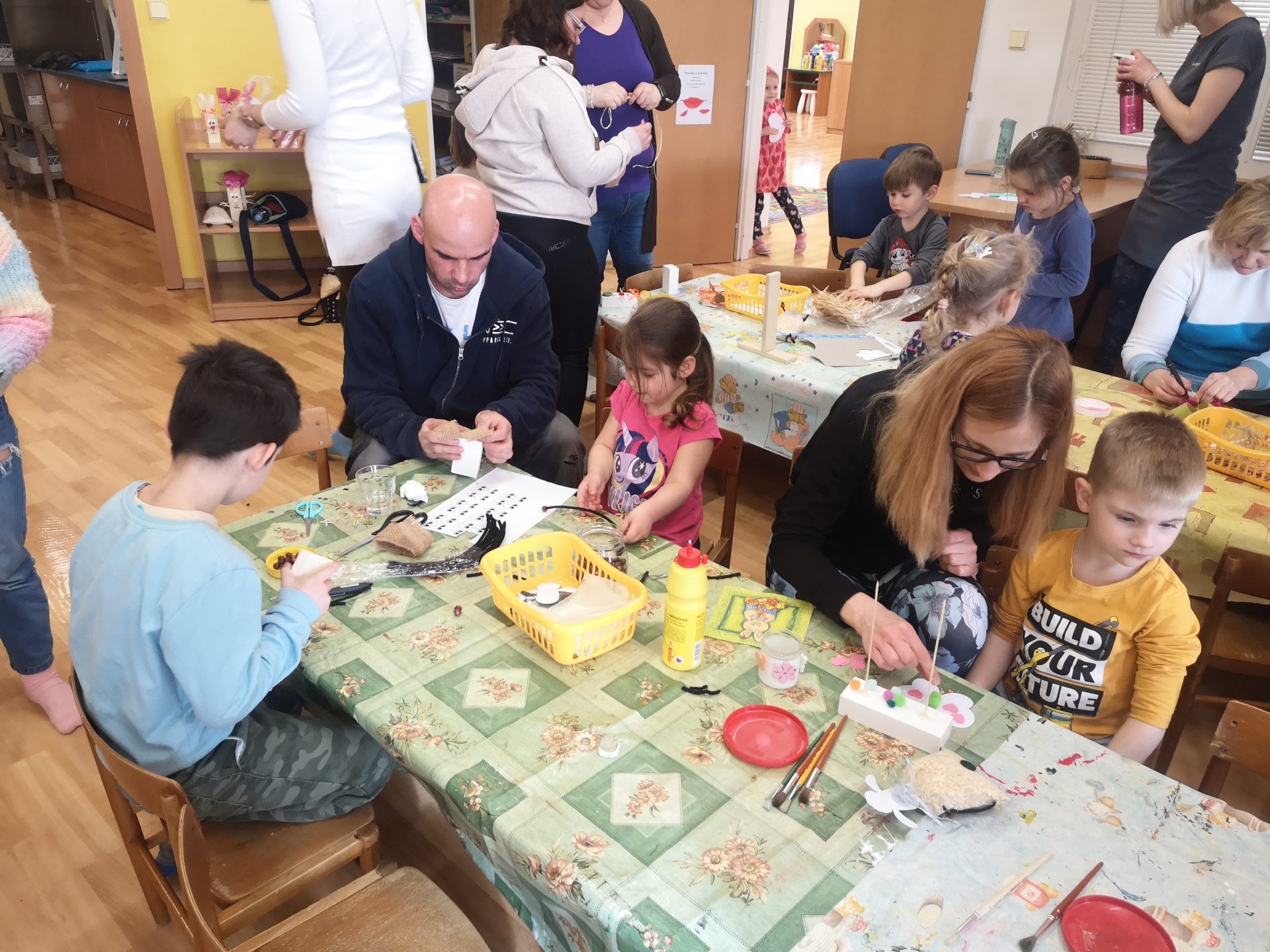Na čtvrtou březnovou středu jsme si za naši třídu dovolily do školky pozvat rodiče, aby si společně s dětmi v duchu jara a Velikonoc zatvořili. Rodiče a děti si spolu užili hezké chvíle a vytvořili si líbivé dekorace, například dřevěné stojany s kytkami či motýly nebo dřevěné zajíce a jiné, které si následně odnesli s sebou a jistě si s nimi s radostí vyzdobili své domovy.