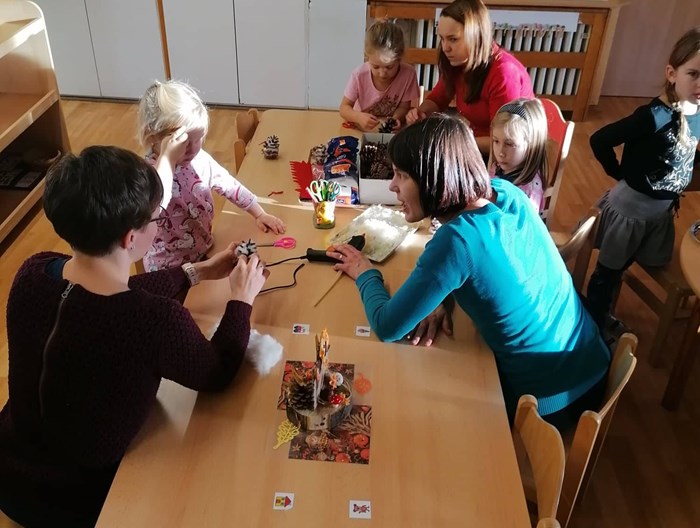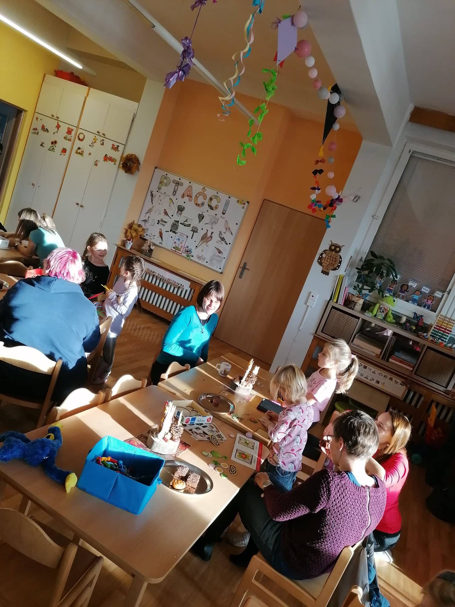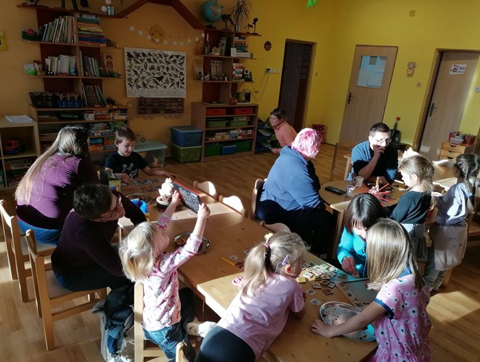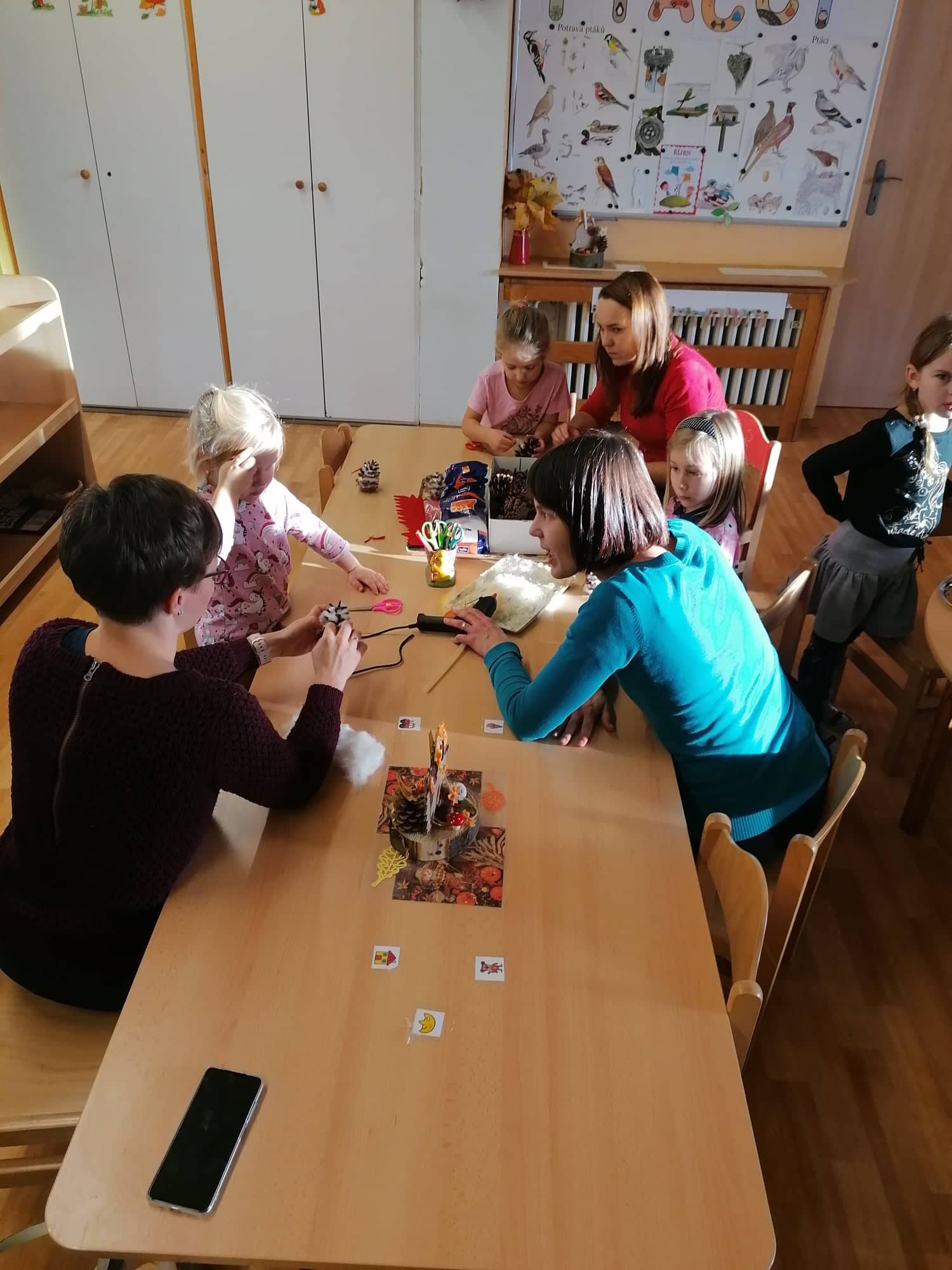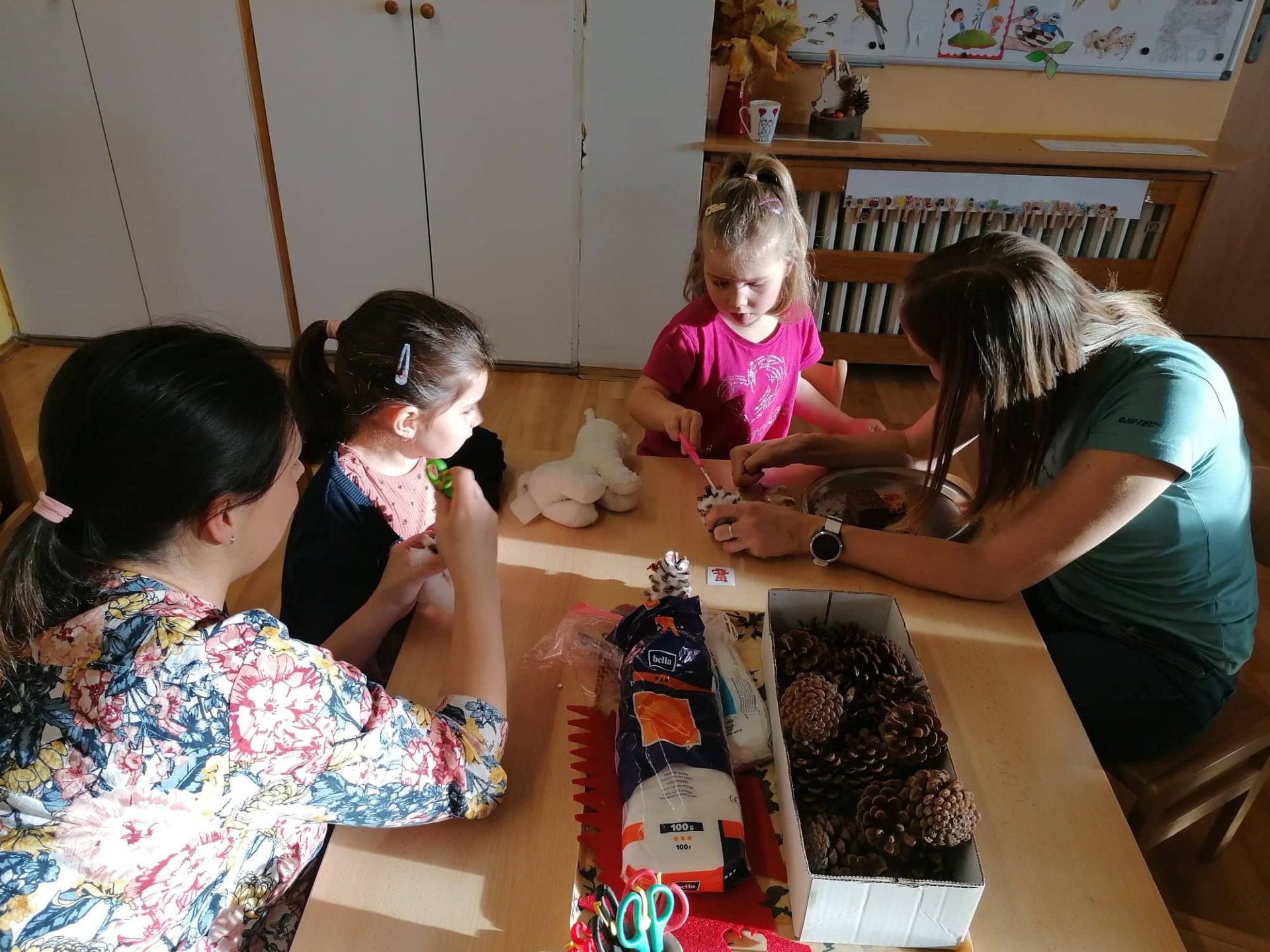 Aneb když si dospělák přijde pohrát se svým dítkem do školky, dá si k tomu kafíčko, výborné občerstvení a vytvoří si sovičku ze šišky.