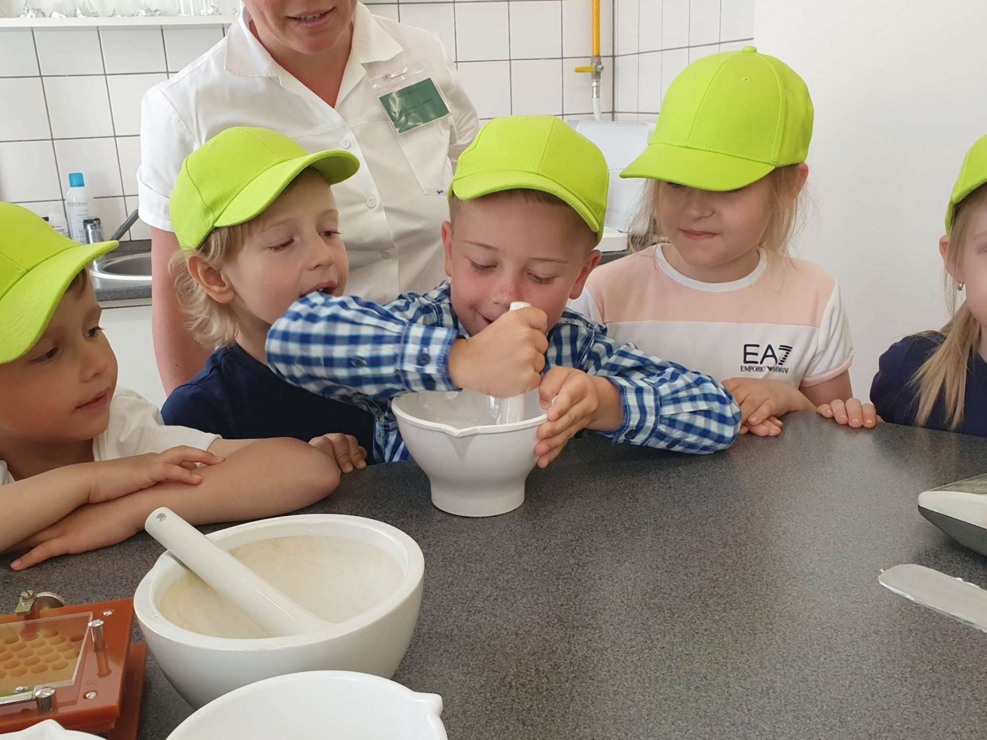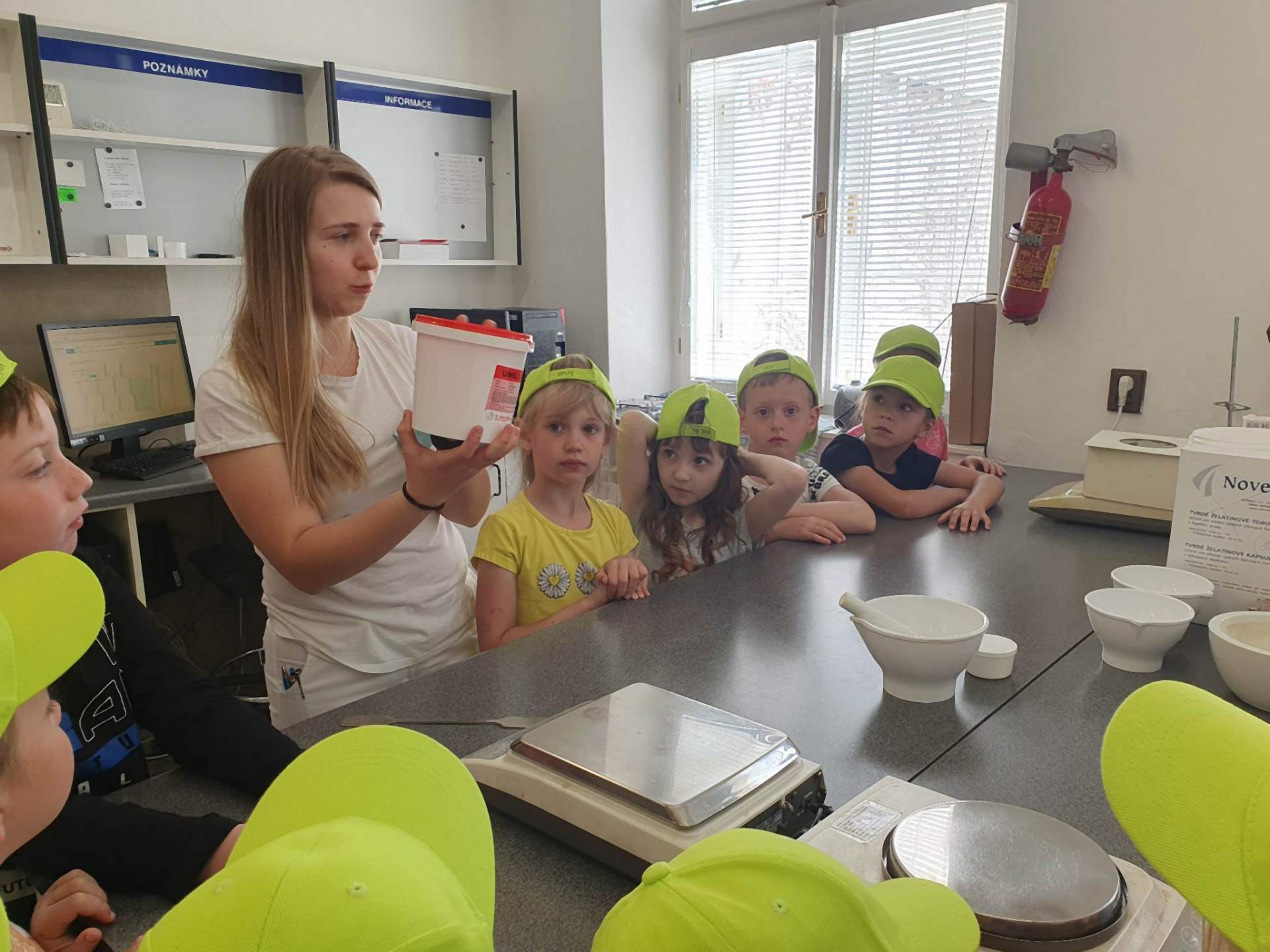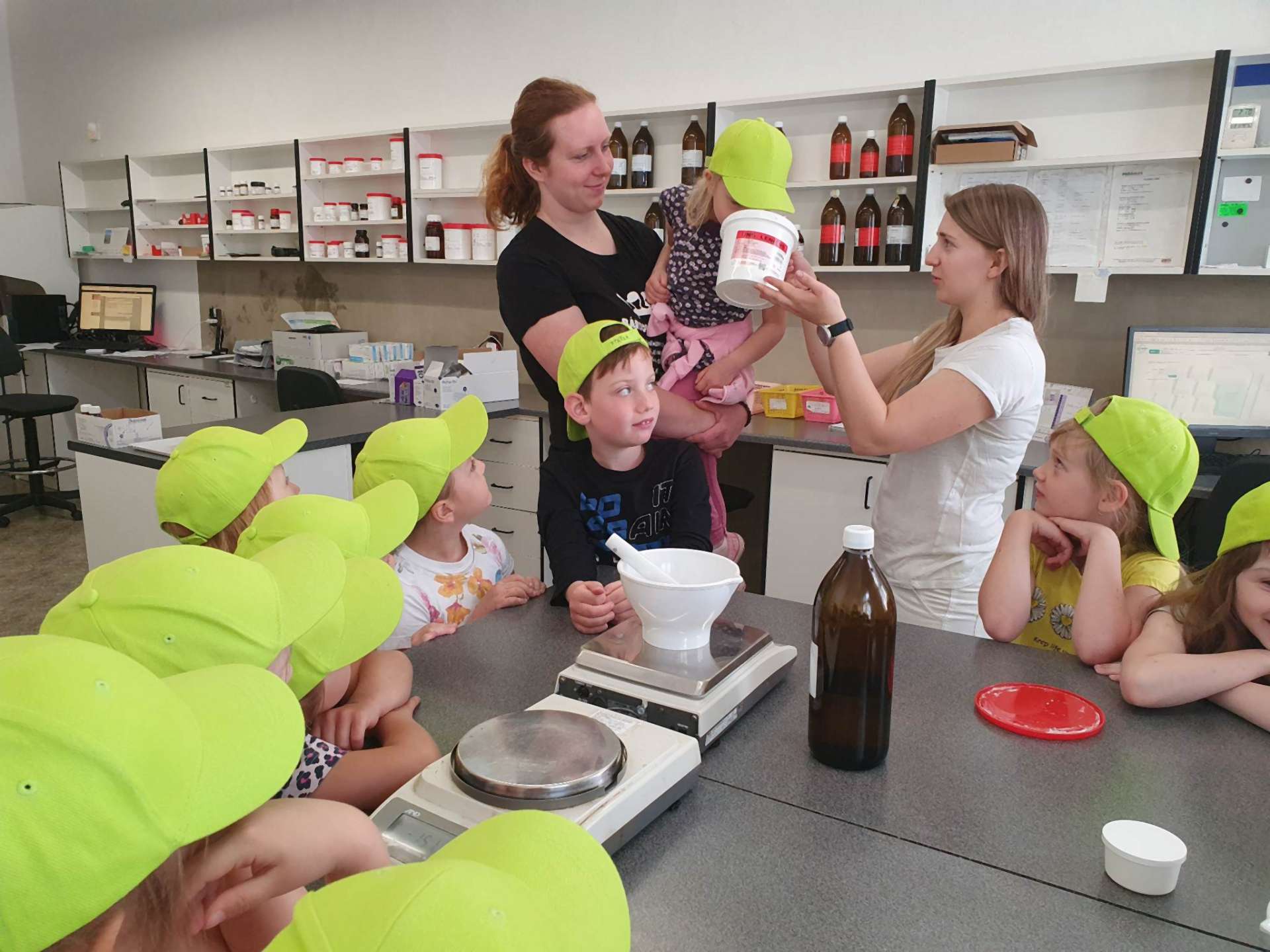 Byli jsme se podívat, jak se vyrábí léky. V lékárně nás přivítaly milé paní magistry a odvedly si nás přes táru až úplně dozadu, kde mají svou laboratoř, která je nám, obyčejným smrtelníkům, obyčejně nepřístupná. Dnes to byla ale výjimka. Dozvěděli jsme se, co všechno se zde dá dělat, vyrobili jsme si vlastní krém na ruce, i cukrové pilulky, přivoněli si k různým lékárnickým ingrediencím. Po exkurzi jsme si zašli na jednu točenou a hurá zpátky do naší školky.