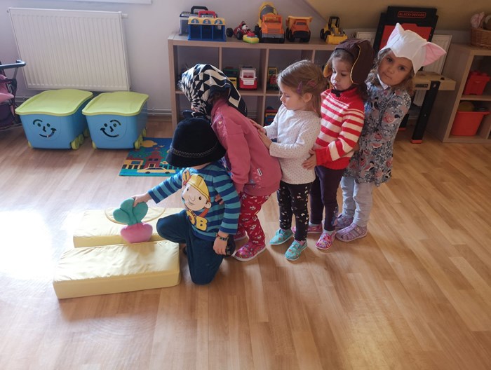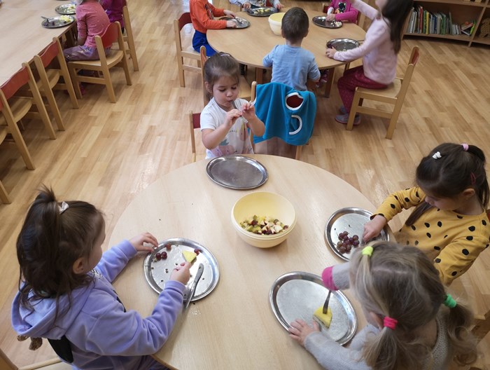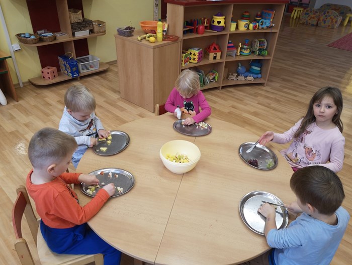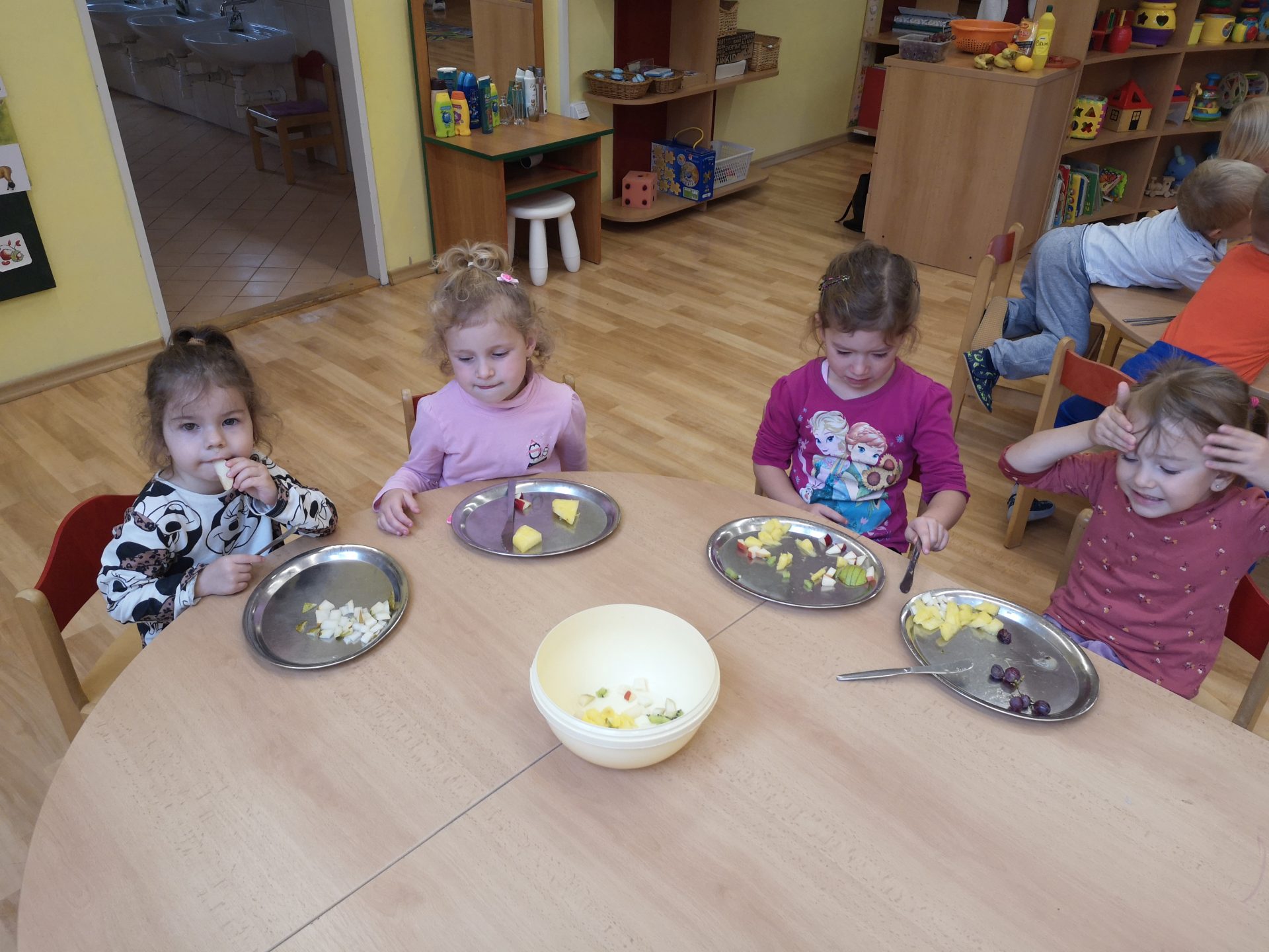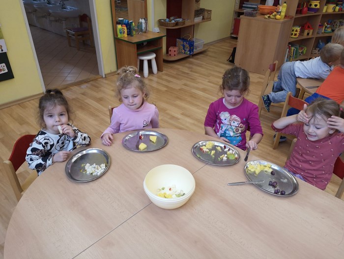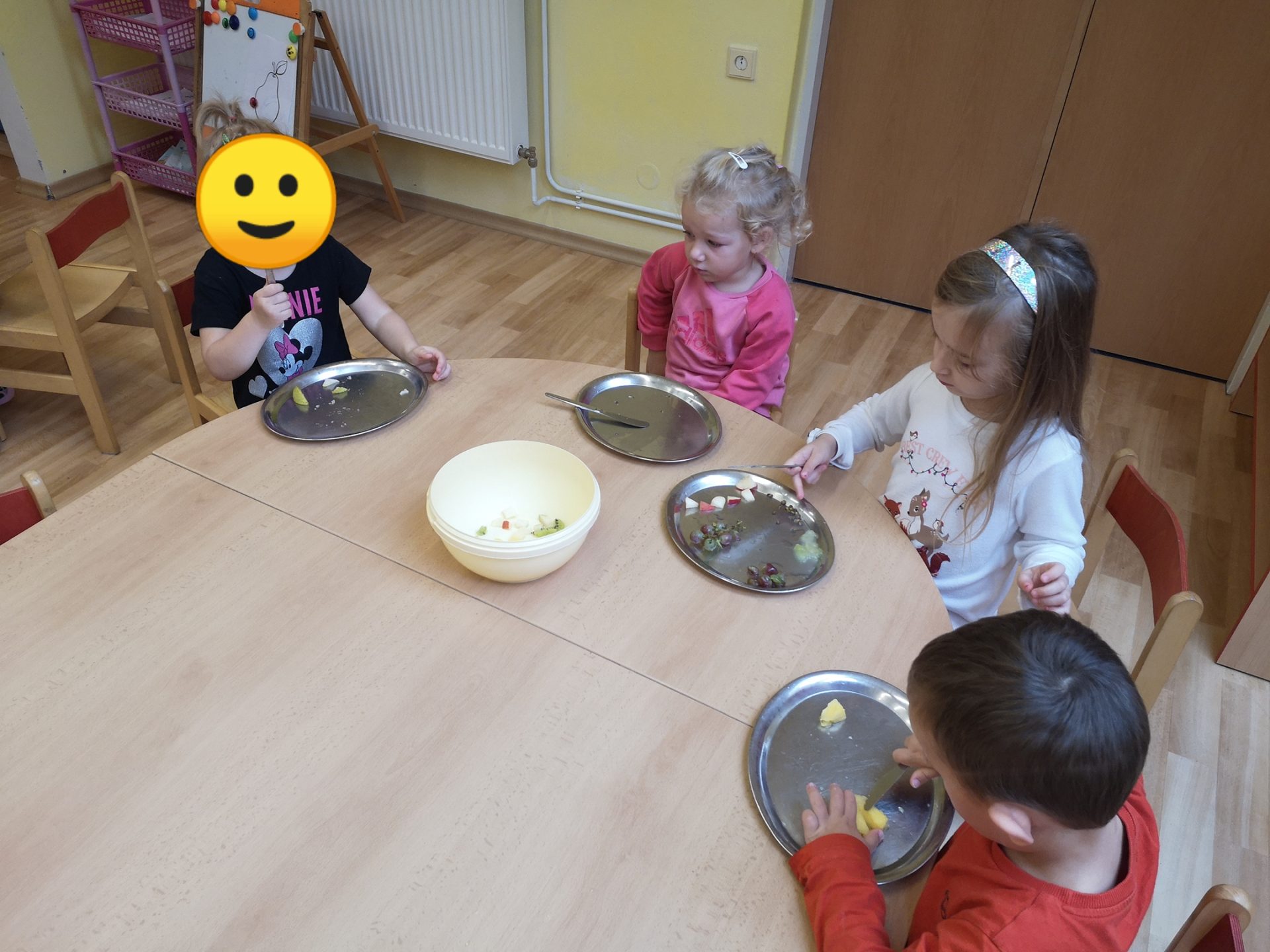 Jeden říjnový týden jsme se s dětmi ze třídy Kuřátek věnovali ovoci a zelenině z našich zahrádek, přičemž jsme si také zahráli pohádku O veliké řepě a připravili si k obědu ovocný salát. Děti to velmi bavilo a byly moc šikovné!
