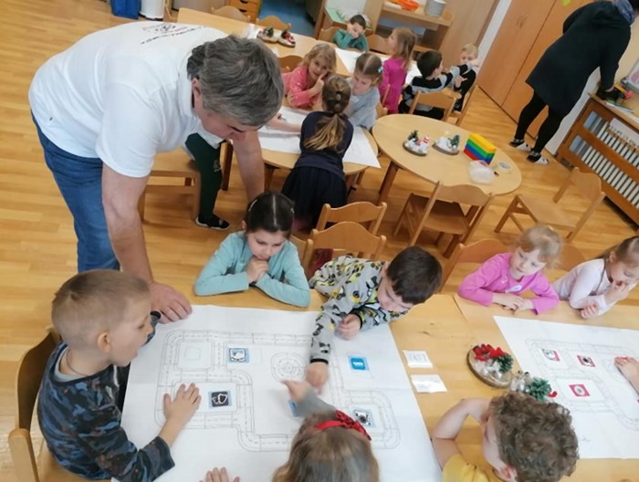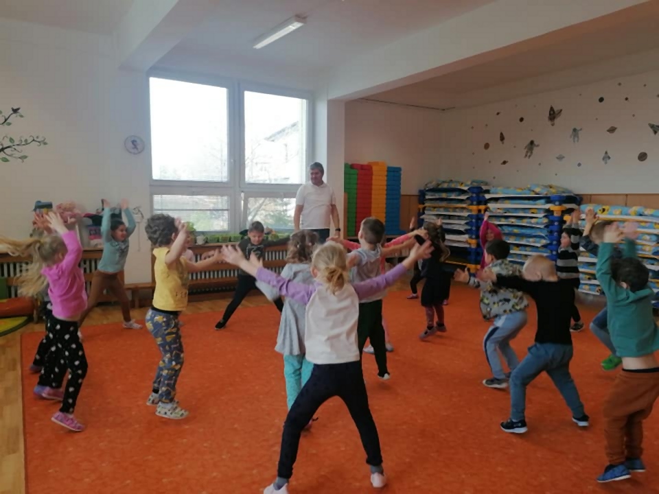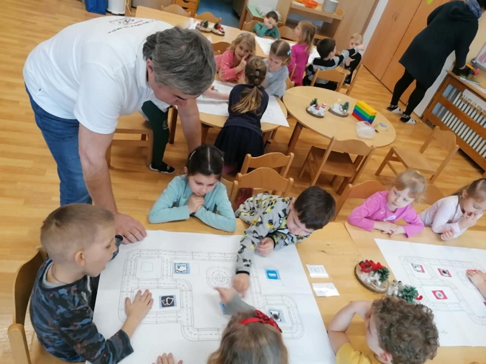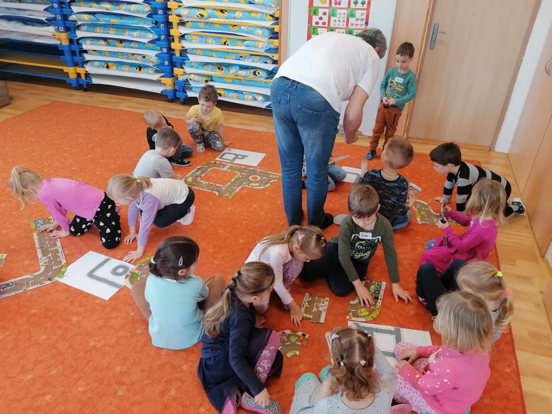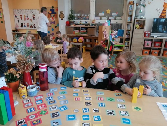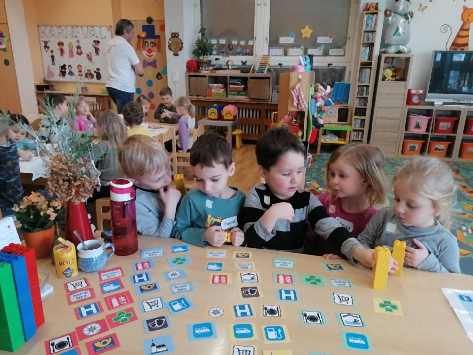 V průběhu projektového dne hrazeného ze šablon poznávaly děti města a obce, stavby ve městě a jejich využití. Děti byly v roli kartografa, rozeznávaly mapové značky. Pracovaly s různými druhy map, ve kterých se učily orientovat, tvořily vlastní mapu z velkých puzzlí, lega i papíru. Nechyběl ani pohyb, díky kterému si děti vydělaly kostičky, „nakupovaly“ a podle pokynů lektora Honzy pracovaly na své mapě.