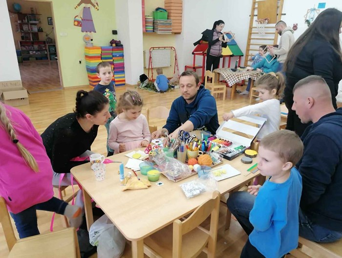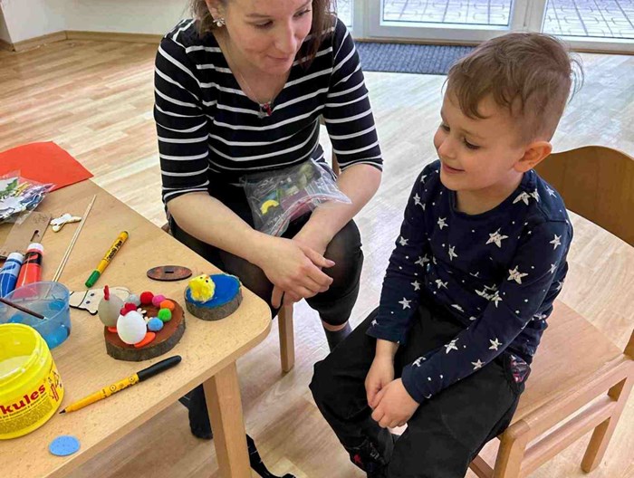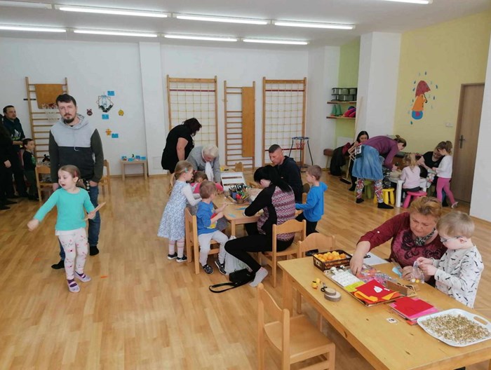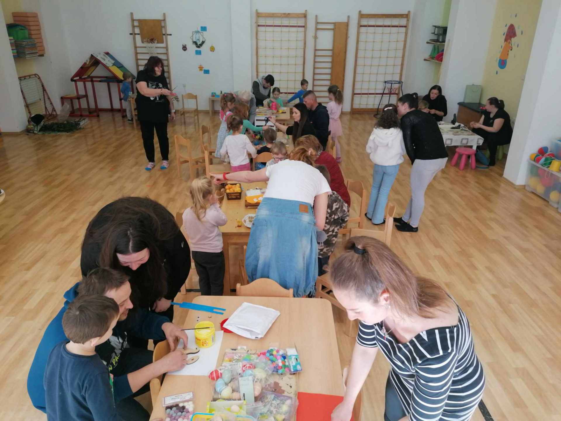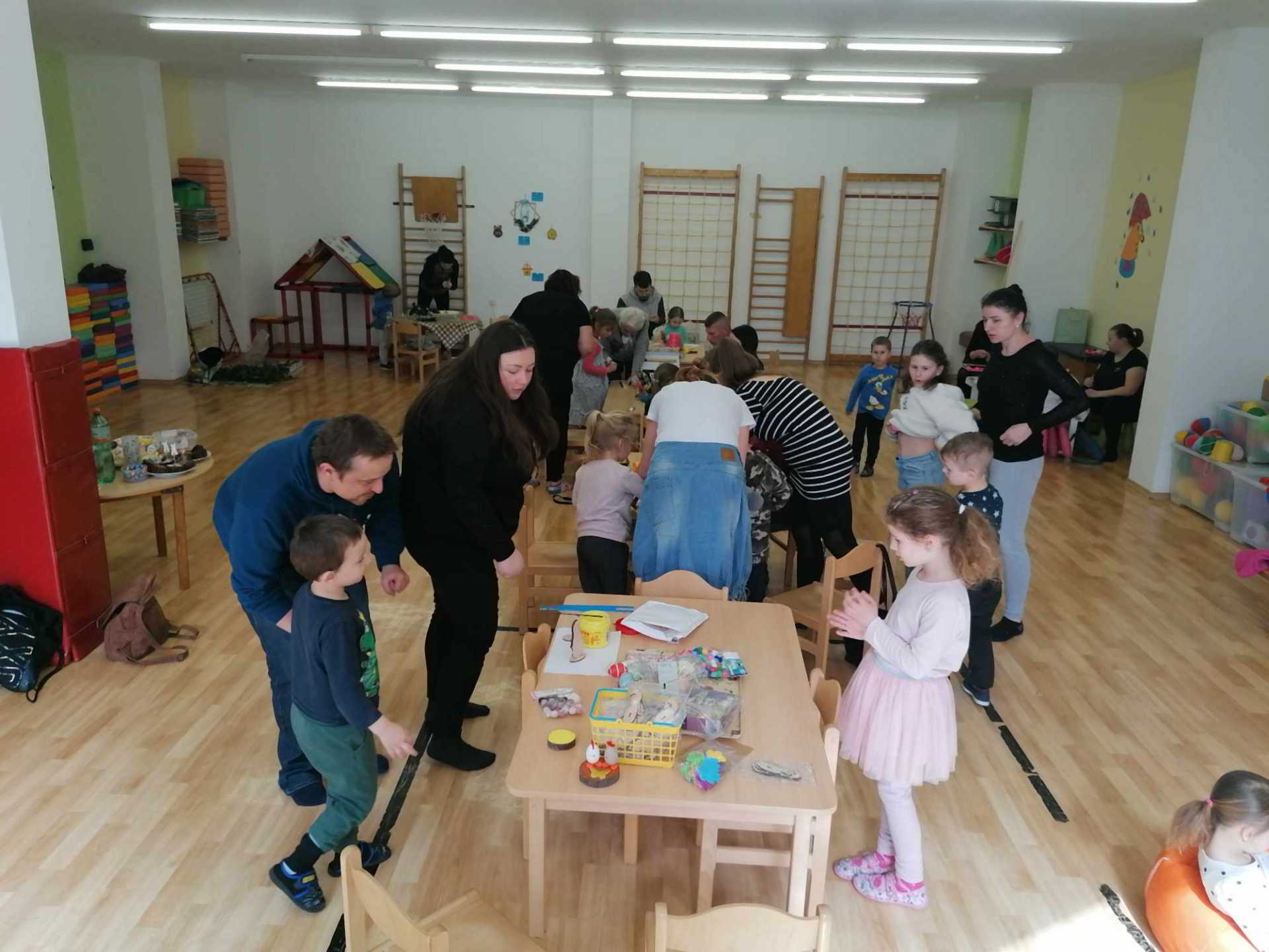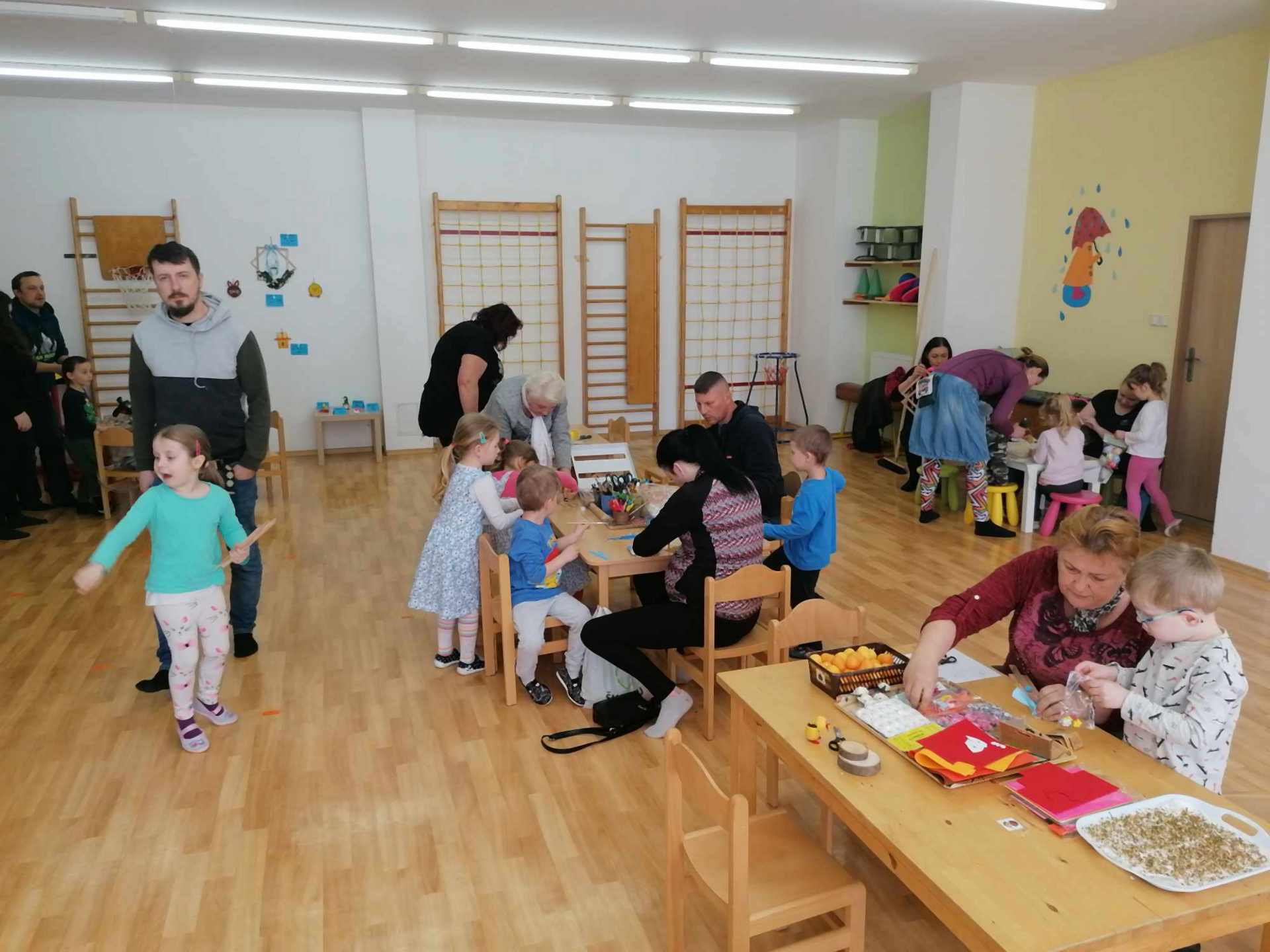 Tělocvična ve školce se proměnila ve velikonoční dílnu – děti spolu s rodiči vyráběly velikonoční dekorace, zajíčky, kuřátka, zápichy i trpaslíky. Nechybělo ani výborné občerstvení.