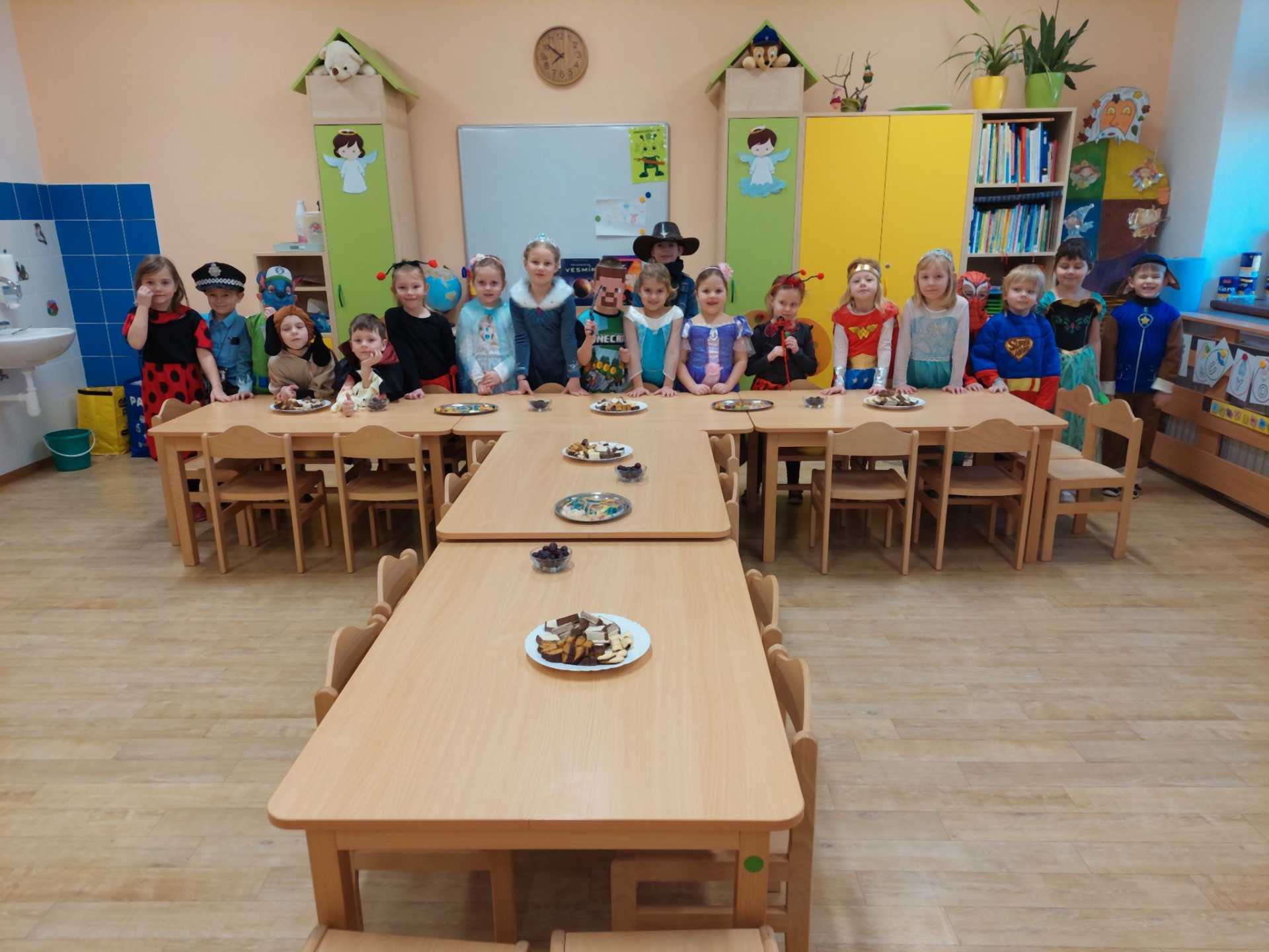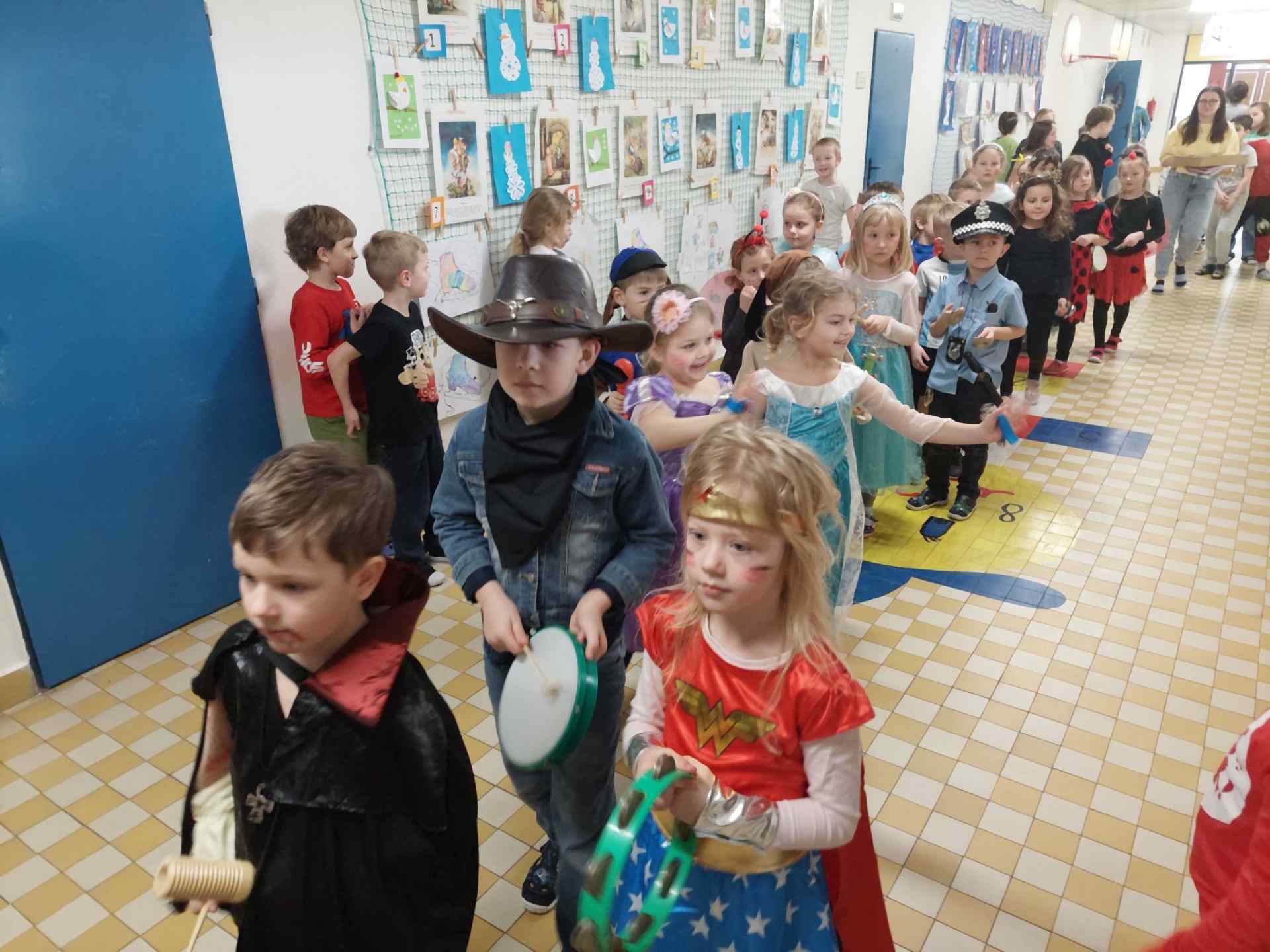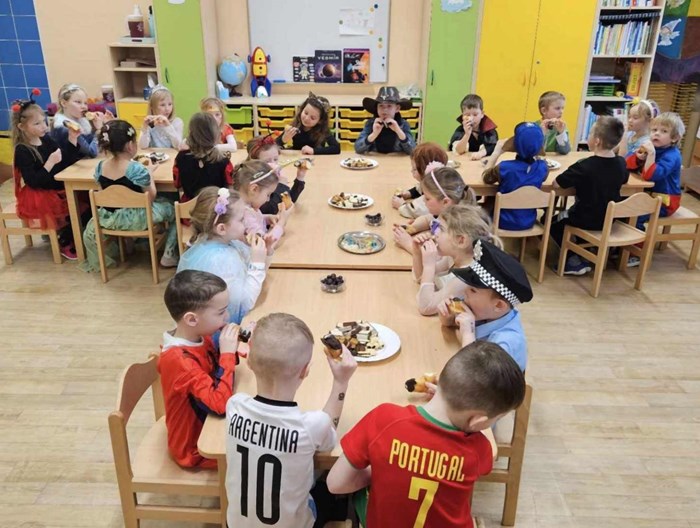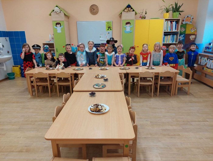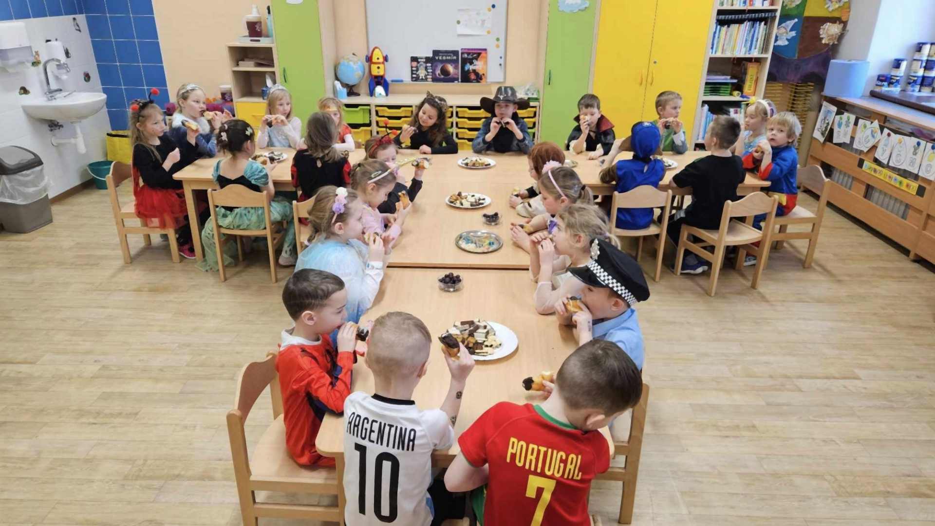 Děti ze třídy Soviček se dnes vydaly na masopustní průvod do základní školy, kde navštívily své kamarády v první třídě. V barevných karnevalových maskách se prošly školními chodbami a přinesly radost a veselí nejen prvňáčkům, ale i všem dětem, které je nadšeně vítaly. Smích a hudba provázely celý průvod a školní atmosféra se na chvíli proměnila v masopustní rej. Po návratu do školky si děti užily hostinu plnou dobrot. Nechyběly tradiční masopustní koblížky, které si s chutí vychutnaly spolu s dalšími lahůdkami. Děkujeme SRPŠ za příspěvek na koblížky, které dětem zpříjemnily tento sváteční den.