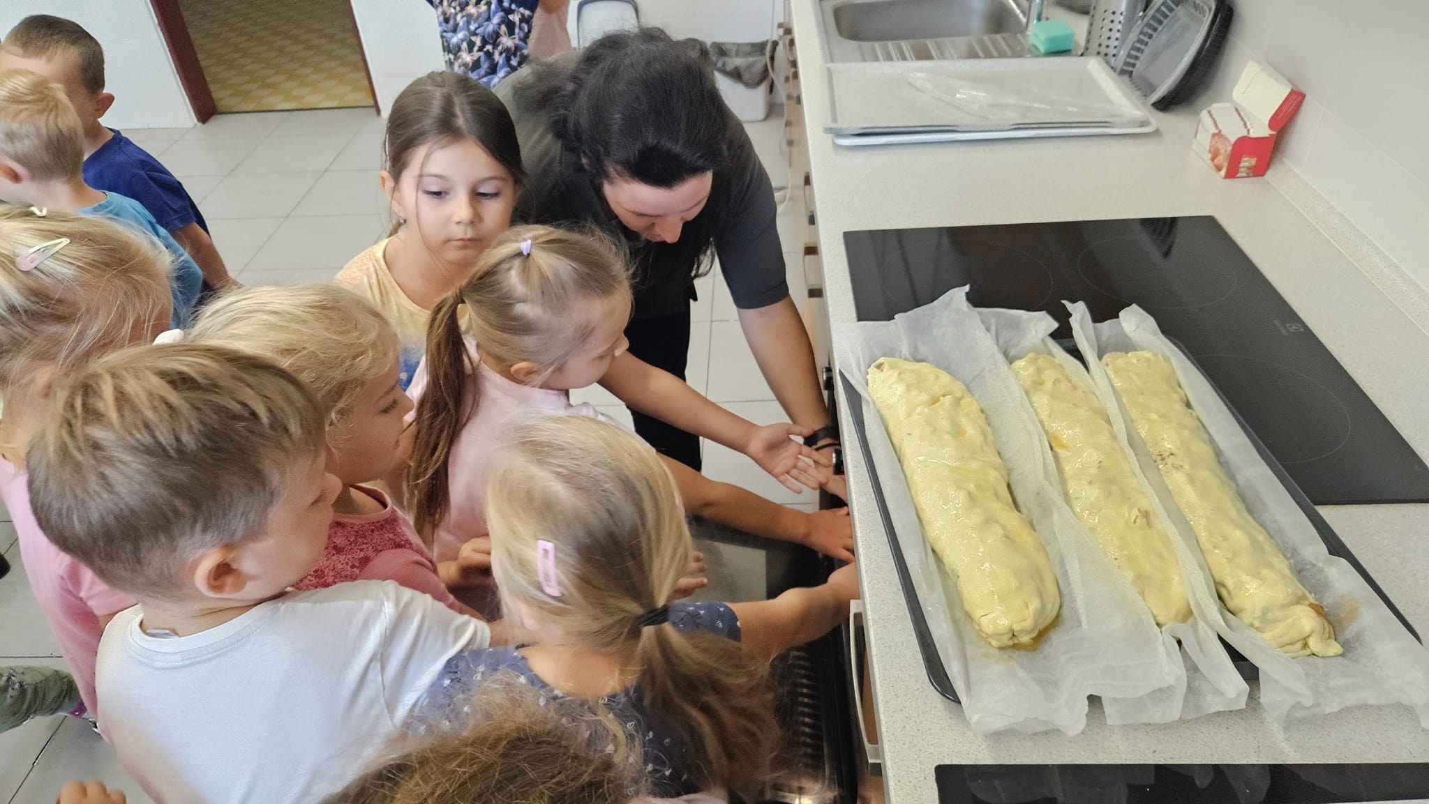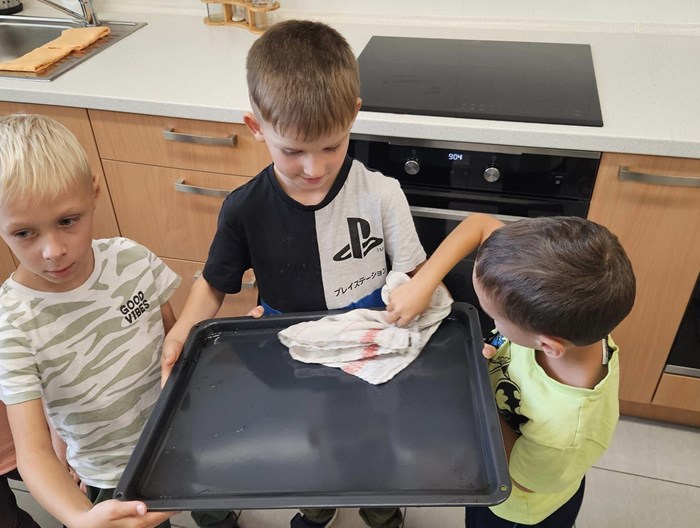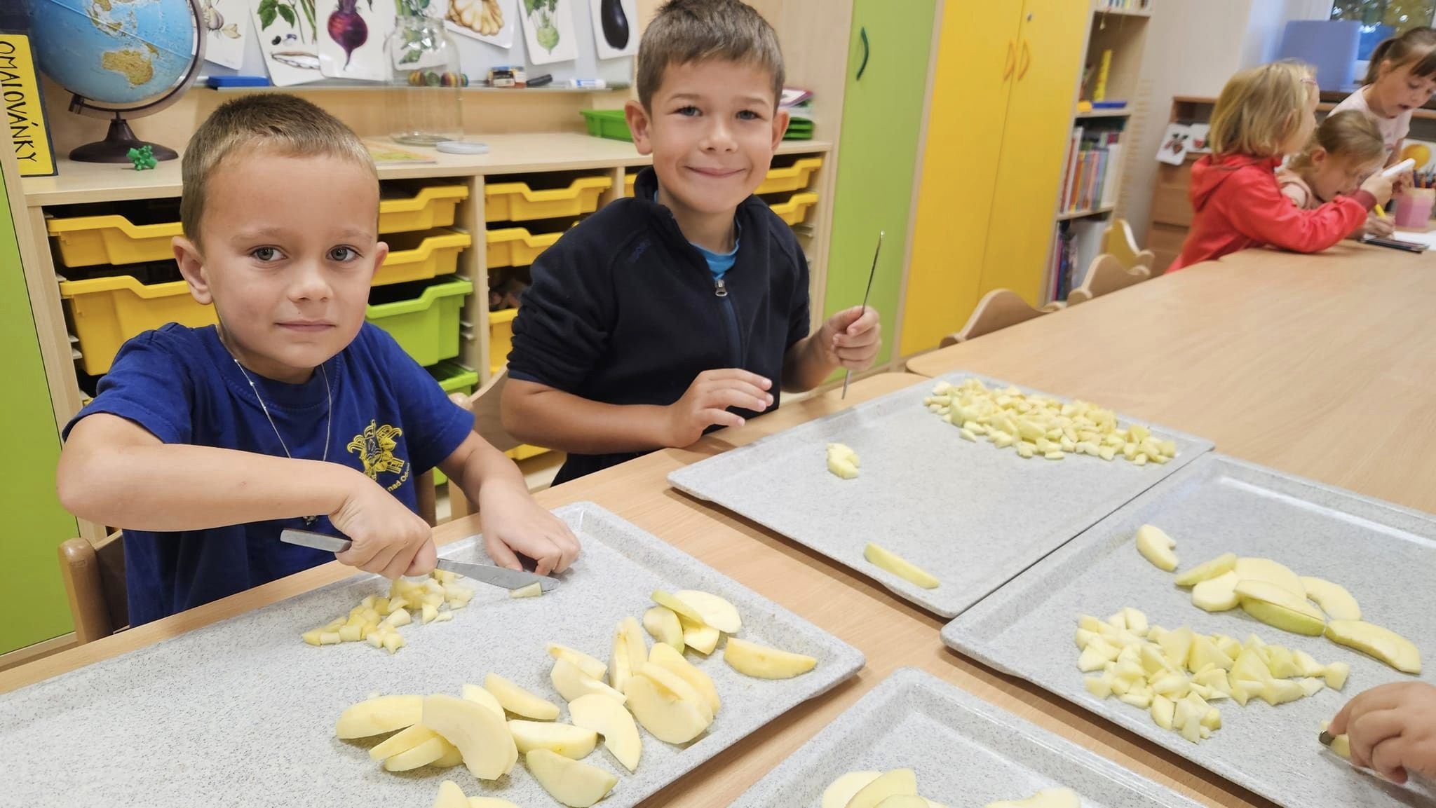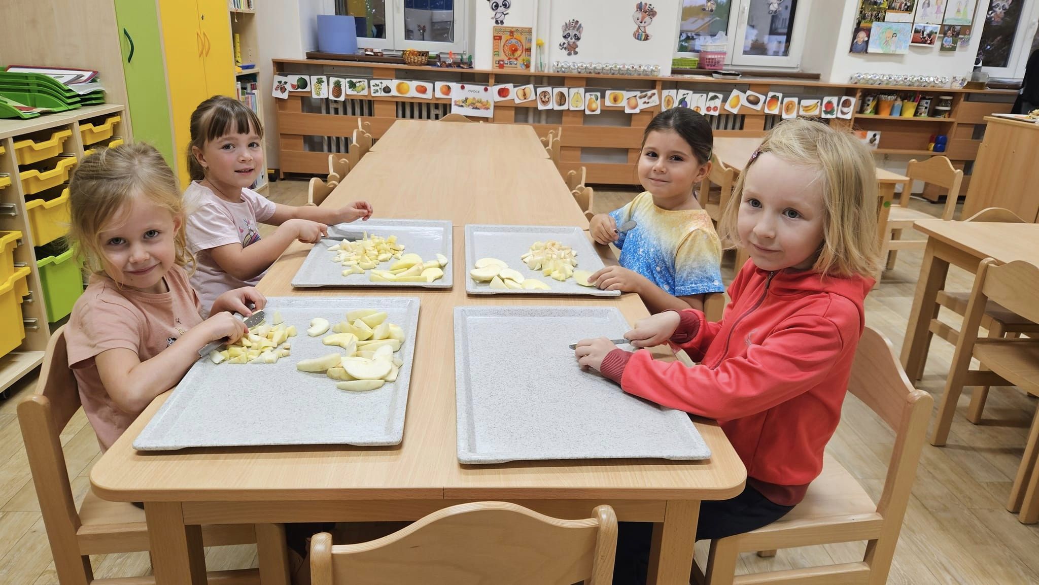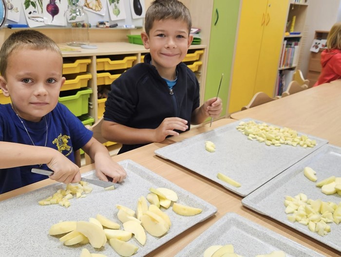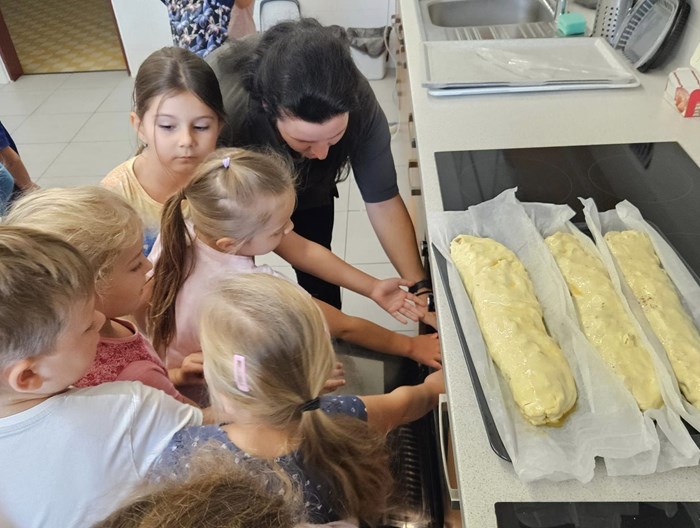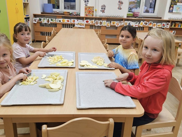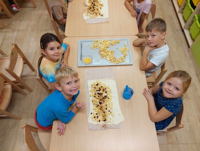 Celý týden si povídáme o tom, jaké vitamíny se mohou skrývat v košíku. Léto i podzim nám přinášejí mnoho úrody a tak jsme se ji rozhodli využít. Děti si donesly jablíčka, samy si je nakrájely, ve skupinkách rozprostřely na těsto, posypaly skořicí, cukrem a rozinkami. Těsto zabalily, pomazaly vajíčkem a v troubě se nám upekly nádherné štrůdly, na kterých si děti mooooc pochutnaly.