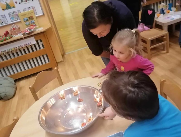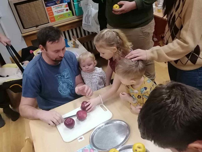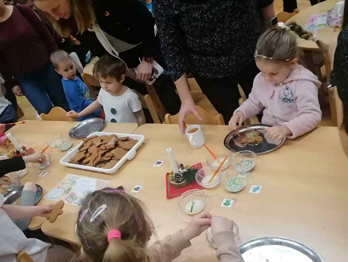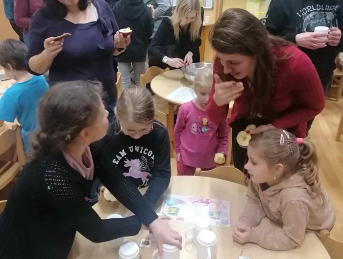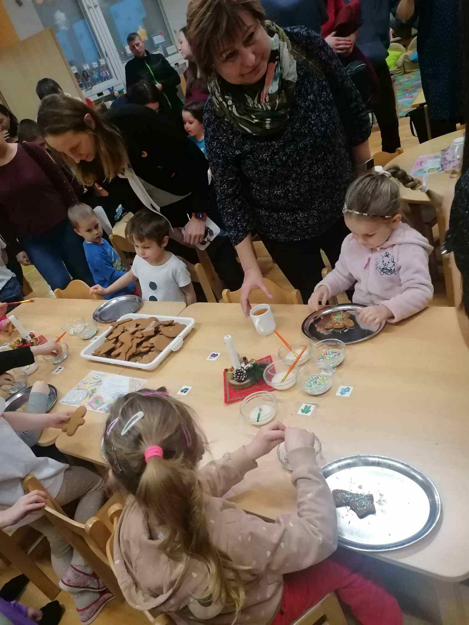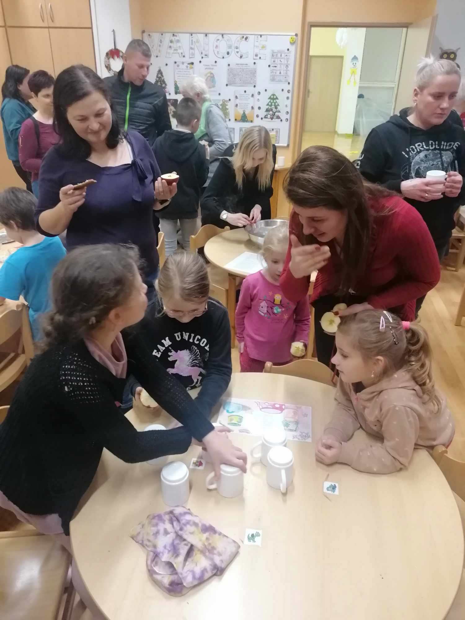 Po vystoupení přišla chvíle na společné setkání s rodiči. Na děti i dospělé čekal tradiční vánoční punč. Společně jsme se mohli seznámit s tradičními českými zvyky- zapálení Františka, svazování nohou od stolu, věštění pomocí hrníčků. Velký úspěch mělo pouštění lodiček z ořechových skořápek – děti napjatě sledovaly, jak jejich lodičky plují, a rodiče jim mohli přečíst, co to pro ně znamená. Nechybělo ani krájení jablíčka, které prozradilo, zda se objeví hvězdička, symbol štěstí a zdraví. Rodiče i děti se zapojili také do zdobení perníčků, což přineslo zároveň sladkou odměnu.