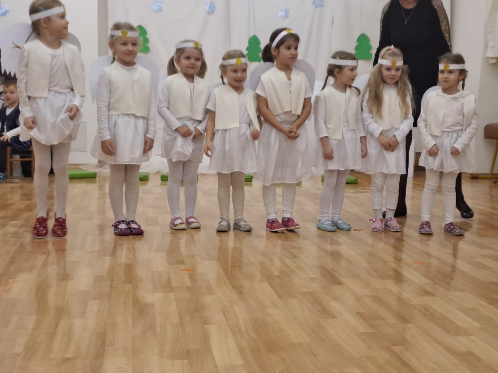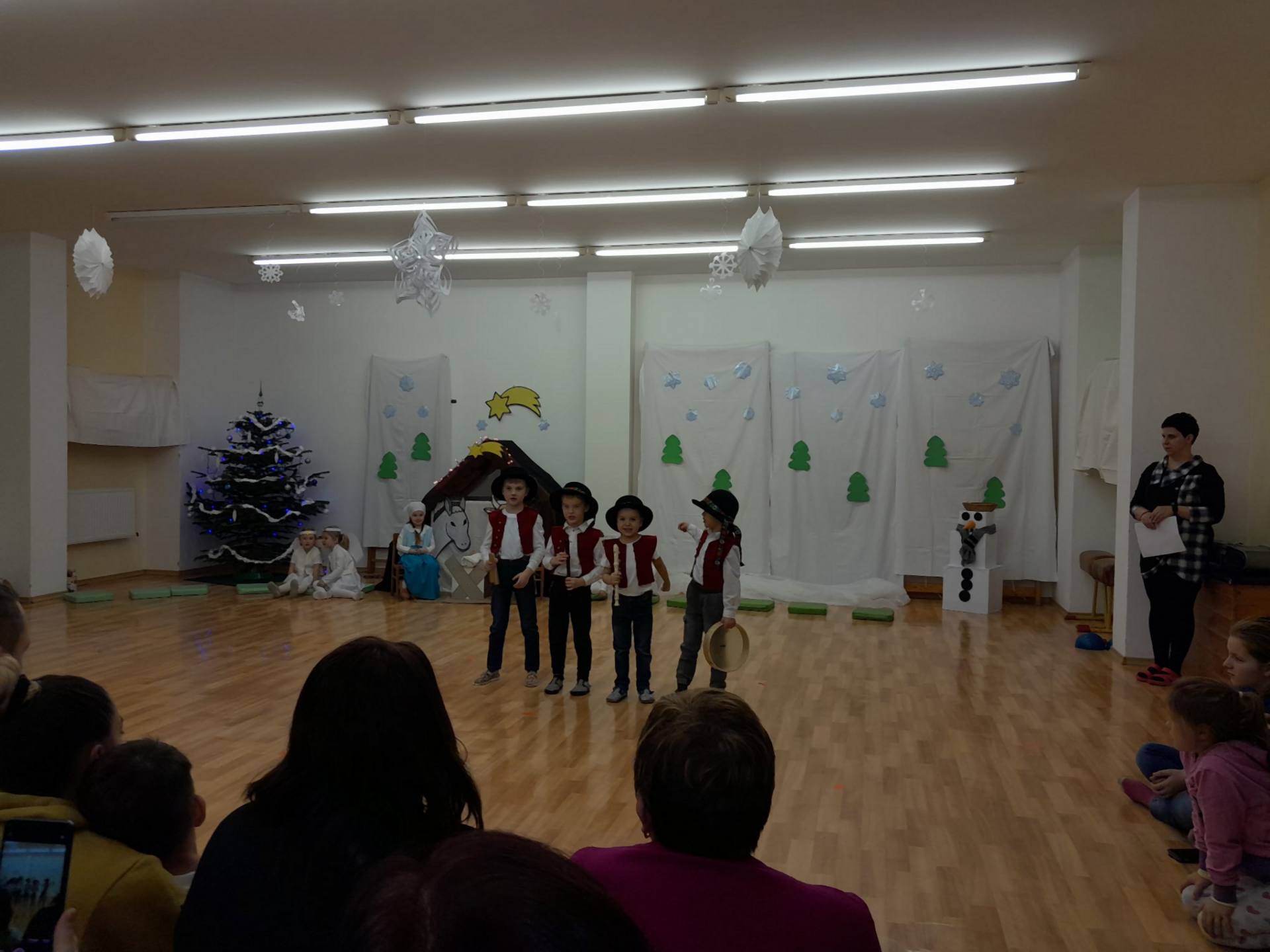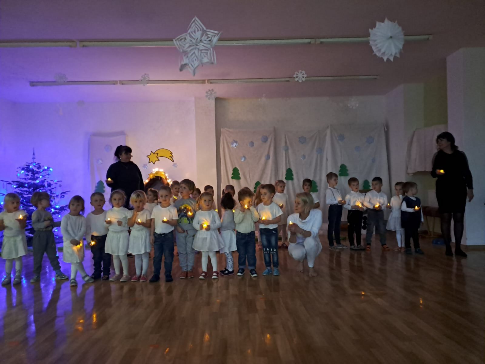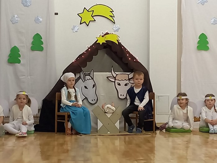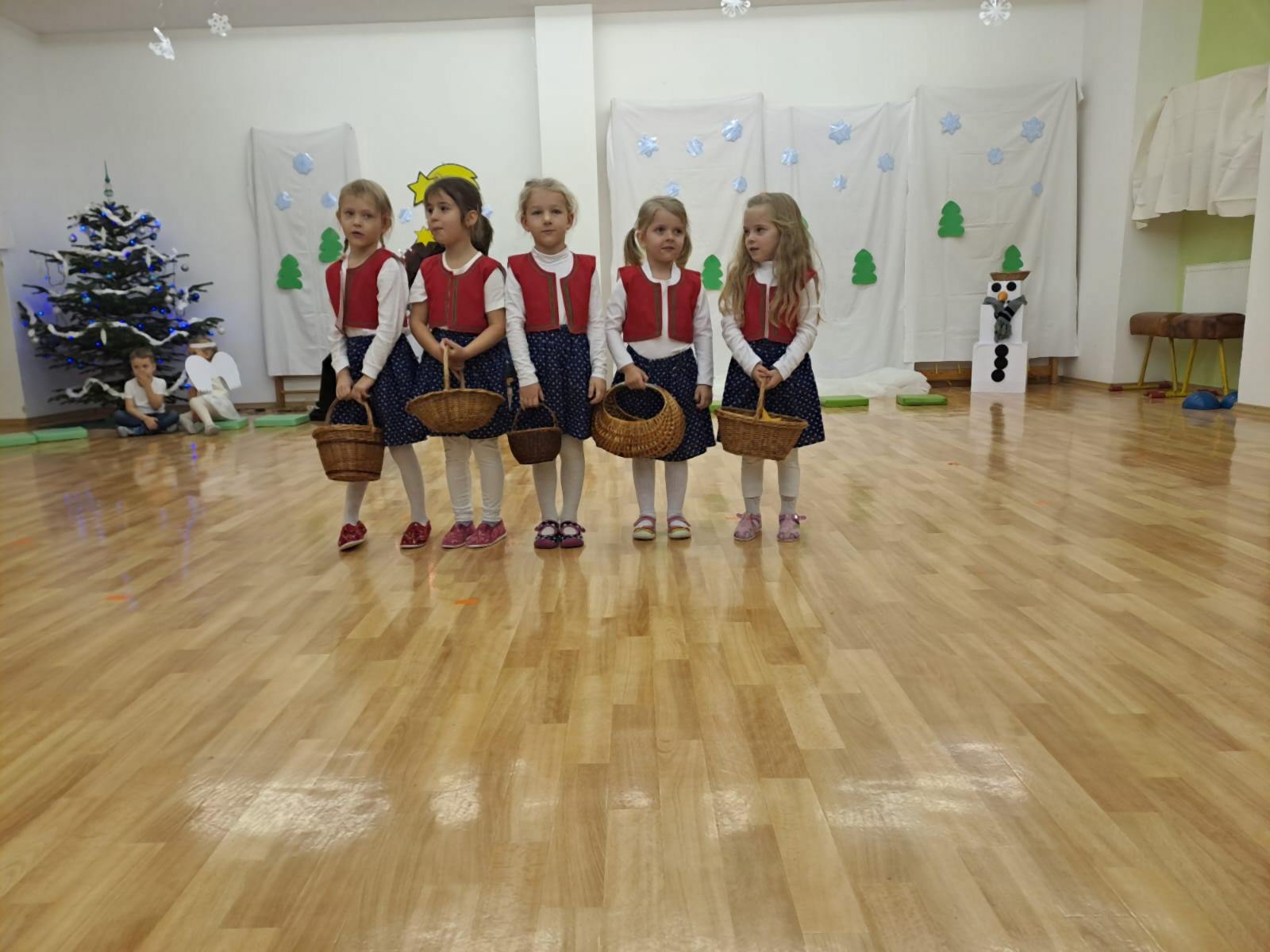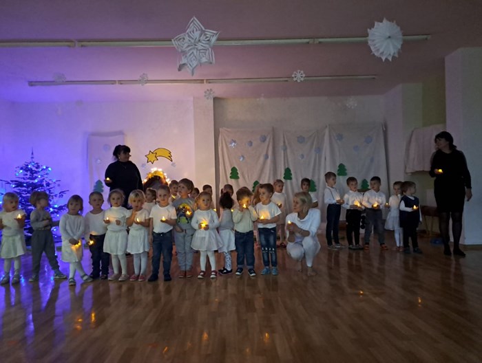 Ve středu 11. 12. 2024 odpoledne jsme se všichni sešli společně s rodiči v tělocvičně MŠ, abychom si zpříjemnili vánoční atmosféru vystoupením dětí třídy Broučků a Kuřátek. Nejprve jsme se společně přenesli s dětmi třídy Kuřátek do období zimních radovánek a prostřednictvím vánočního příběhu ztvárněného dětmi třídy Broučků také do Betléma. V závěru společného vystoupení jsme se světýlky v ruce při písničce vyslovili společné jedno přání – Prosím vás, mějte se všichni rádi.