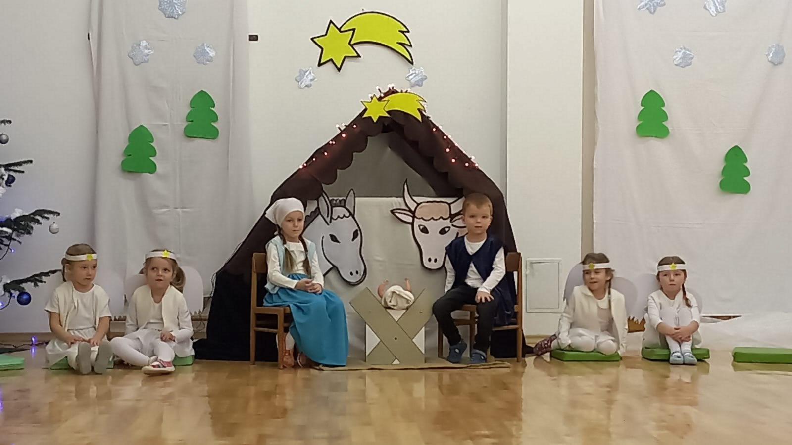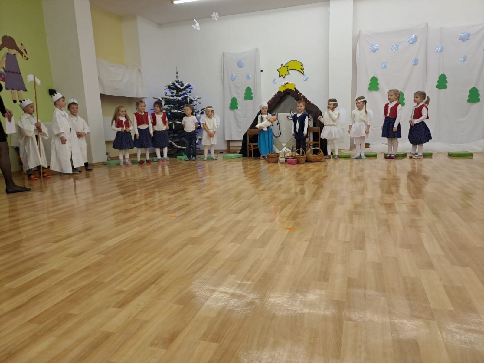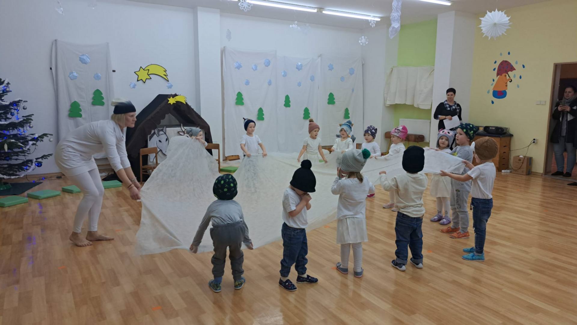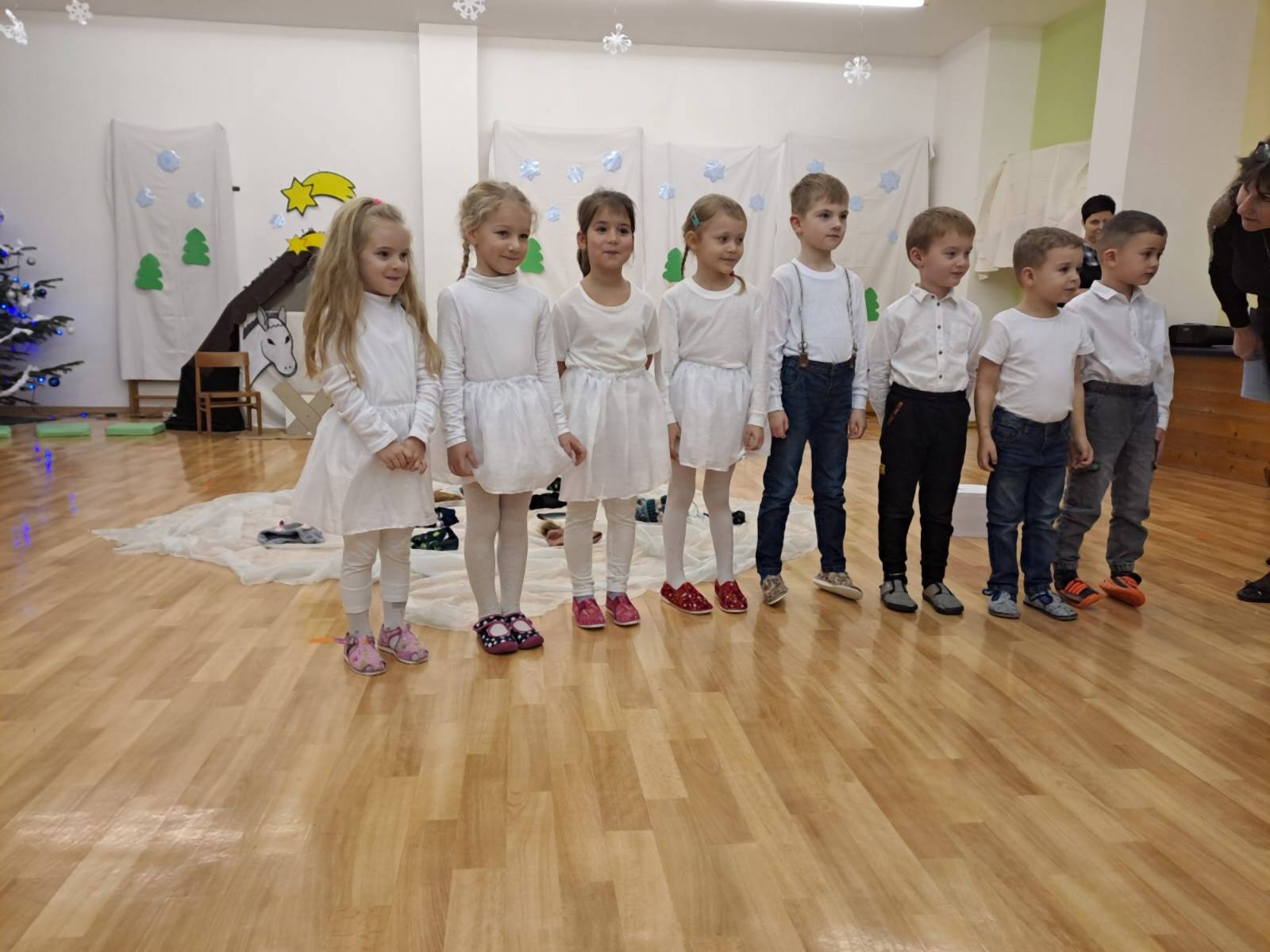 Ve středu 11. 12. 2024 odpoledne jsme se všichni sešli společně s rodiči v tělocvičně MŠ, abychom si zpříjemnili vánoční atmosféru vystoupením dětí třídy Broučků a Kuřátek. Nejprve jsme se společně přenesli s dětmi třídy Kuřátek do období zimních radovánek a prostřednictvím vánočního příběhu ztvárněného dětmi třídy Broučků také do Betléma. V závěru společného vystoupení jsme se světýlky v ruce při písničce vyslovili společné jedno přání – Prosím vás, mějte se všichni rádi.
