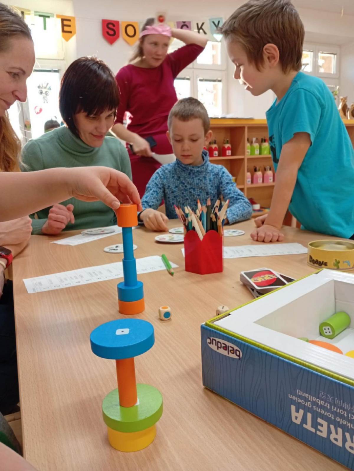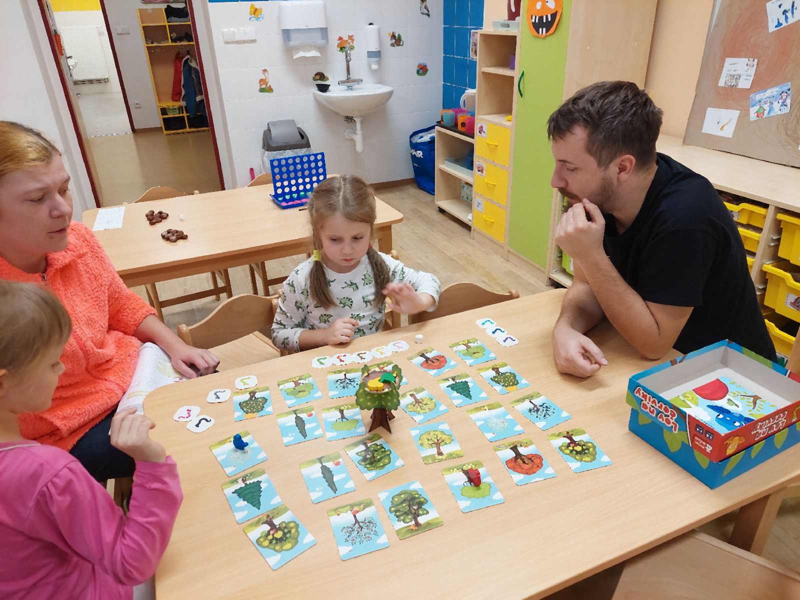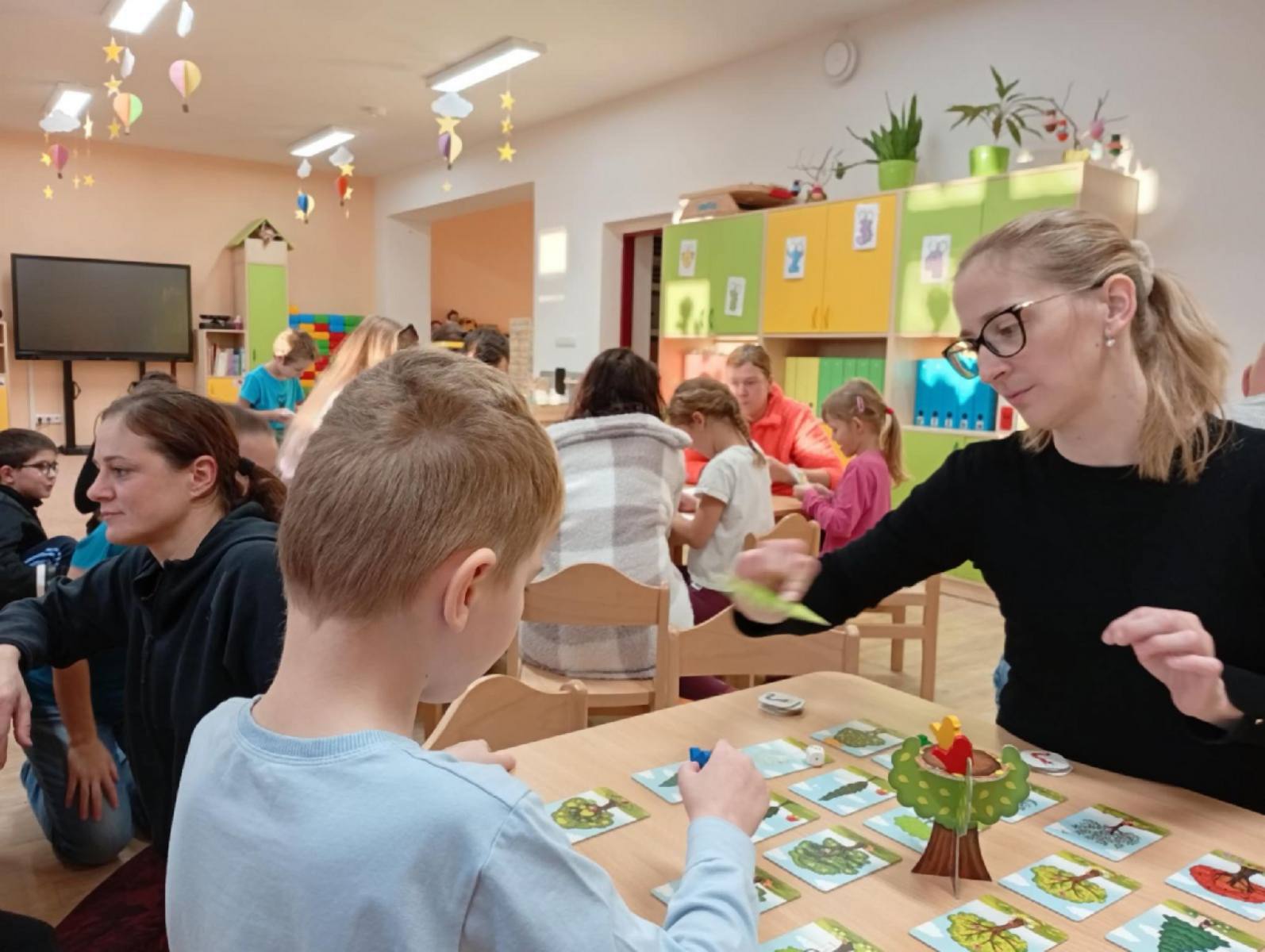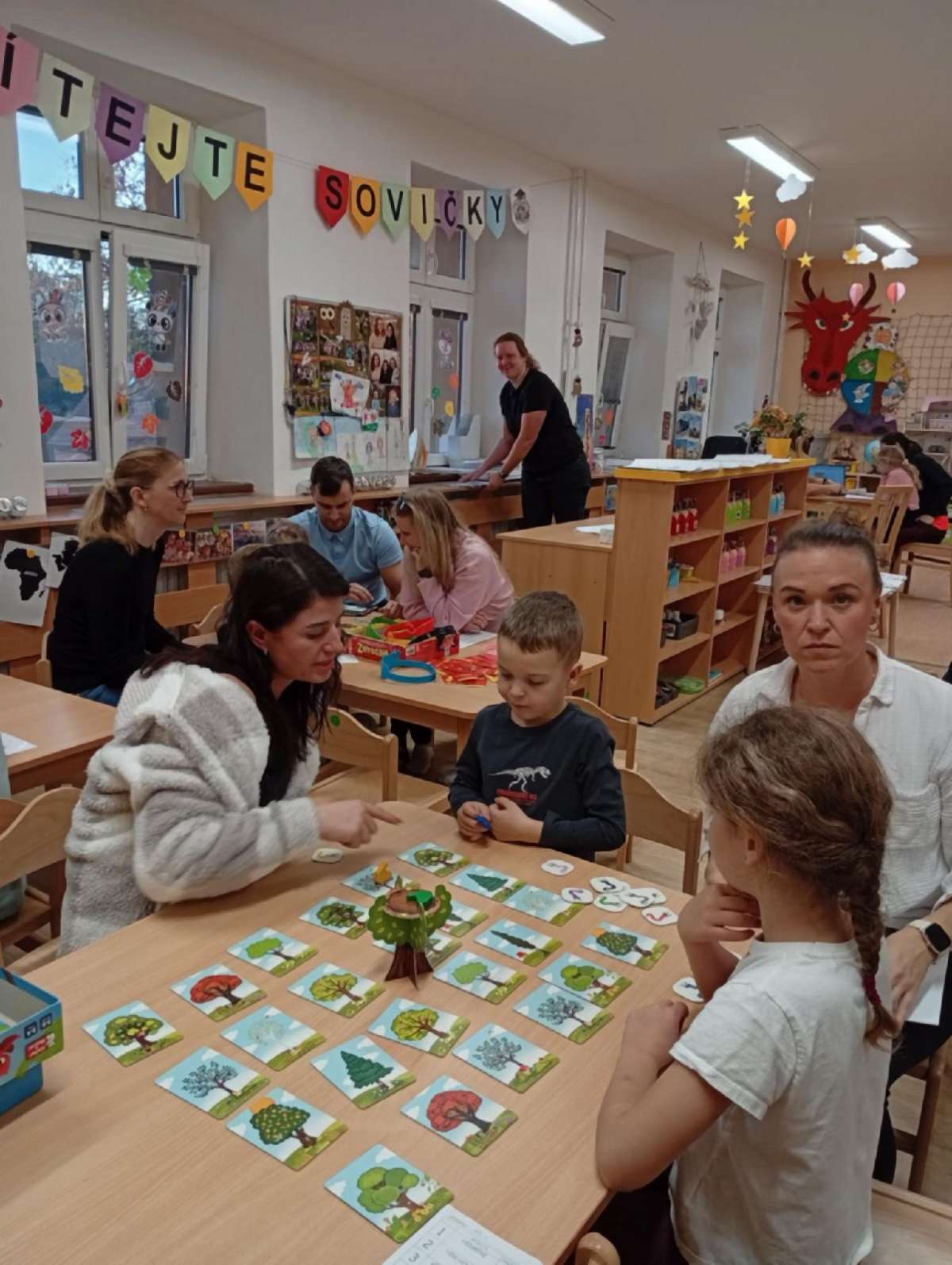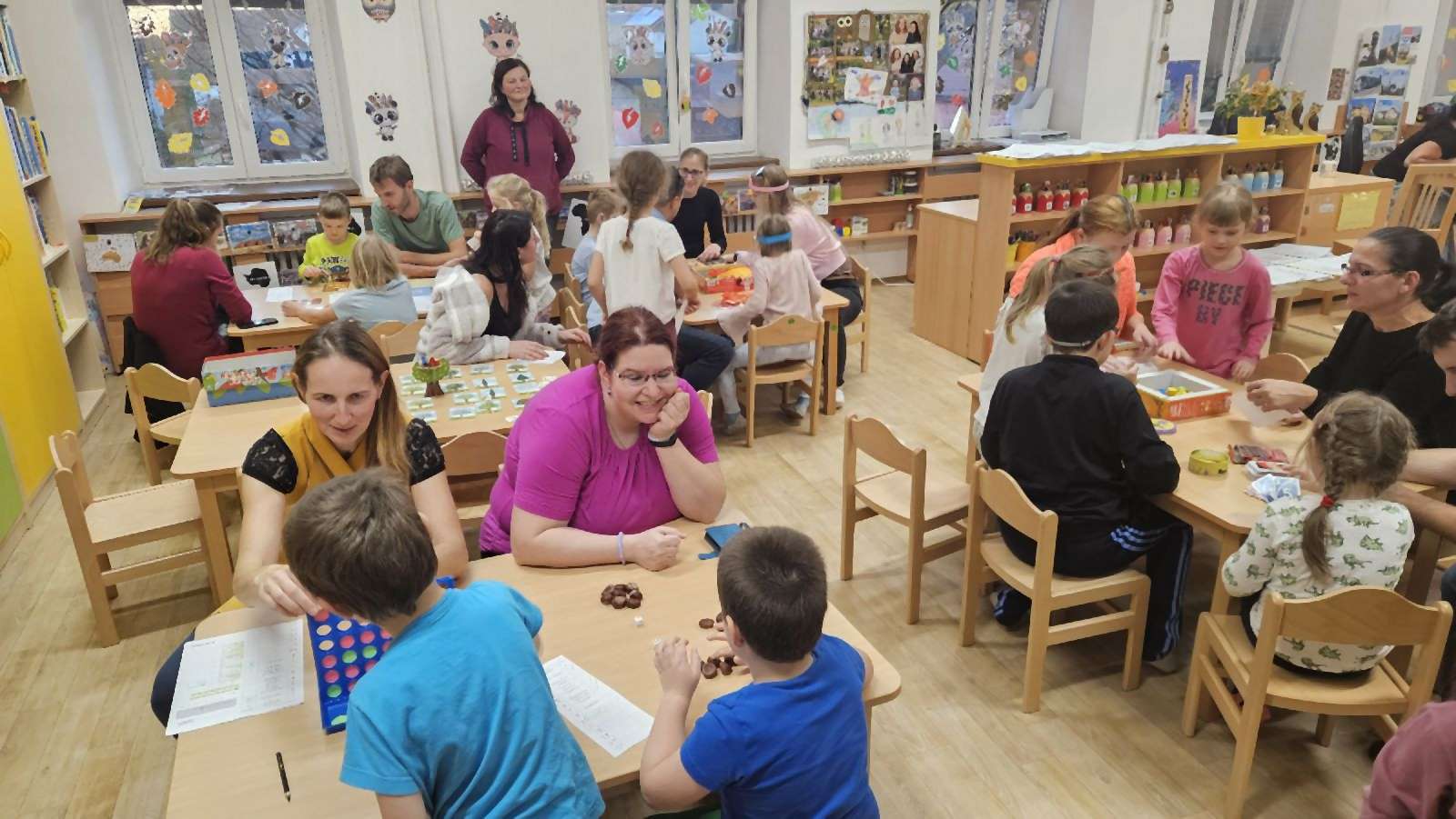 Ve čtvrtek se třída Soviček proměnila v herní království plné smíchu, napětí a radosti ze společně prožitého odpoledne. Děti se svými rodiči usedly ke stolům, kde na ně čekaly oblíbené deskové hry. Každý si mohl vybrat tu svou, někdo sáhl po Uno, jiný po Hedbenz, Příšerkách ze skříně, Lovu na červíky nebo třeba po Torrettě. Nechyběly ani další oblíbené hry, které děti dobře znají z každodenních aktivit ve školce.