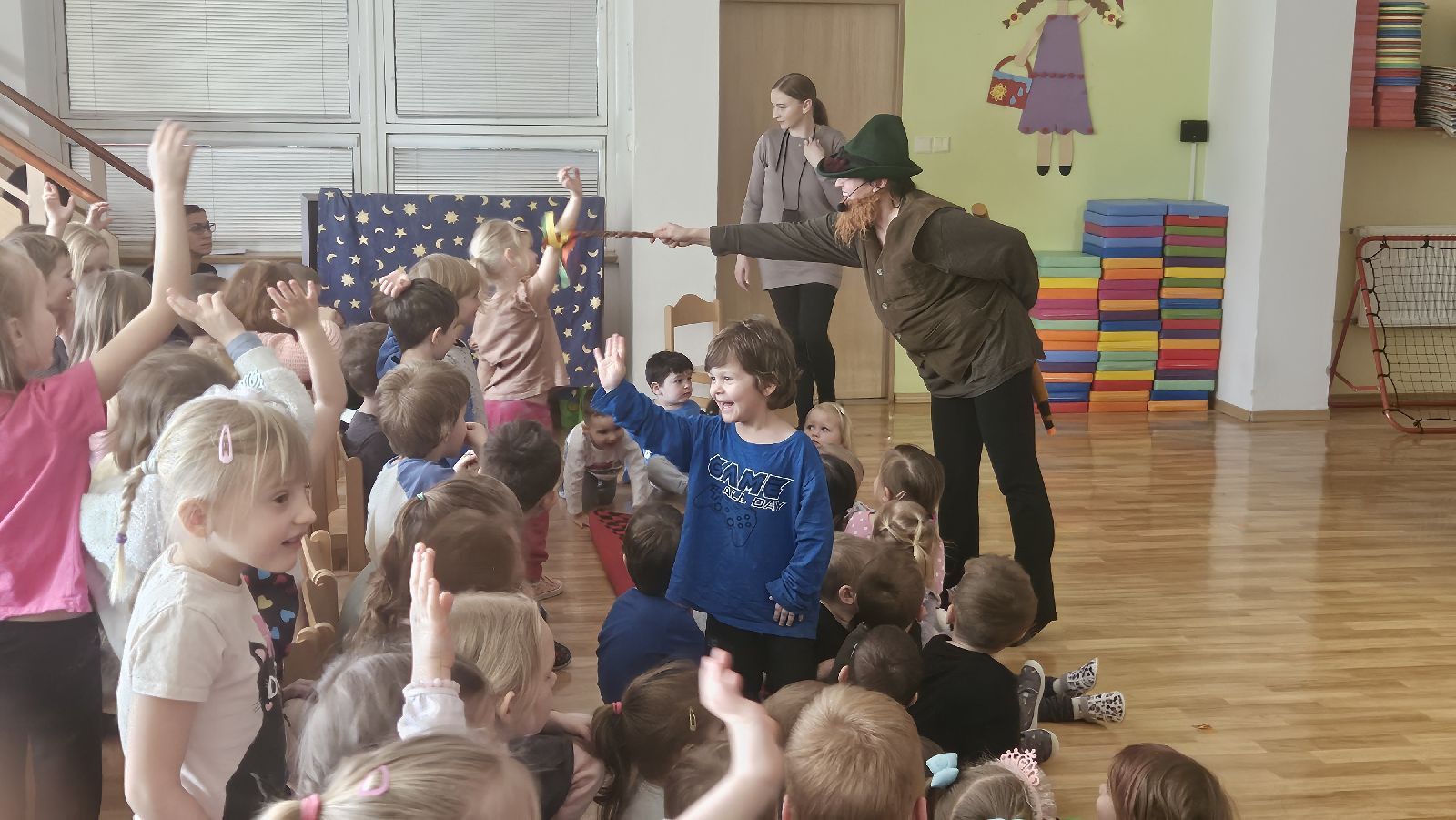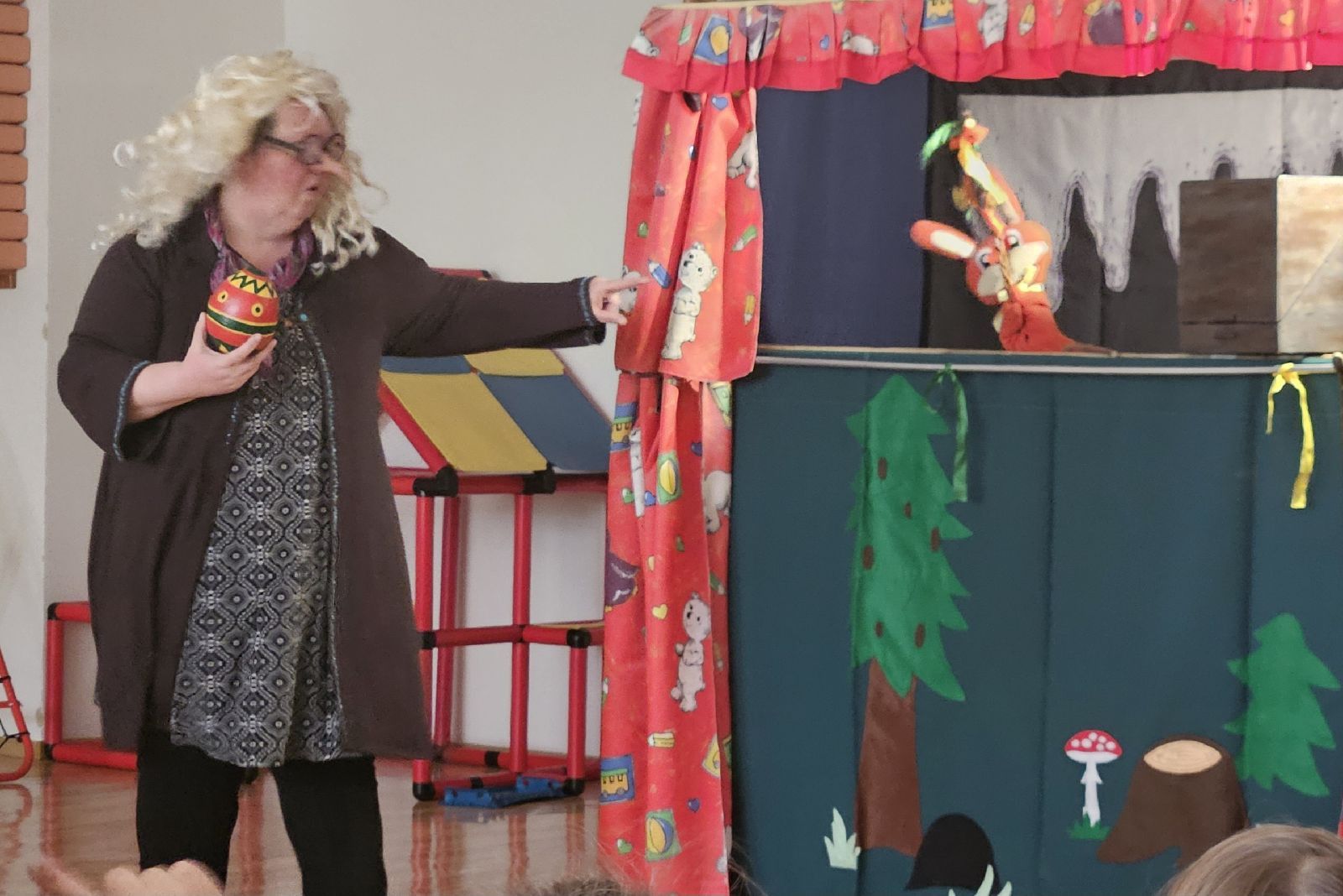 Děti z MŠ viděly pohádku o ježibabě Kolomajzně, která vlastnila kouzelnou skřínku, která jí přičarovala všechno, co chtěla. Když v lese potkala pohledného myslivce, pomyslela si, že by bylo hezké oslavit s ním Velikonoce. Protože, ale byla špinavá a nemyla se, neměla moc šancí na úspěch. Proto s kamarádem kosem poprosila skřínku o hygienické přípravky a postupně se z ní stala docela hezká babička a myslivec za ní rád na Velikonoce přišel.