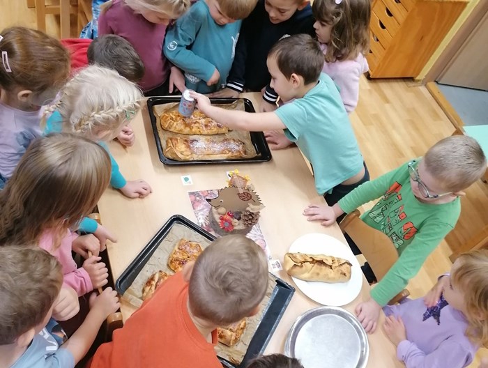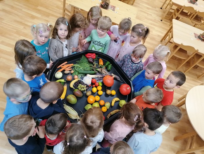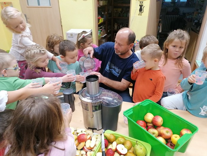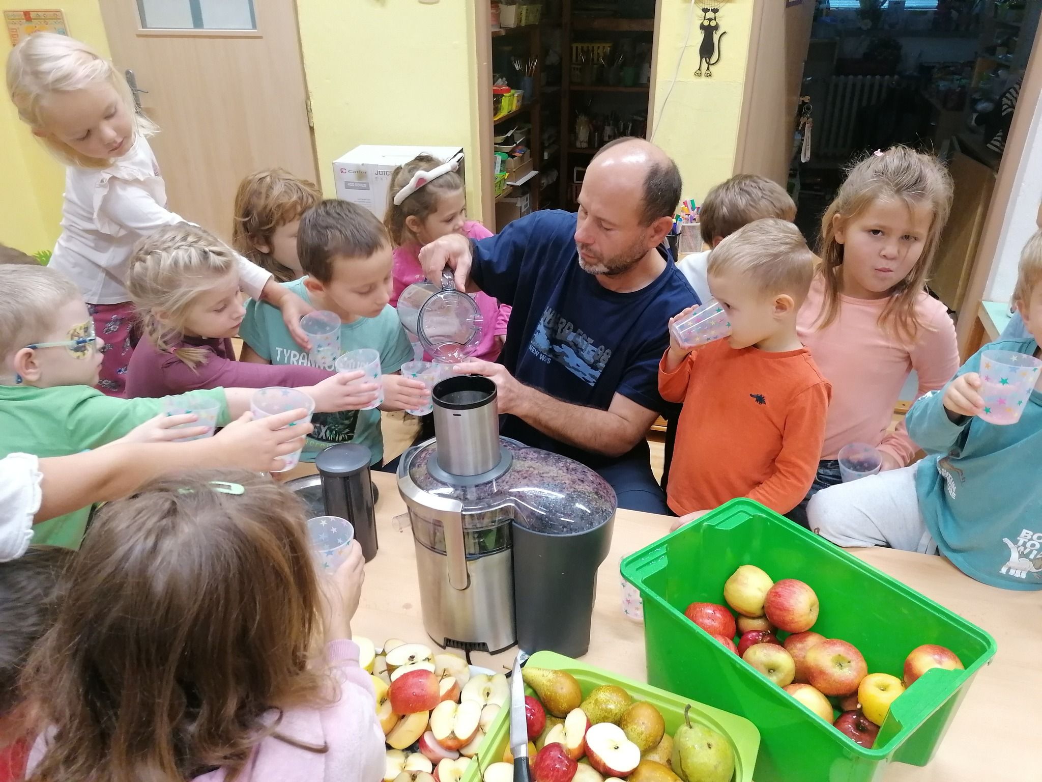 rámci ovocno-zeleninového týdne děti třídily, ochutnávaly i poznávaly ovoce a zeleninu, pekly jablečný štrúdl, vyráběly zeleninové jednohubky a navštívil nás také pan Odšťavňovač, který předvedl, jak se vyrábí čerstvá šťáva.