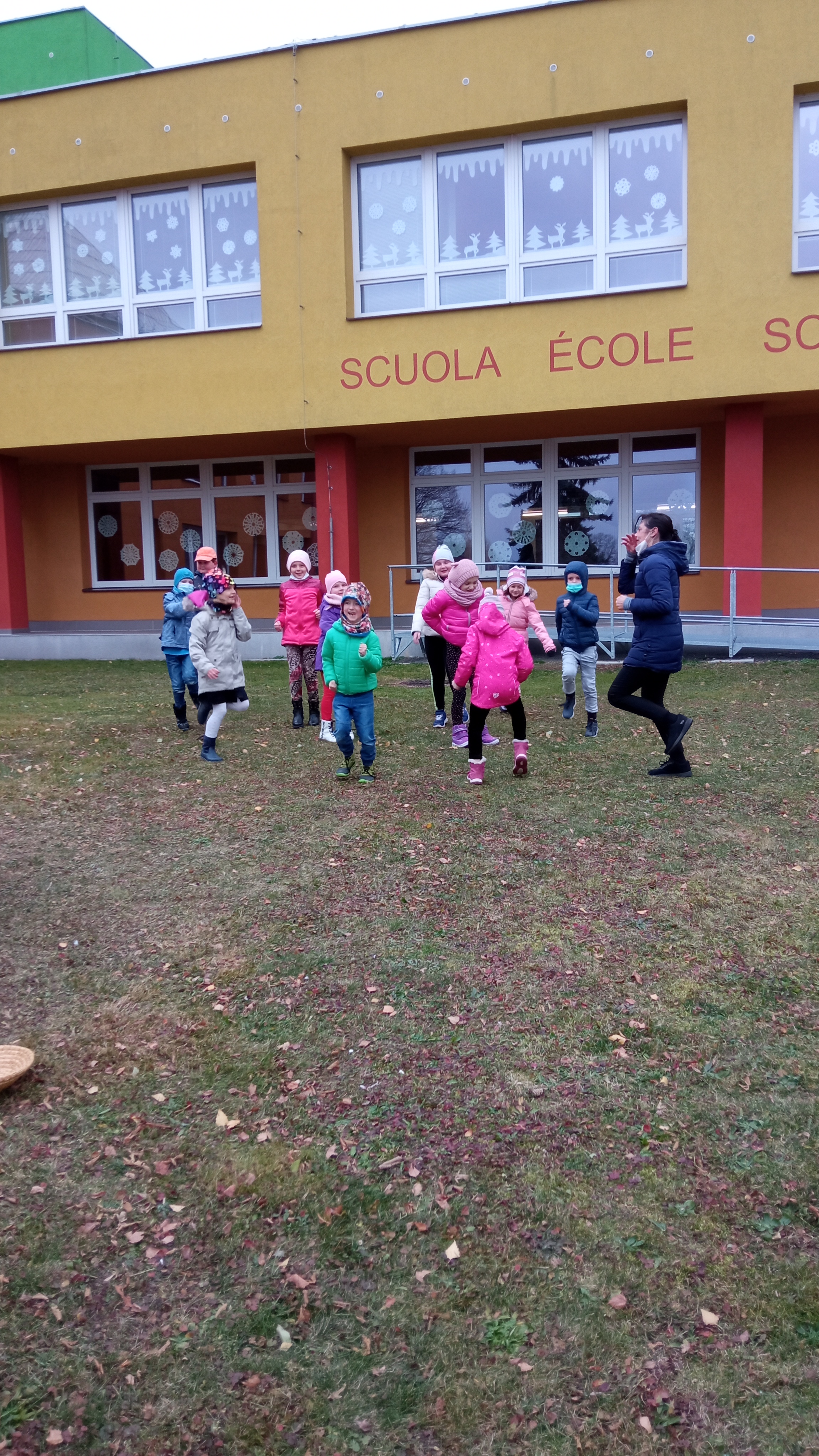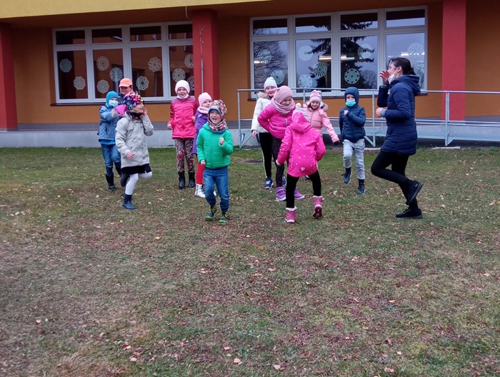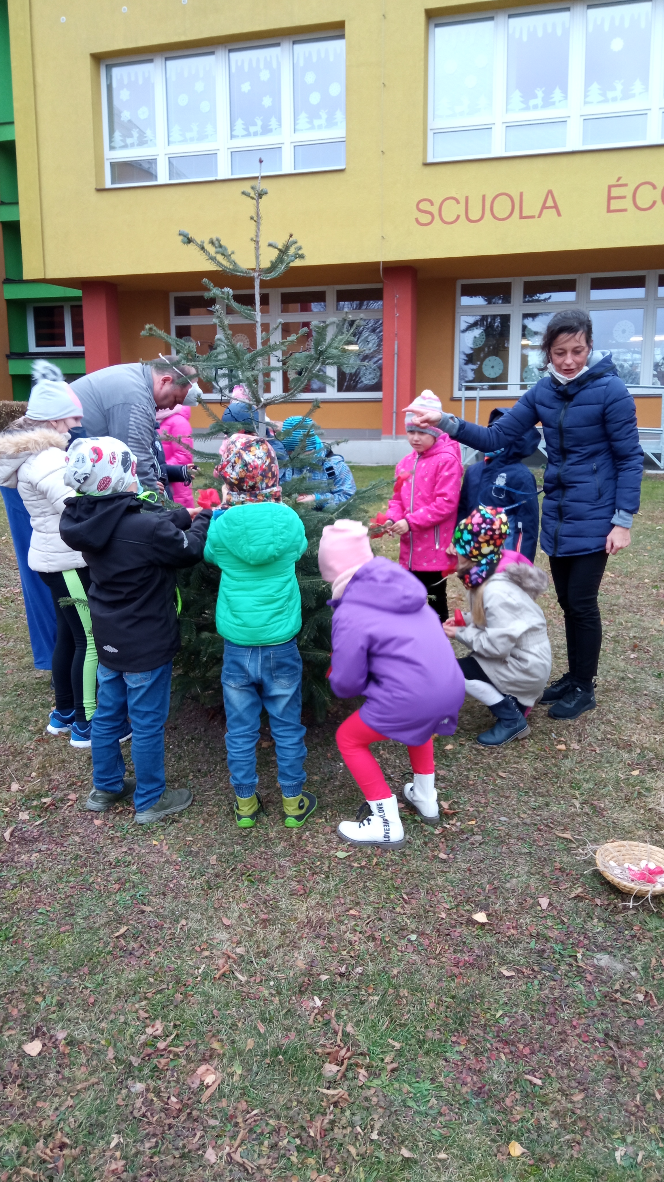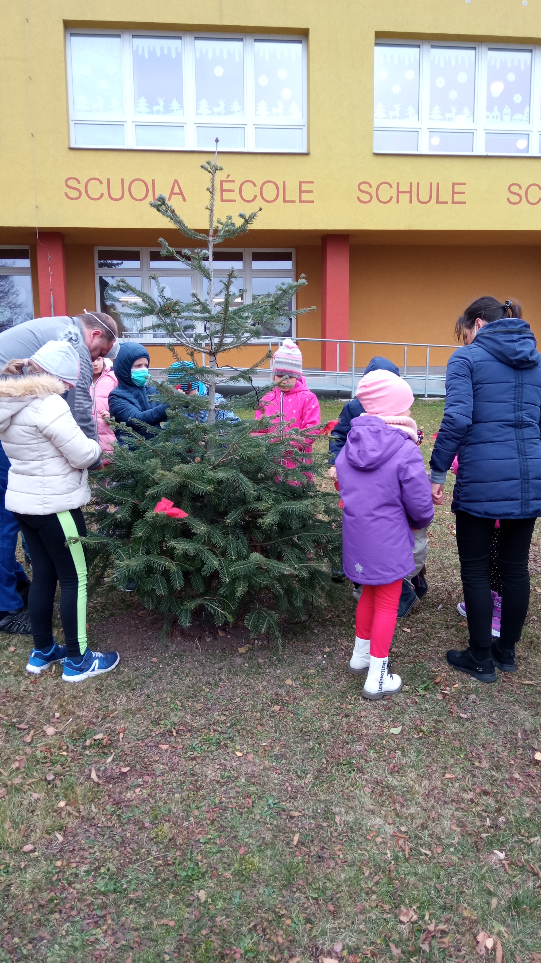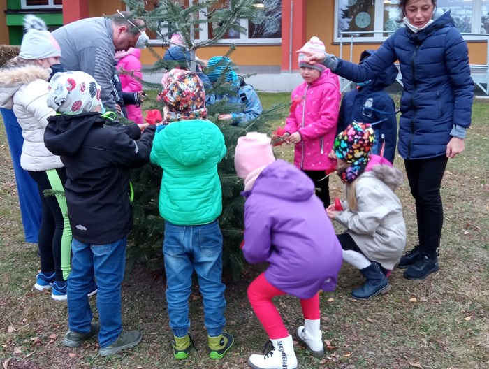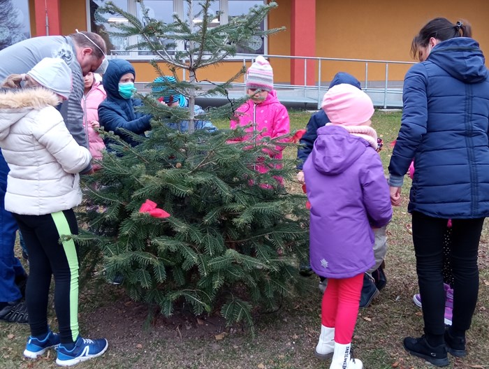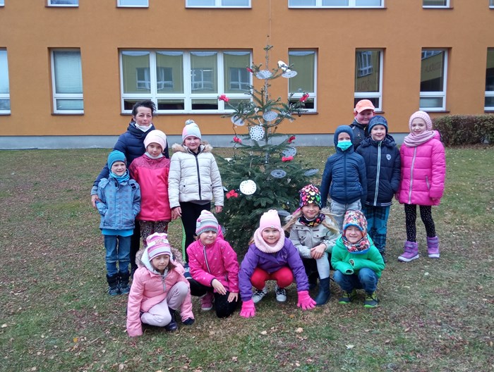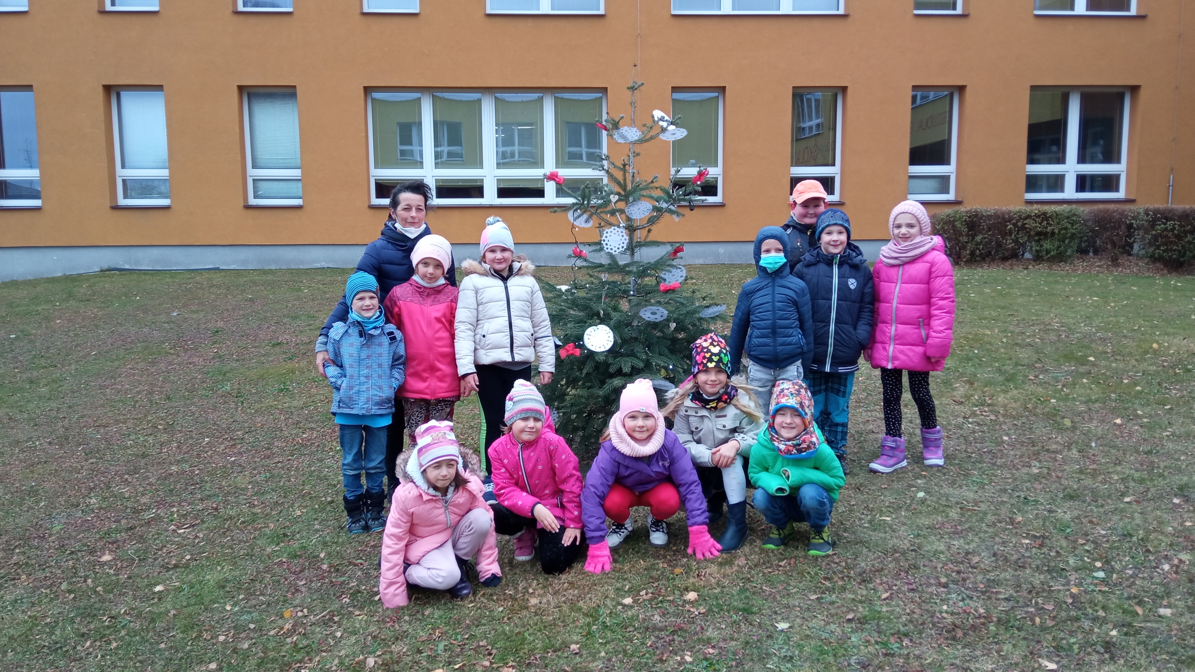 Děti z první třídy ozdobili stromeček před školou. Vlastnoručně vyrobené vločky jsme pověsili na stromeček. Zpívali koledy. Radost měly i z tancování kolem stromečku.