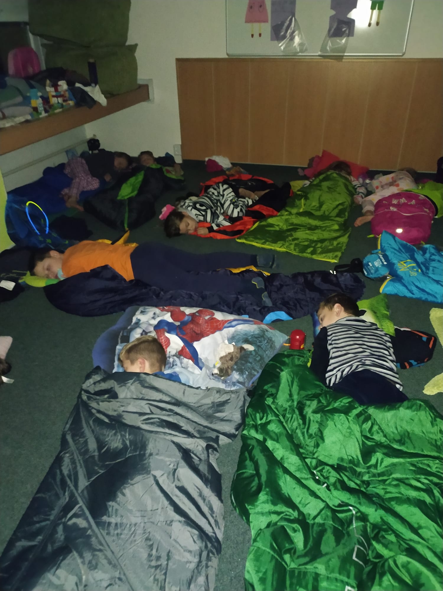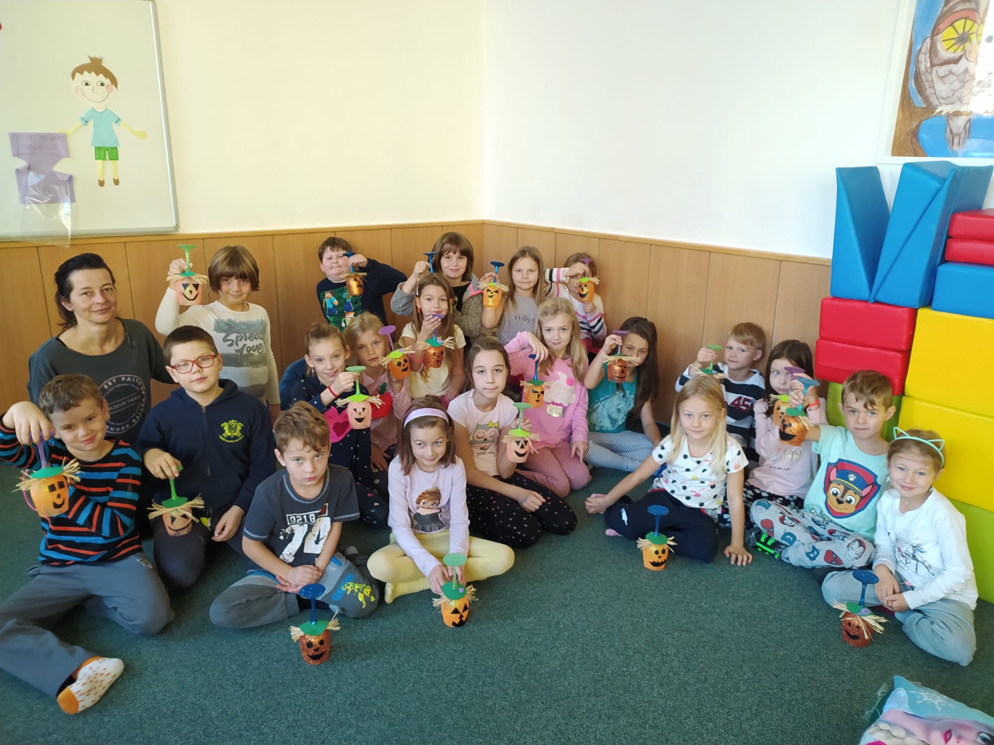 Strašidelný listopadový večer ve školní družině číslo 3. jsme odstartovali účastí na lampionovém průvodu. Po krásném ohňostroji jsme se vrátili zpět do školy, kde už na nás čekala večeře. Čas před strašidelnou stezkou jsme využili k výrobě dýňových svícnů ze sklenic. Stezku, na kterou jsme se všichni těšili nejvíce, zvládly děti na jedničku. Strašidelný večer jsem ukončili veselou audiopohádkou na dobré spaní. Ráno začalo budíčkem a rozcvičkou, snídaní a odměněním dětí malým dárkem. Domů odcházely s novými zážitky a přáním "Kdy tu budeme zase spát?".