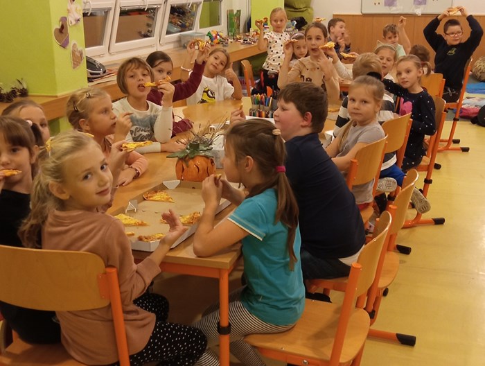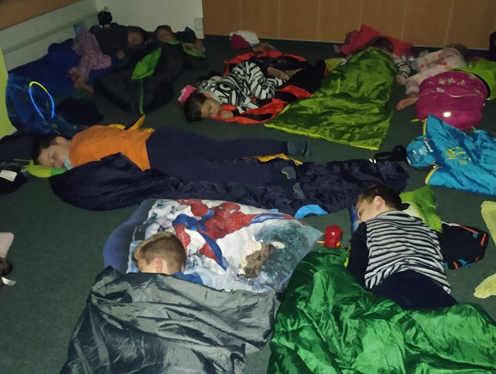 Strašidelný listopadový večer ve školní družině číslo 3. jsme odstartovali účastí na lampionovém průvodu. Po krásném ohňostroji jsme se vrátili zpět do školy, kde už na nás čekala večeře. Čas před strašidelnou stezkou jsme využili k výrobě dýňových svícnů ze sklenic. Stezku, na kterou jsme se všichni těšili nejvíce, zvládly děti na jedničku. Strašidelný večer jsem ukončili veselou audiopohádkou na dobré spaní. Ráno začalo budíčkem a rozcvičkou, snídaní a odměněním dětí malým dárkem. Domů odcházely s novými zážitky a přáním "Kdy tu budeme zase spát?".