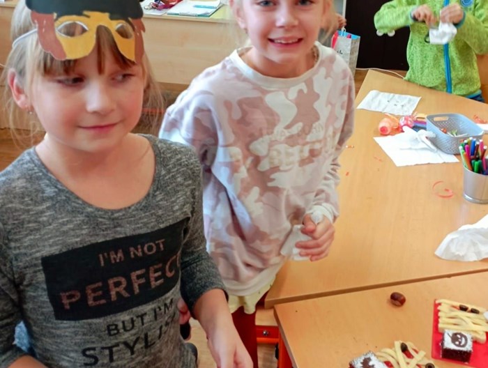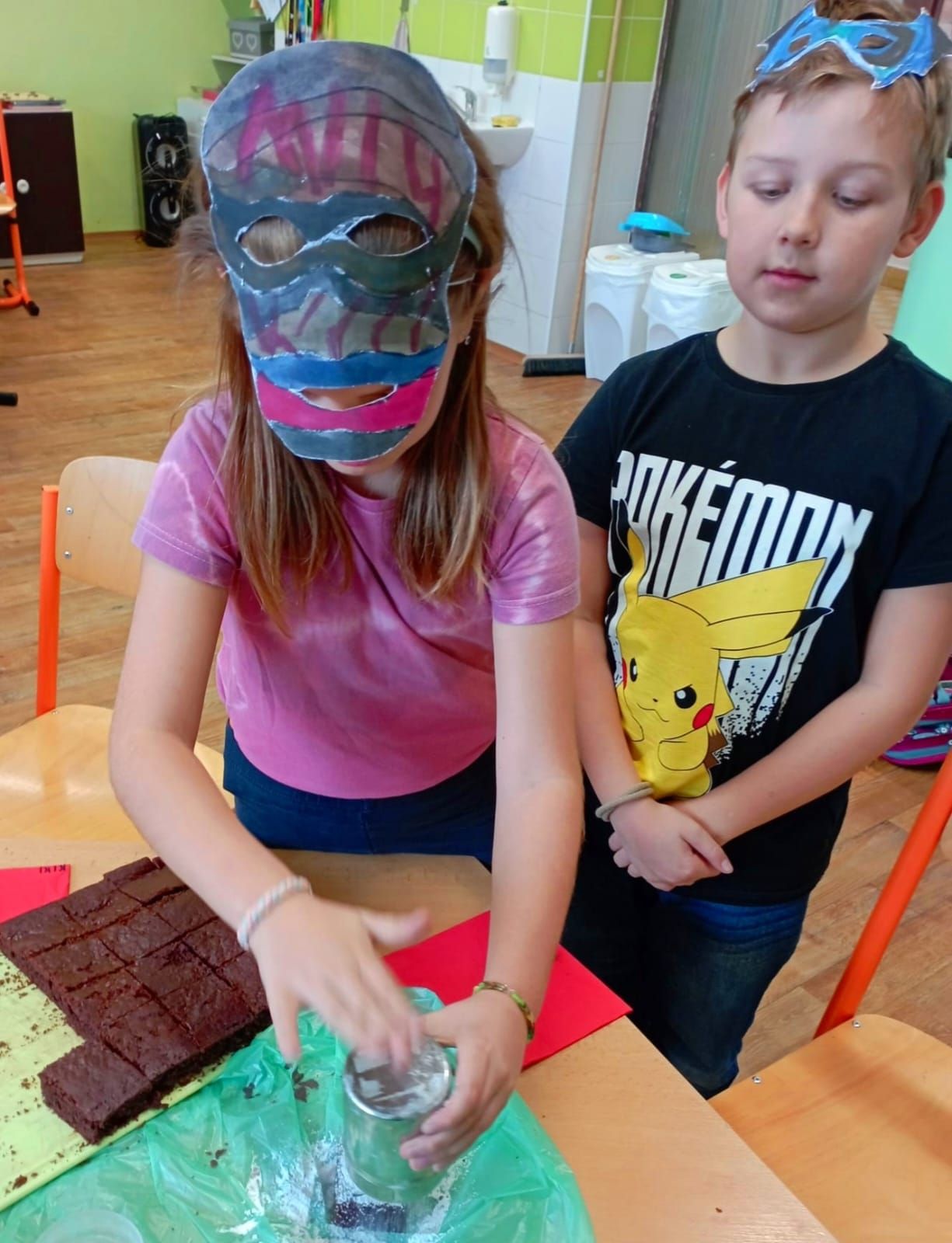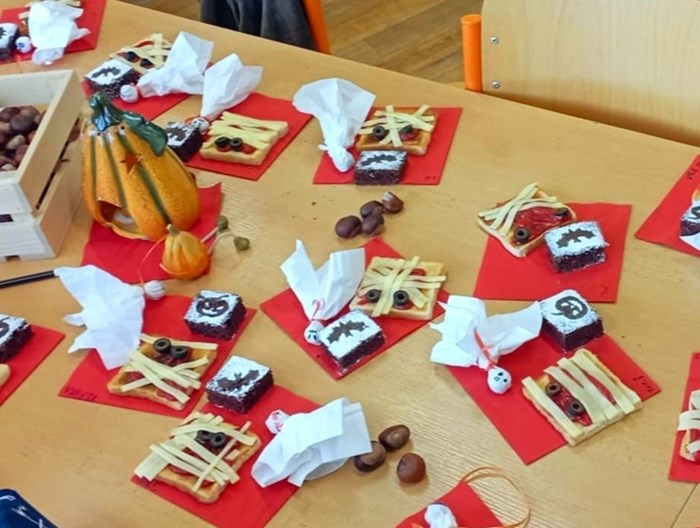 Děti jistě zažily již mnoho způsobů, jak oslavit na konci října právě svátek Halloween… proč si tedy neužít, toto dětmi oblíbené období trochu jinak - přípravou a pak i konzumací tématicky připraveného občerstvení? A právě proto jsme se v našem oddělení rozhodli vytvořit vlastními silami toastové mumie se sýrem a kečupem, duchy z lízátek či tmavý perník s motivy dýně a netopýra. A na závěr si pak na všem - přestože mírně strašidelném - společně pochutnali.