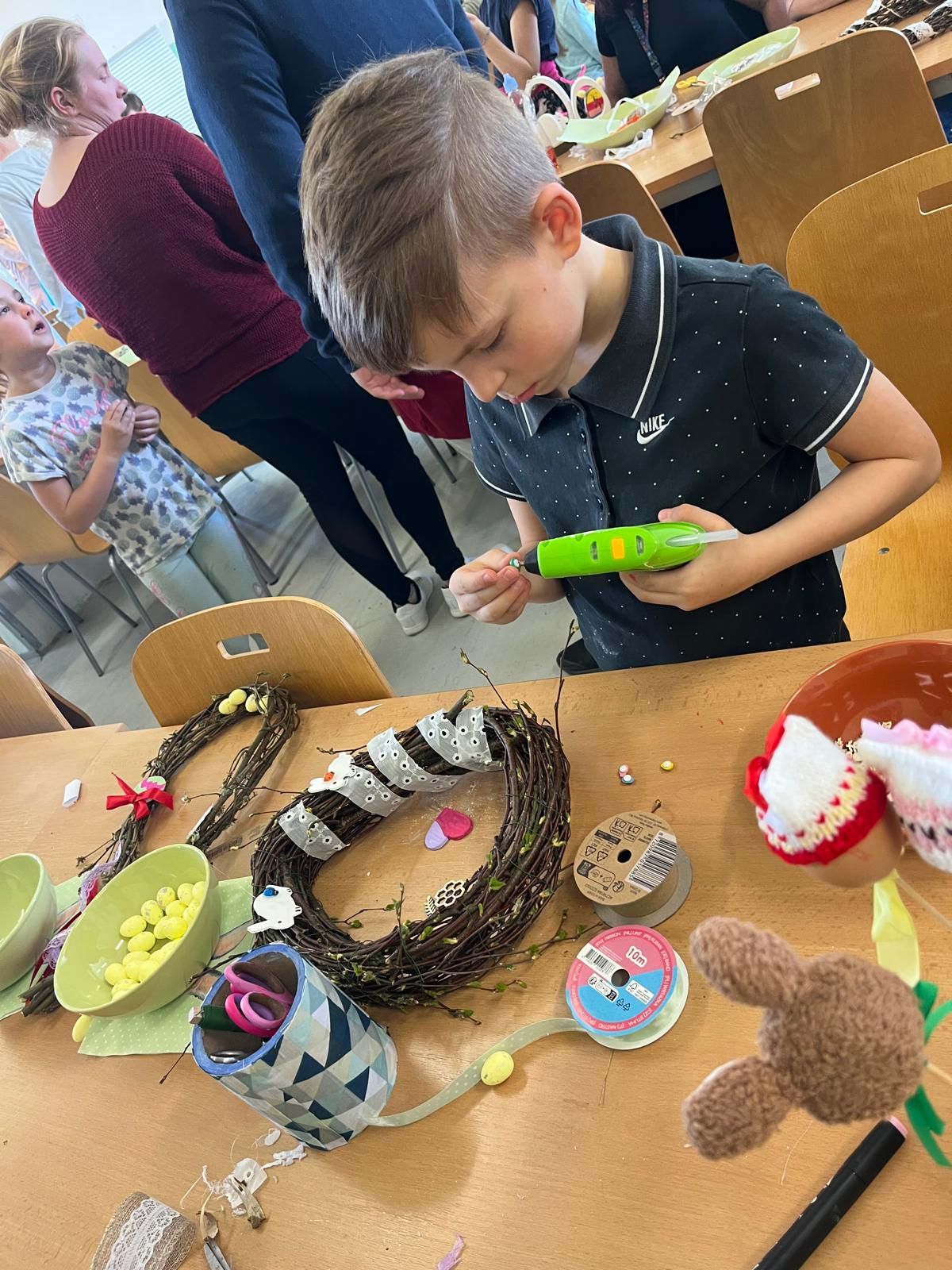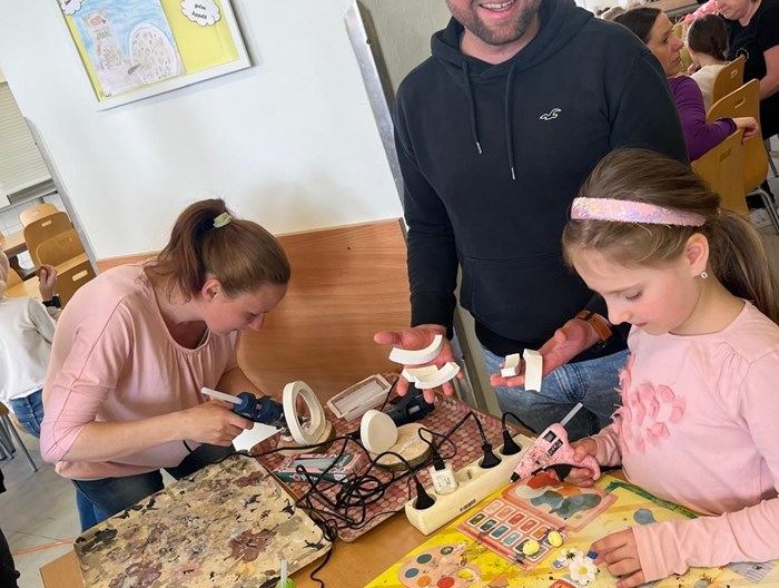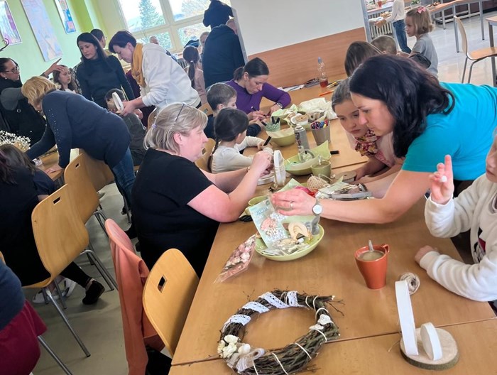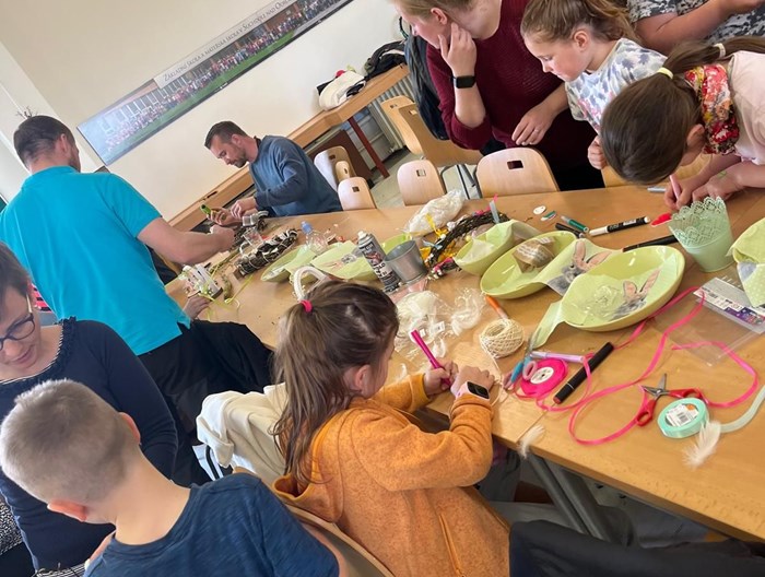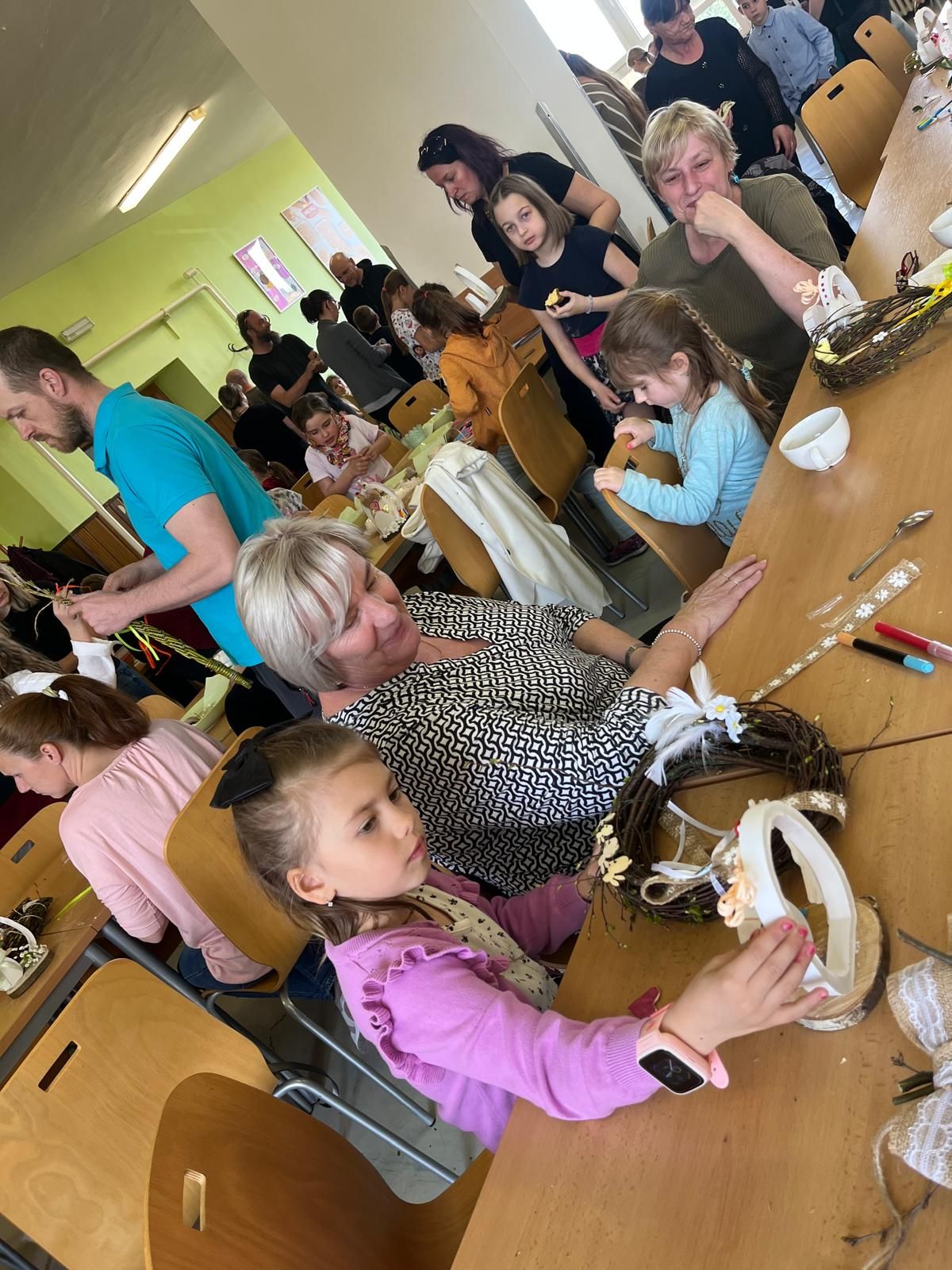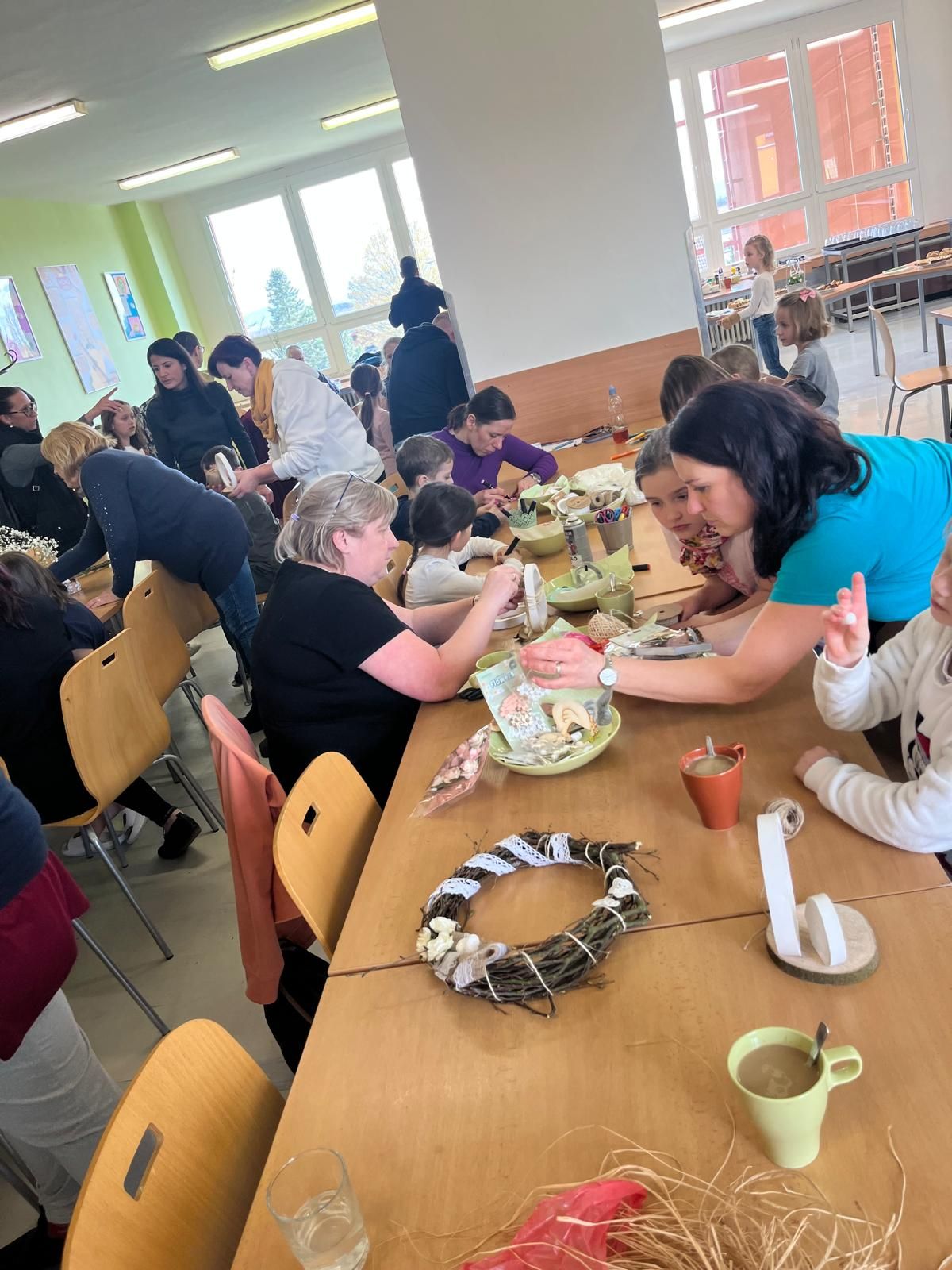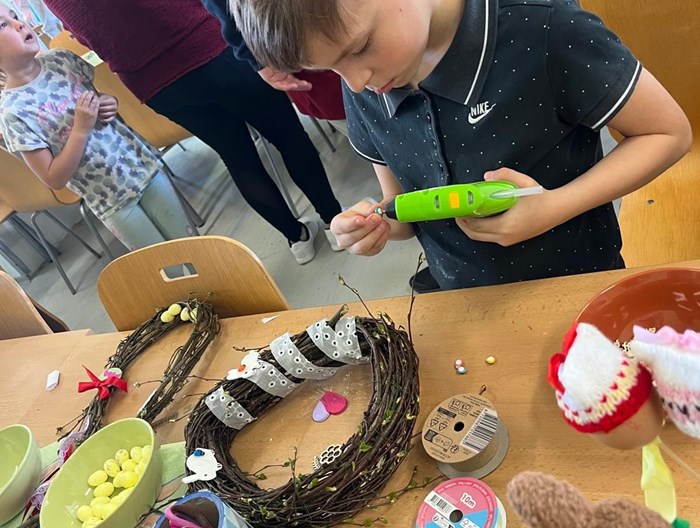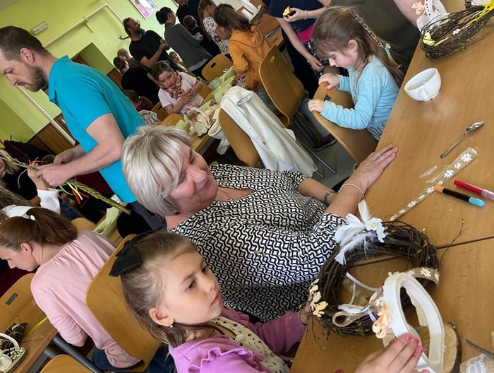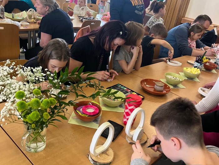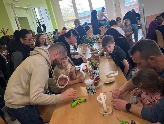 Děkujeme všem rodičům, kteří si našli čas a chuť s námi i svými dětmi strávit příjemné tvůrčí odpoledne v naší jídelně. Vždyť i nabídka aktivit snad byla dosti pestrá a každý si mohl najít to, co je mu blízké - od pletení pomlázky, přes dekorace ze sádrových odlitků až po výrobu a zdobení věnečků nebo velikonočních závěsů. A možná i malé předvelikonoční občerstvení přispělo k pohodě a poklidnému průběhu této hojně navštívené akce.