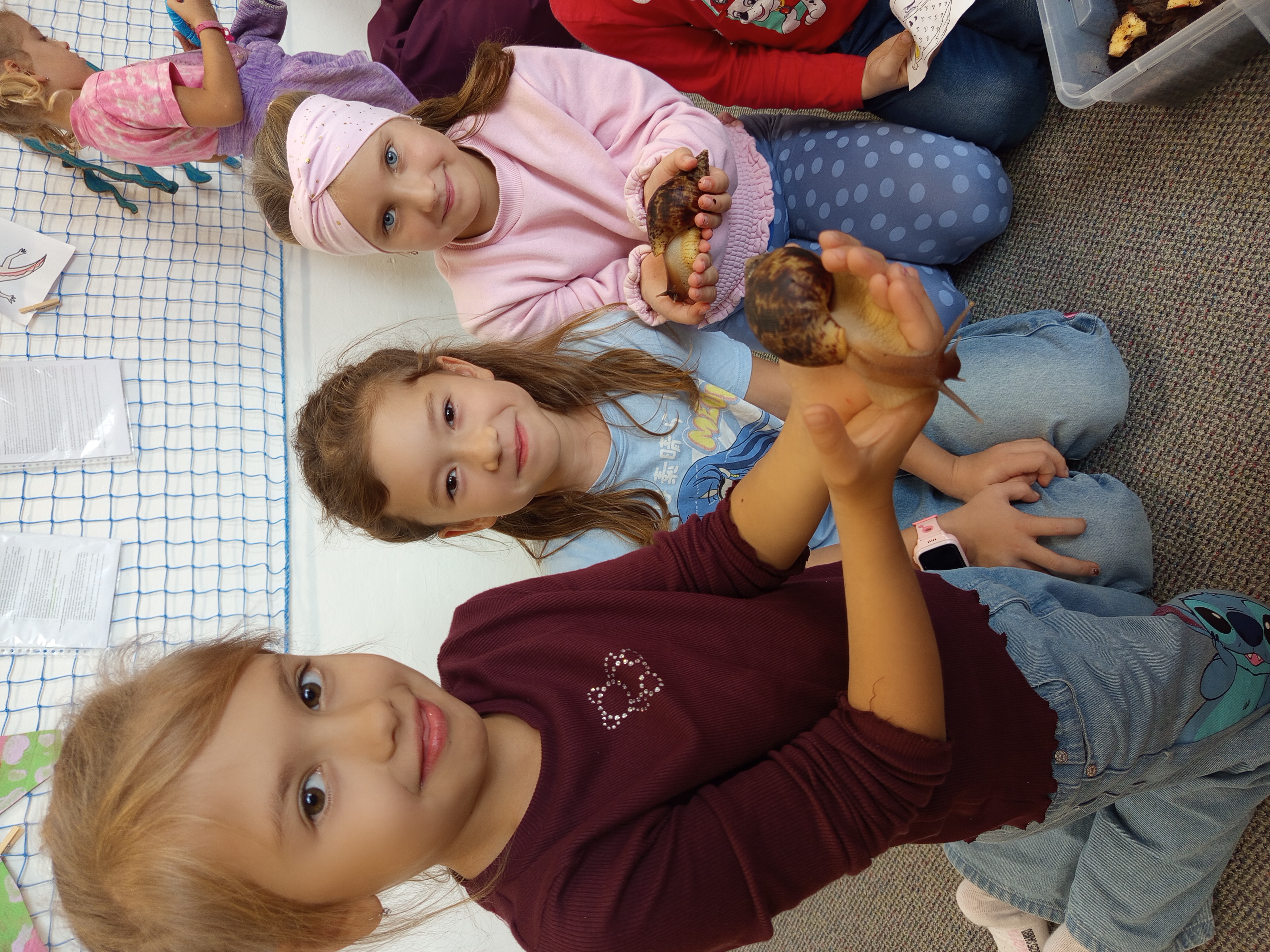 - v rámci řízené činnosti pohybové hry (překážková dráha, úpolové hry- přetahování aj.) řízená relaxace se zpětnou vazbou (motivační pohádka na téma strach), seznámení dětí s družinovými mazlíčky - pakobylka Klacík a strašilky Větvík a Tyčinka a se šneky africkými Gerry a Herry.