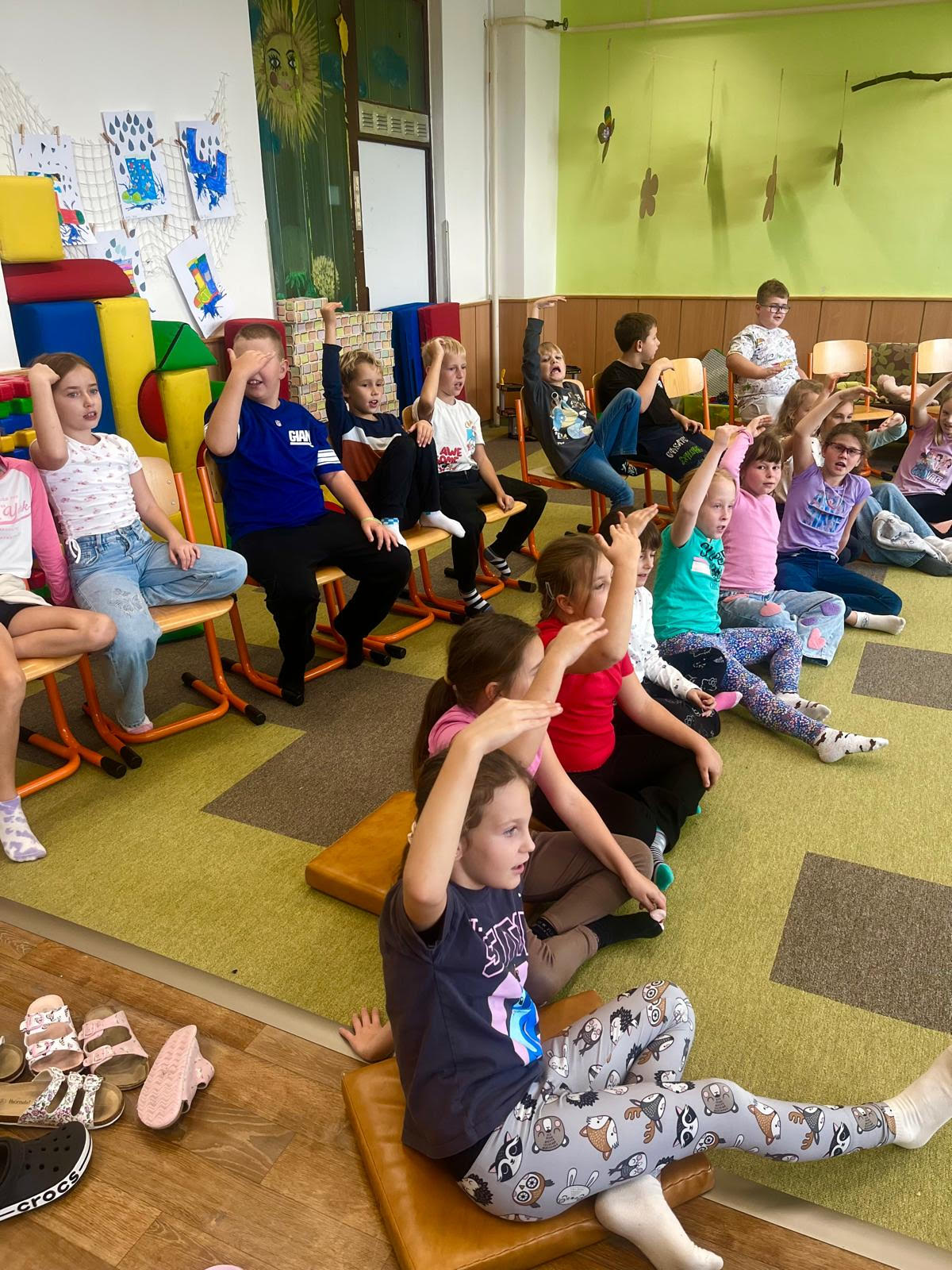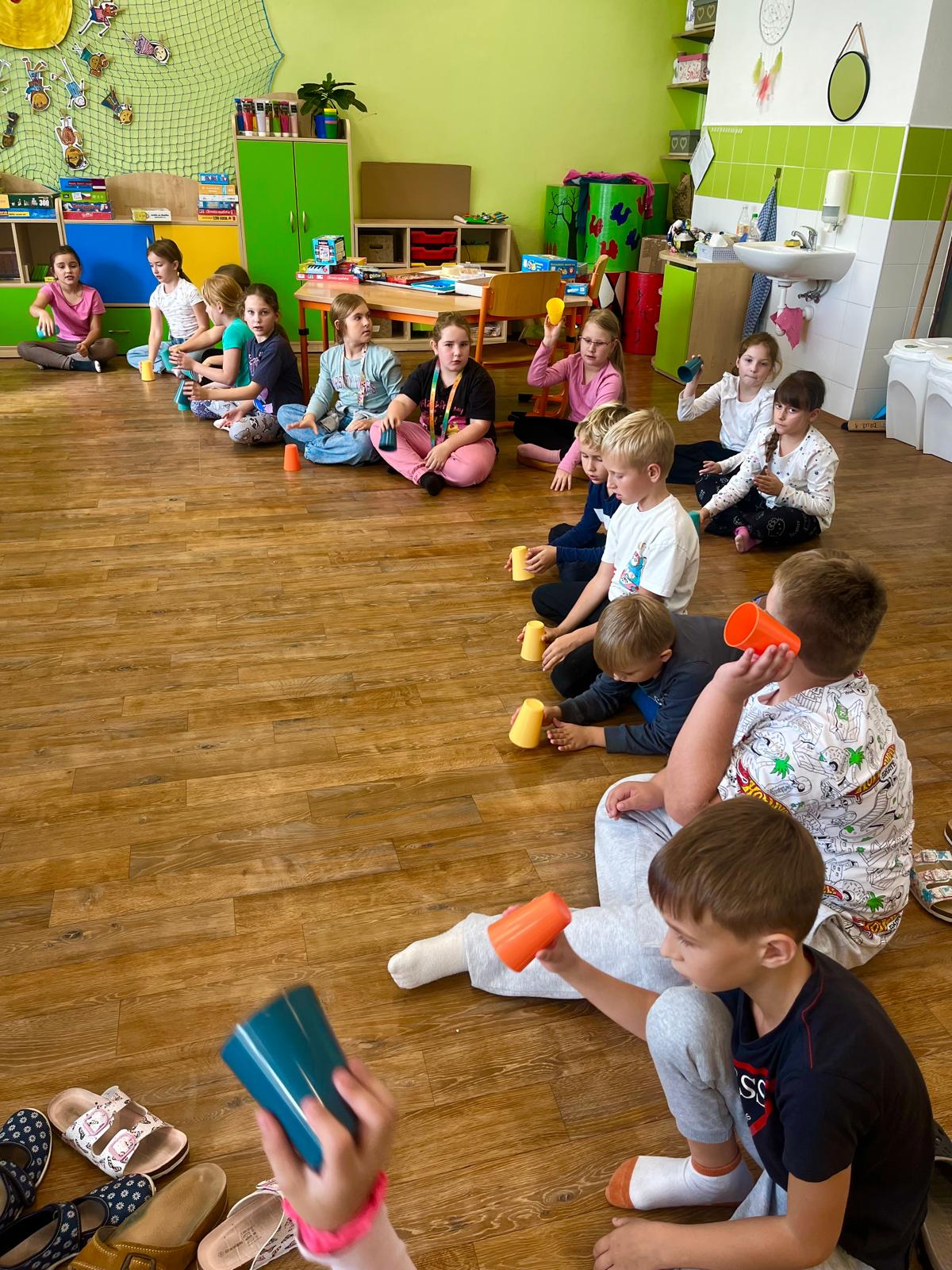 - čas strávený na vlnách hudby - hudba nás provázela v mnoha podobách - ať už živá, reprodukovaná, doprovázená hrou na kytaru, klavír nebo Orffovy nástroje. Pro zpestření jsme si vyzkoušeli i rytmický pohyb s kelímky v rytmu známého „Cup songu“ a nechyběly ani taneční prvky, které nám přinesly spoustu zábavy a radosti z pohybu.