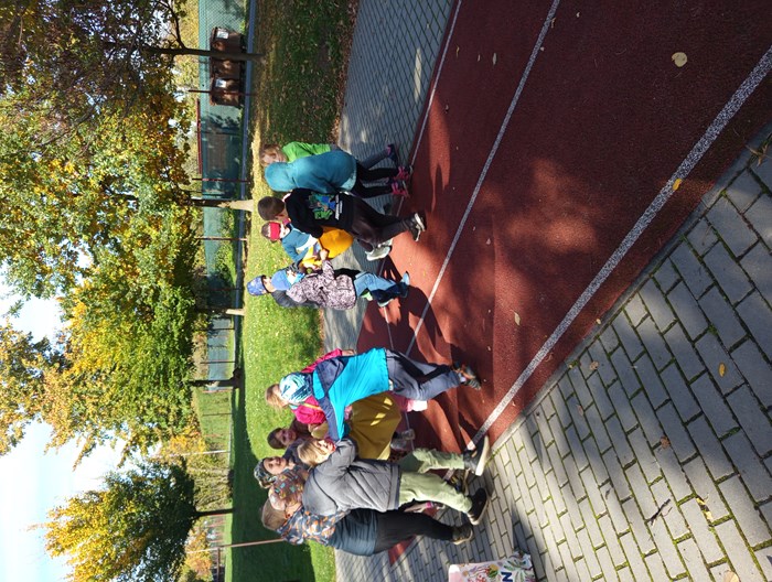 - v rámci řízené činnosti pohybové hry (překážková dráha, úpolové hry- přetahování aj.) řízená relaxace se zpětnou vazbou (motivační pohádka na téma strach), seznámení dětí s družinovými mazlíčky - pakobylka Klacík a strašilky Větvík a Tyčinka a se šneky africkými Gerry a Herry.
