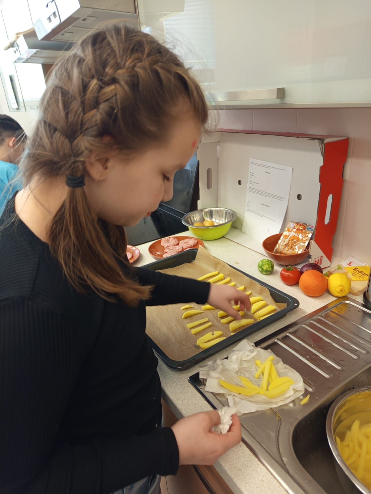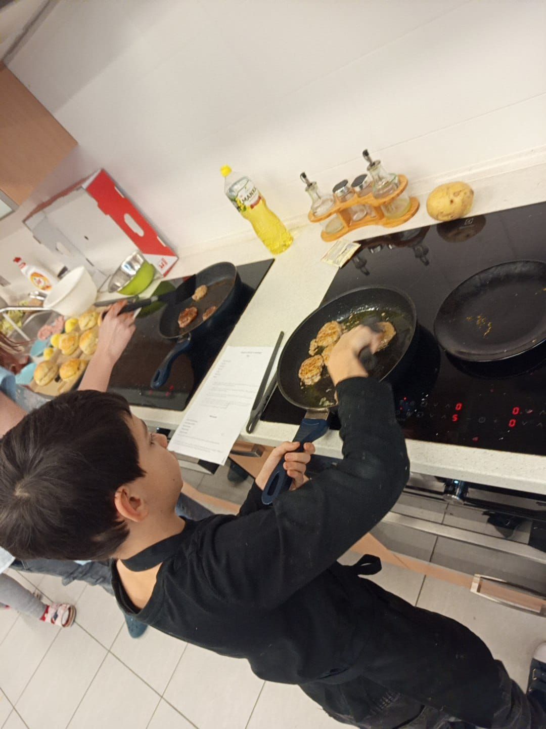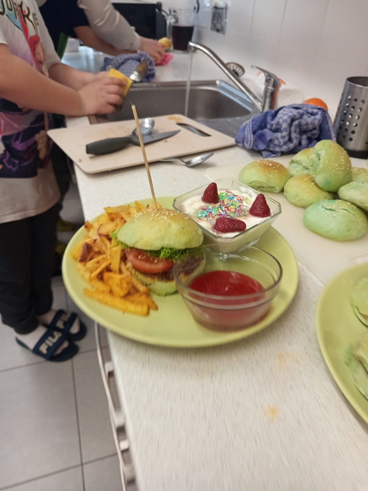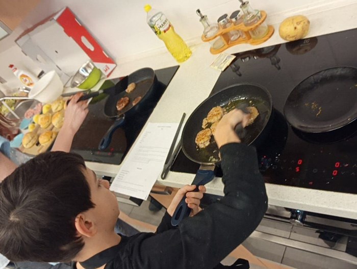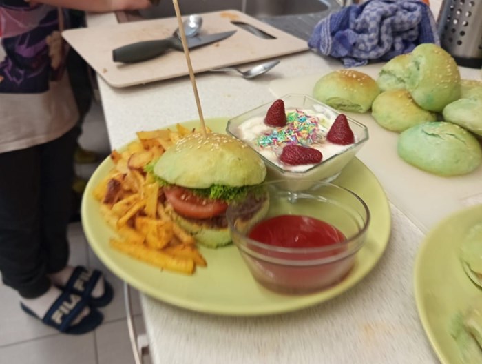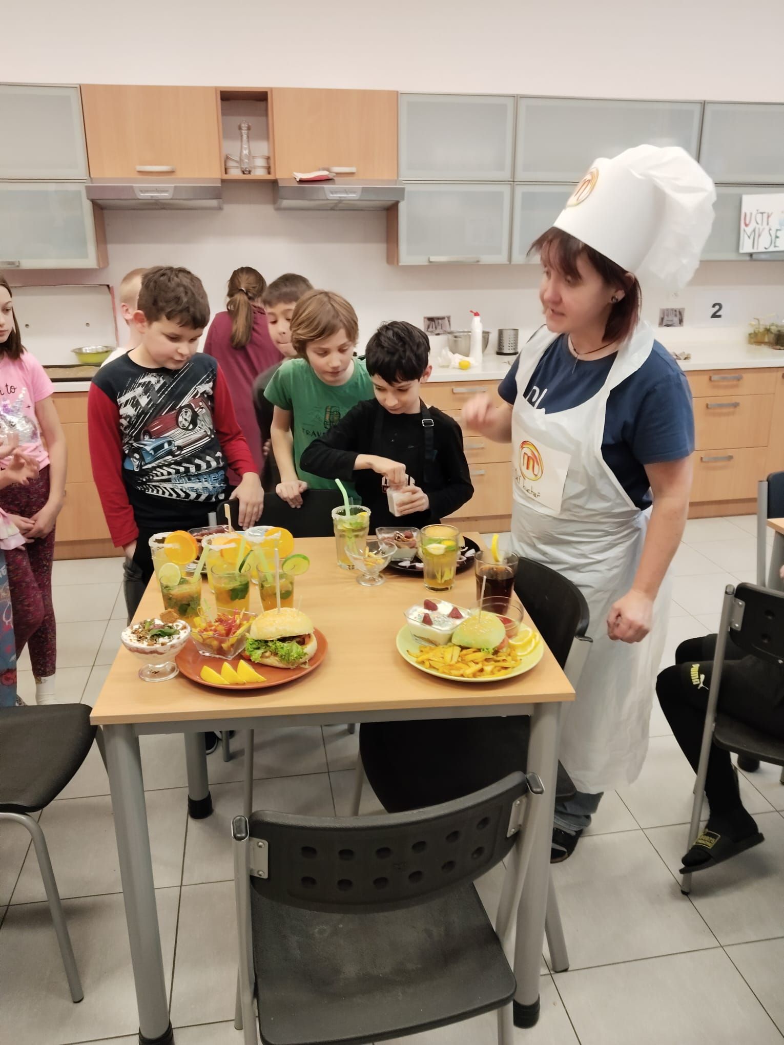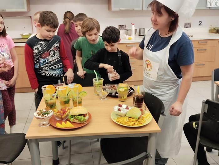 Každý tým musel připravit kompletní menu - podával se domácí hamburger s nadýchanou houskou, křupavé domácí hranolky, tvarohový dezert a nechyběl ani vlastní originální nápoj, který si děti samy vymyslely a představily porotě.