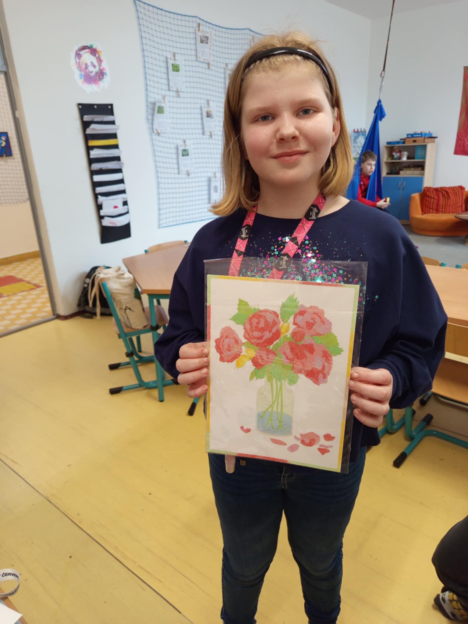 A neposlední řadě jsme s velkým úspěchem opakovali pískování. Díky projektu OP JAK děti získaly pískovací šablony, které si mohly samy dotvořit pomocí barevných písků. Při práci mohly kombinovat barvy, experimentovat a vytvářet zajímavé efekty - fantazii se opravdu meze nekladly.
