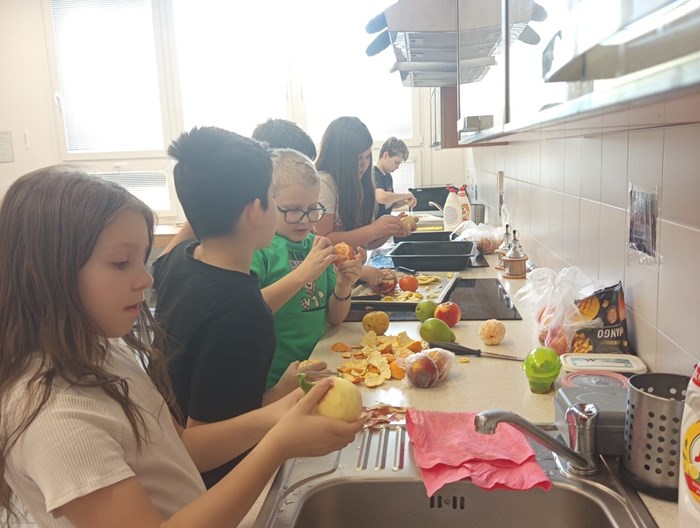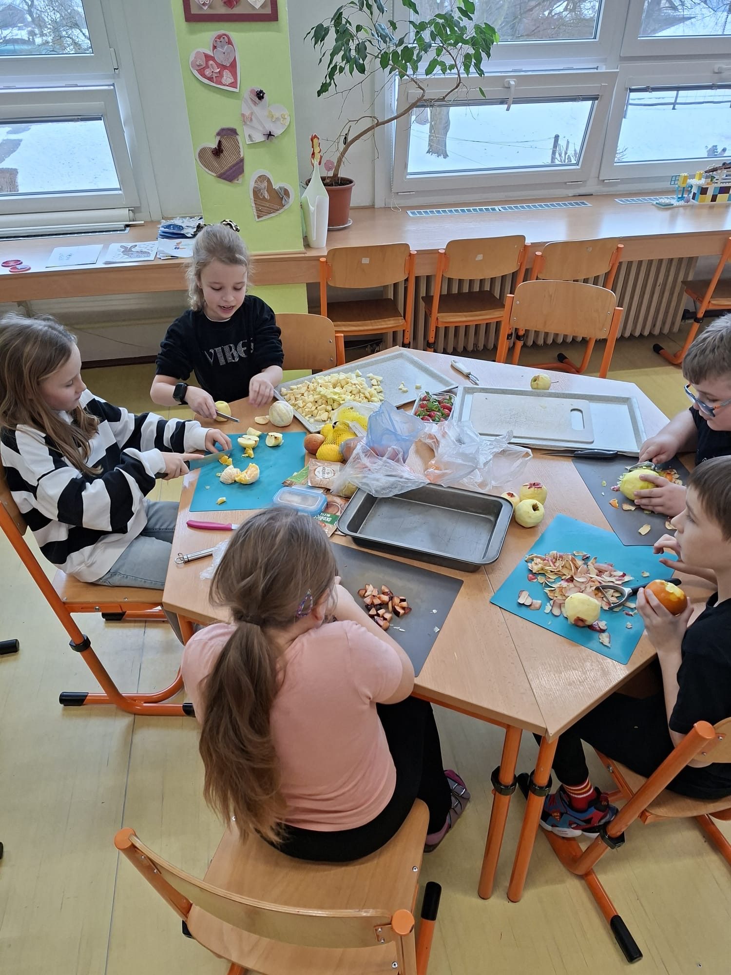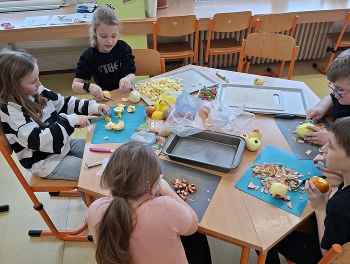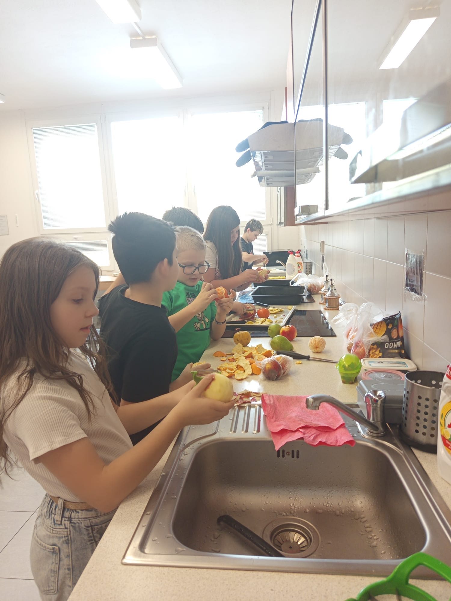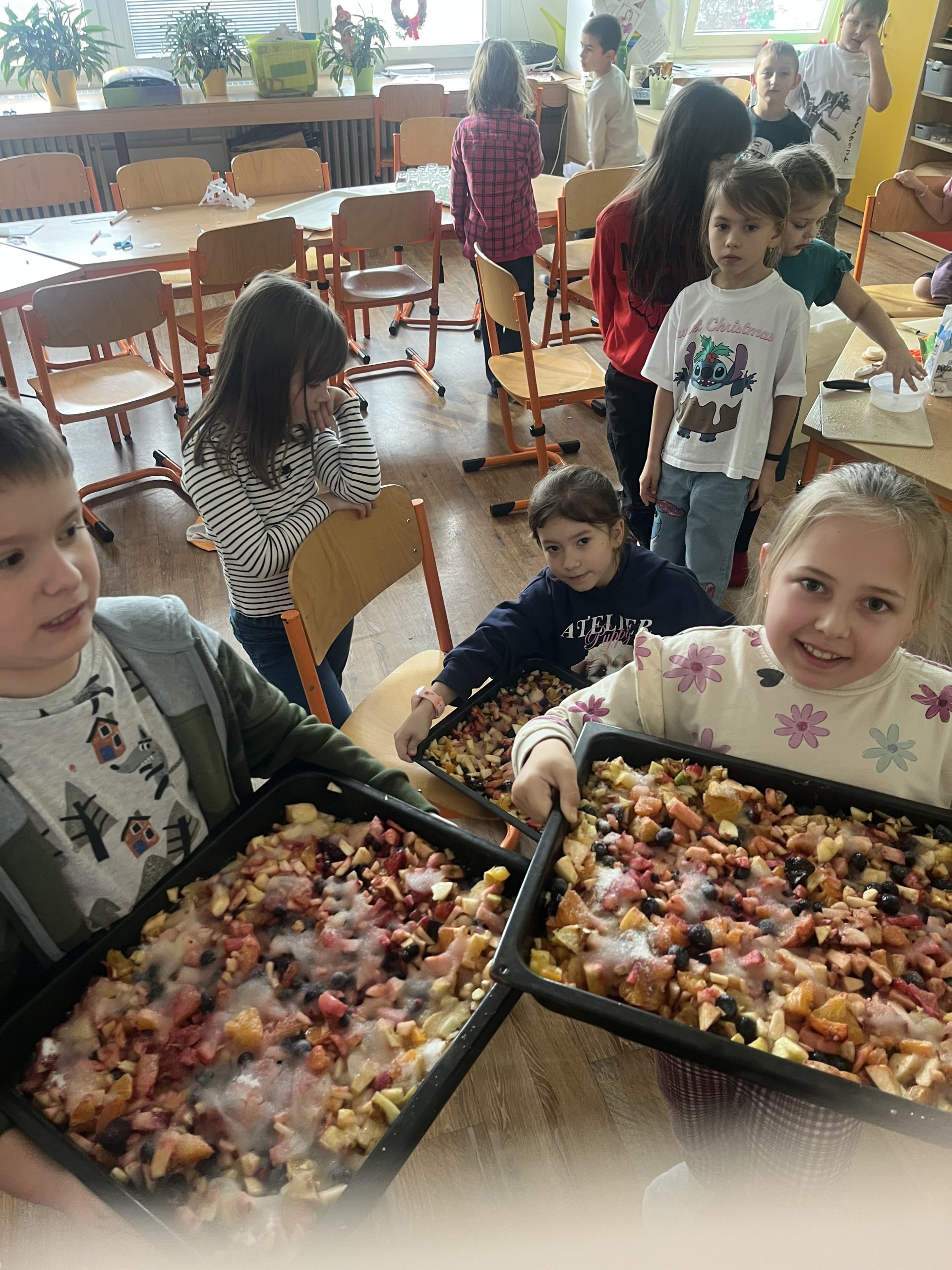 Aktivně se zapojily do okrajování, krájení i pečení přineseného ovoce nejrůznějších druhů. Nechyběla ani ochutnávka hotových čajů a závěrečné vyhodnocení. Přestože bylo zábavné vybírat ten „nejlepší“, mnohem důležitější pro nás bylo opět zjištění, že děti dokážou spolupracovat, vzájemně si pomáhat a táhnout za jeden provaz.