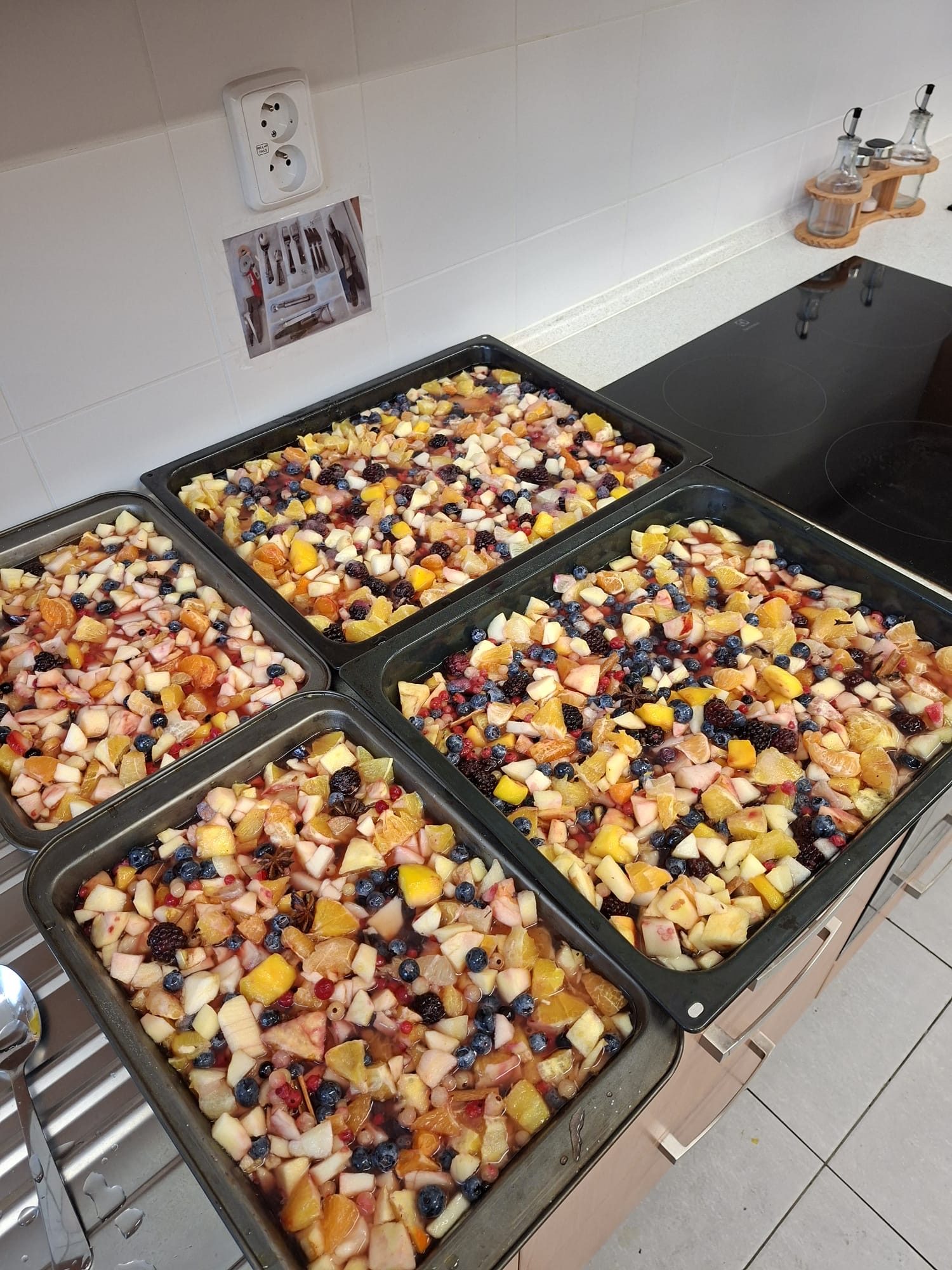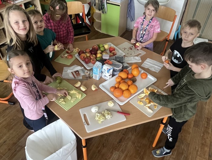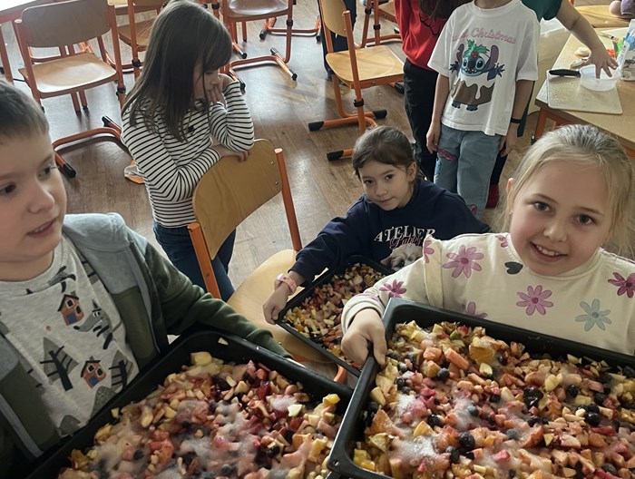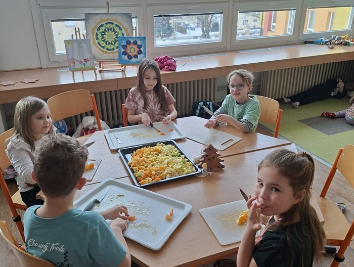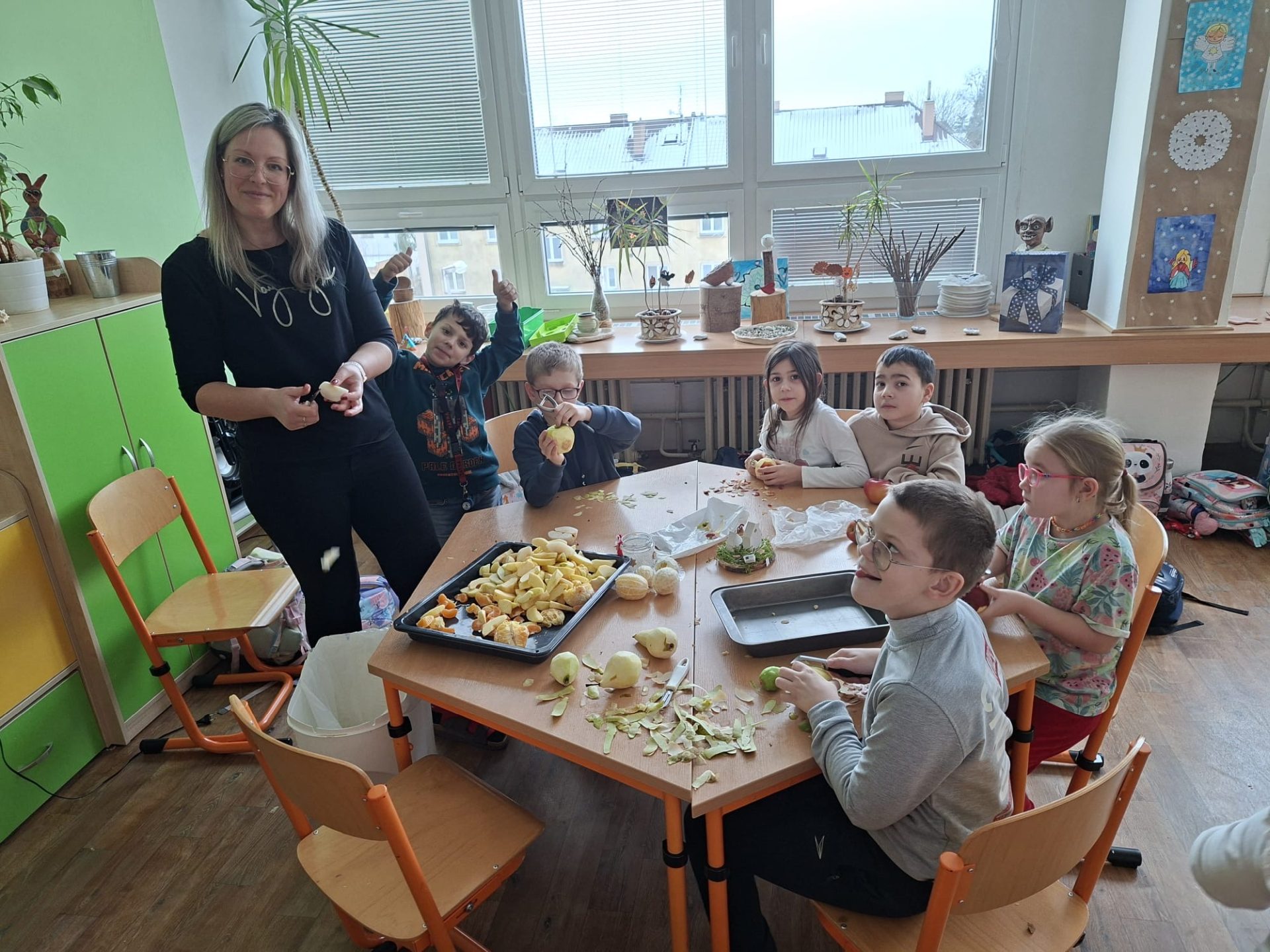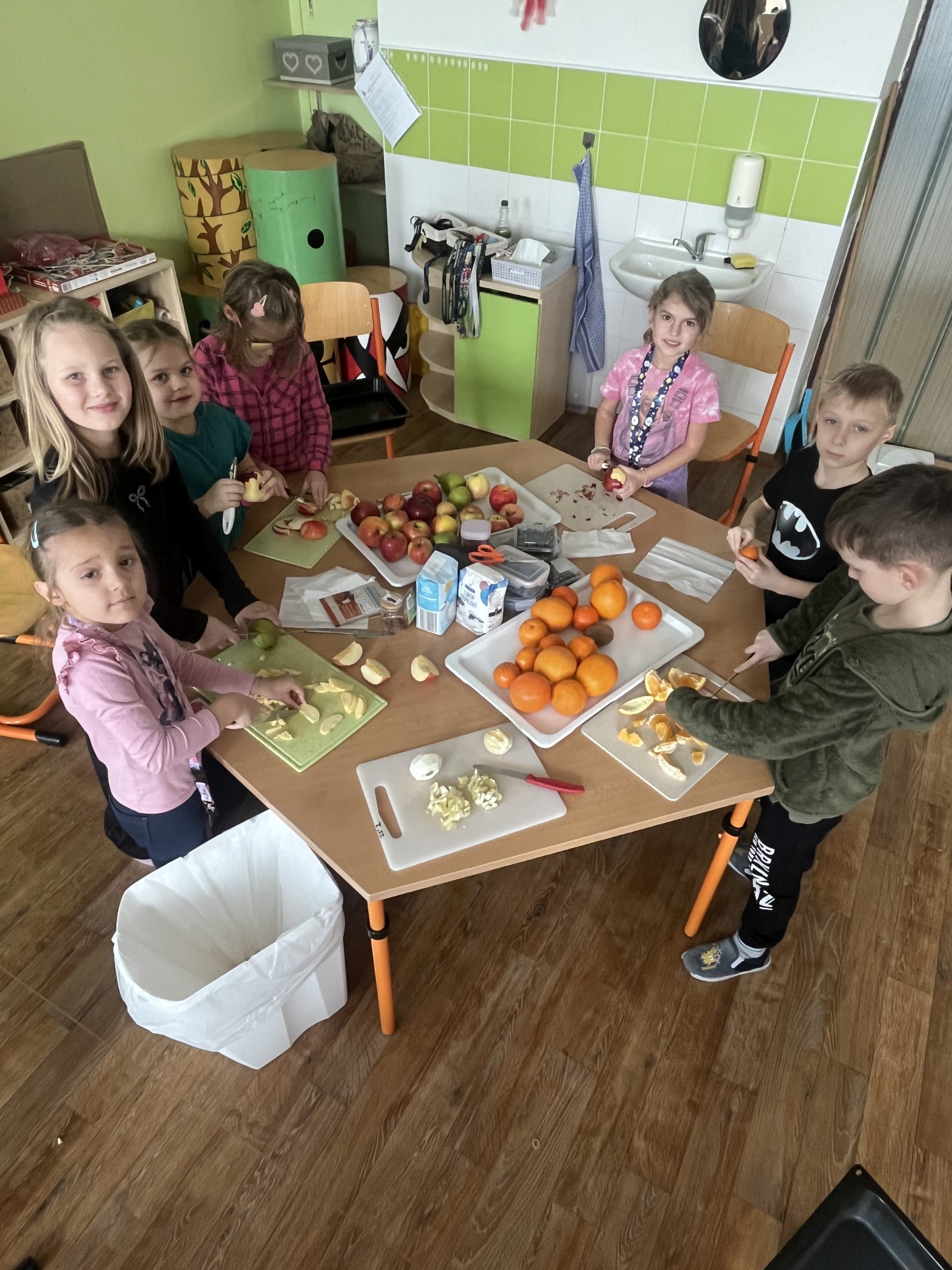 Aktivně se zapojily do okrajování, krájení i pečení přineseného ovoce nejrůznějších druhů. Nechyběla ani ochutnávka hotových čajů a závěrečné vyhodnocení. Přestože bylo zábavné vybírat ten „nejlepší“, mnohem důležitější pro nás bylo opět zjištění, že děti dokážou spolupracovat, vzájemně si pomáhat a táhnout za jeden provaz.