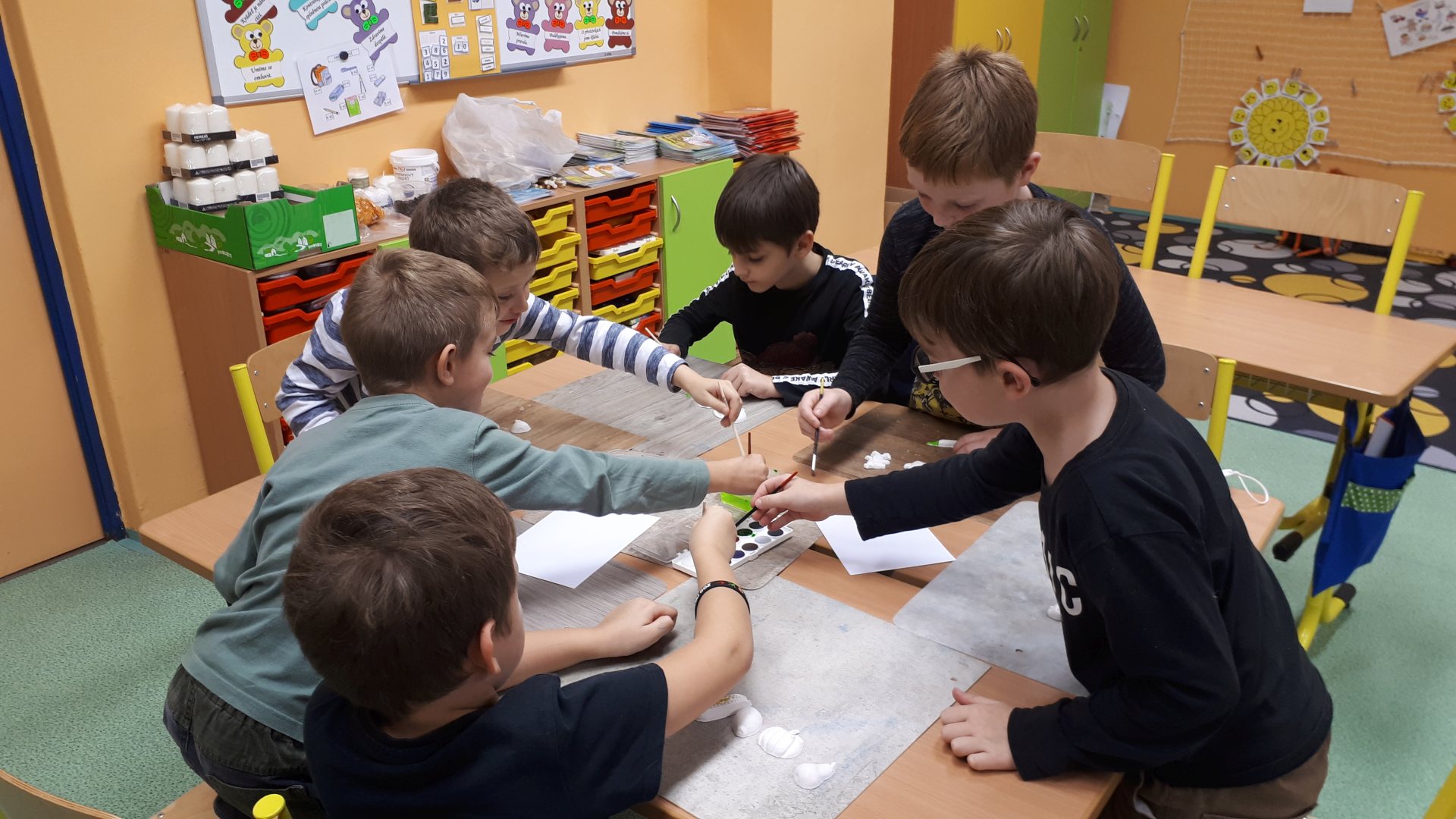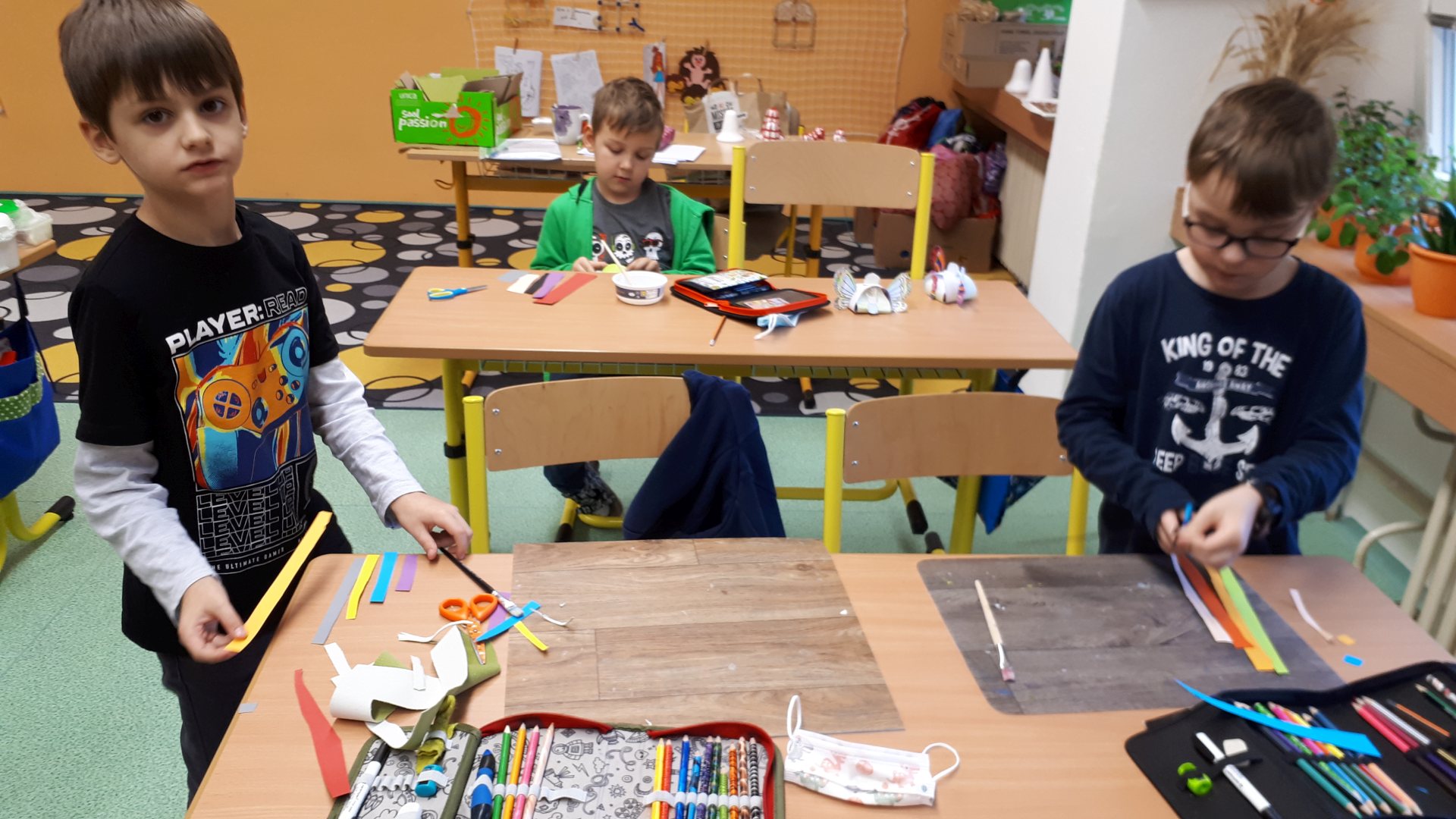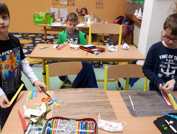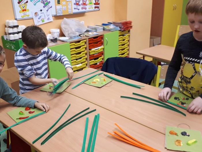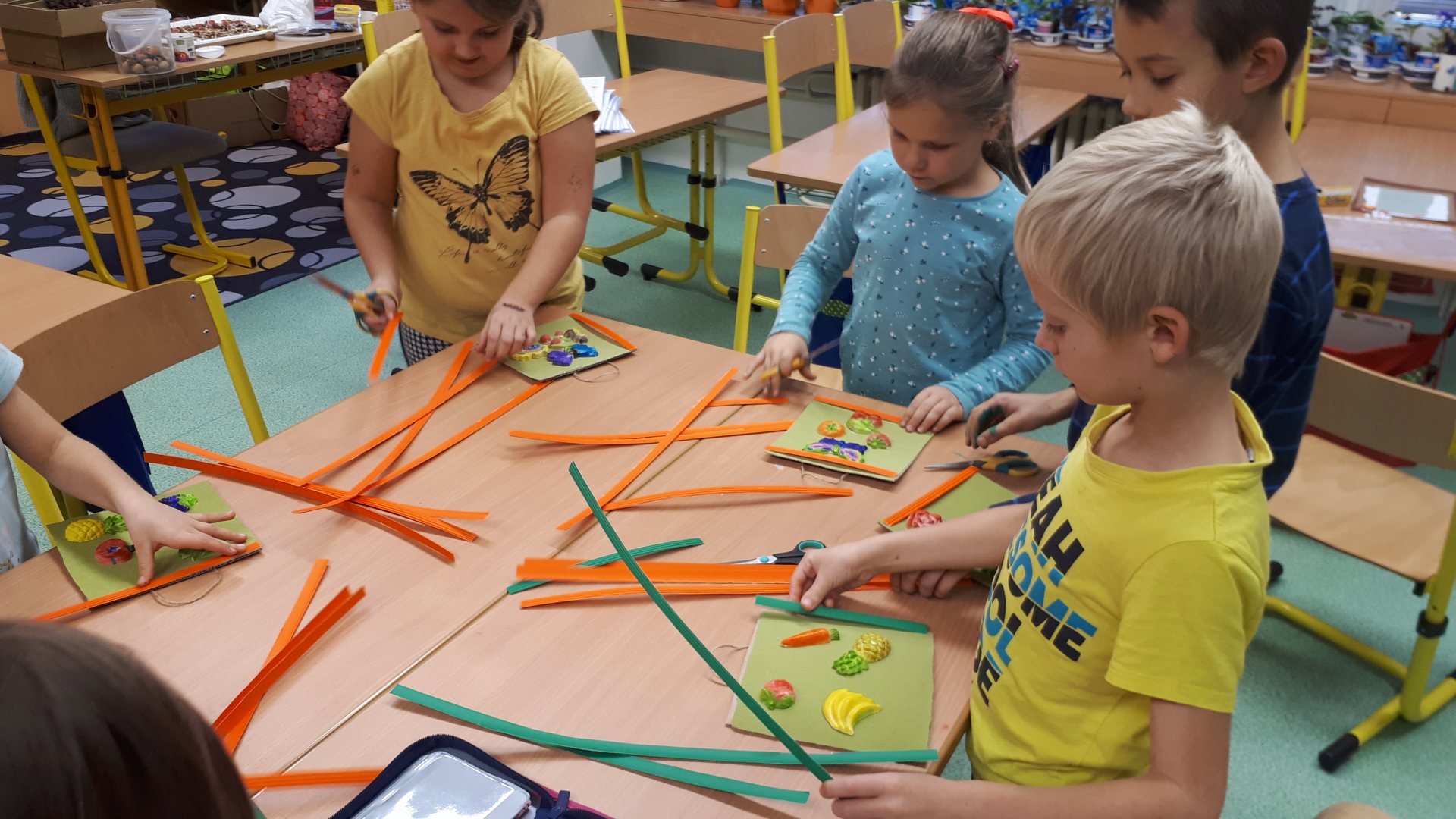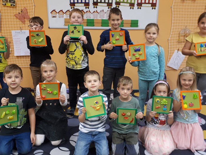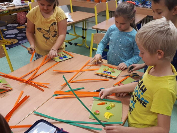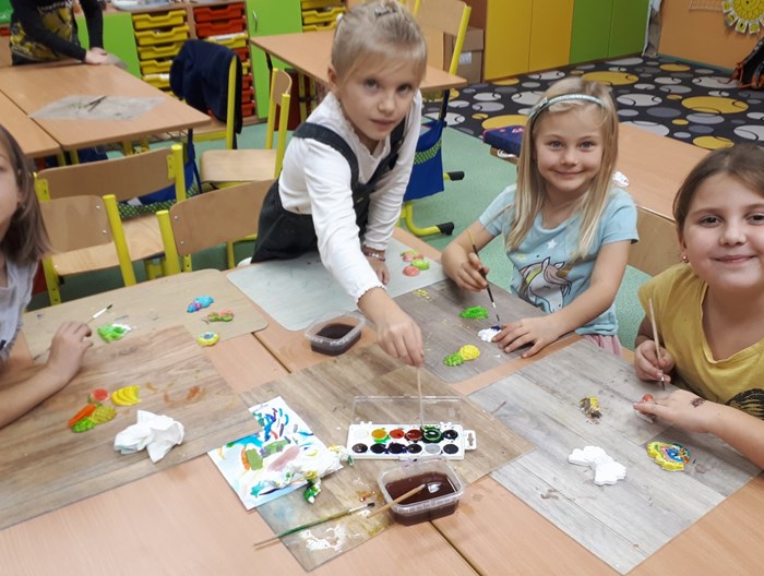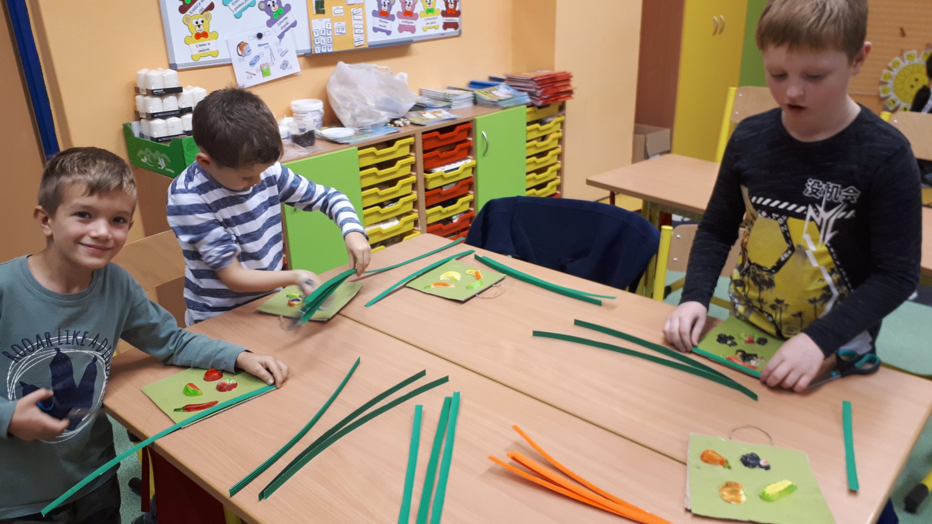 Měsíc listopad se pyšnil krásnými barvami. Toho využili malí Šikulové, odlili si ze sádry podzimní plody, které pak nabarvili anilinovými barvami. Po zhotovení rámečku z potahové látky vznikl pestrobarevný podzimní obrázek k zavěšení. I další výrobek hýřil barvami. Šneček z proužků barevných papíru určitě udělal radost. A v neposlední řadě se dětem povedl i barevný dráček.