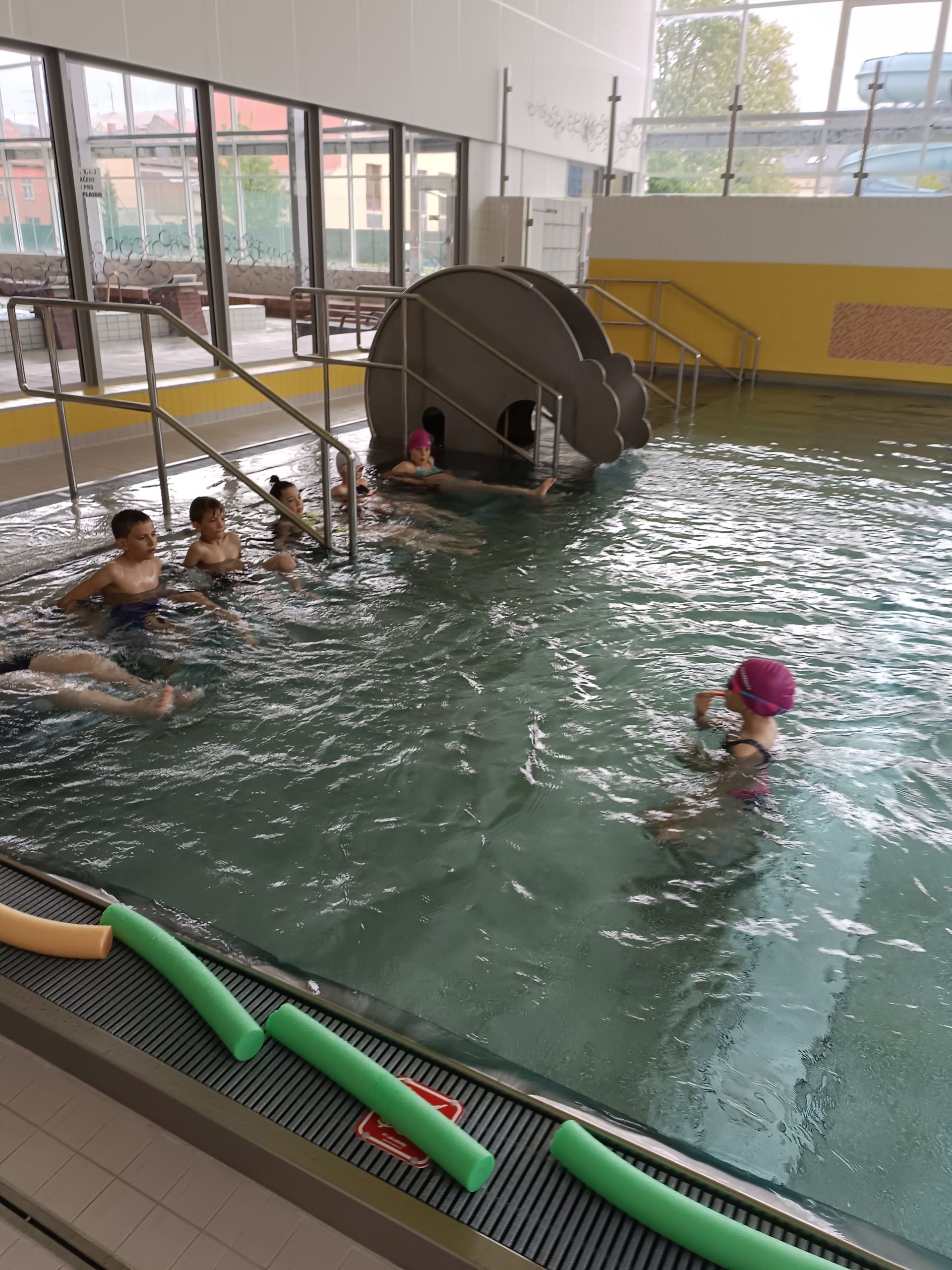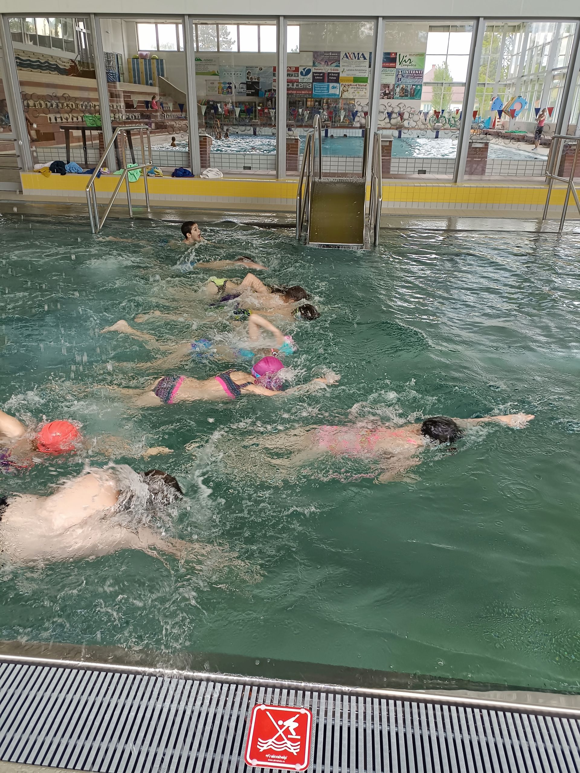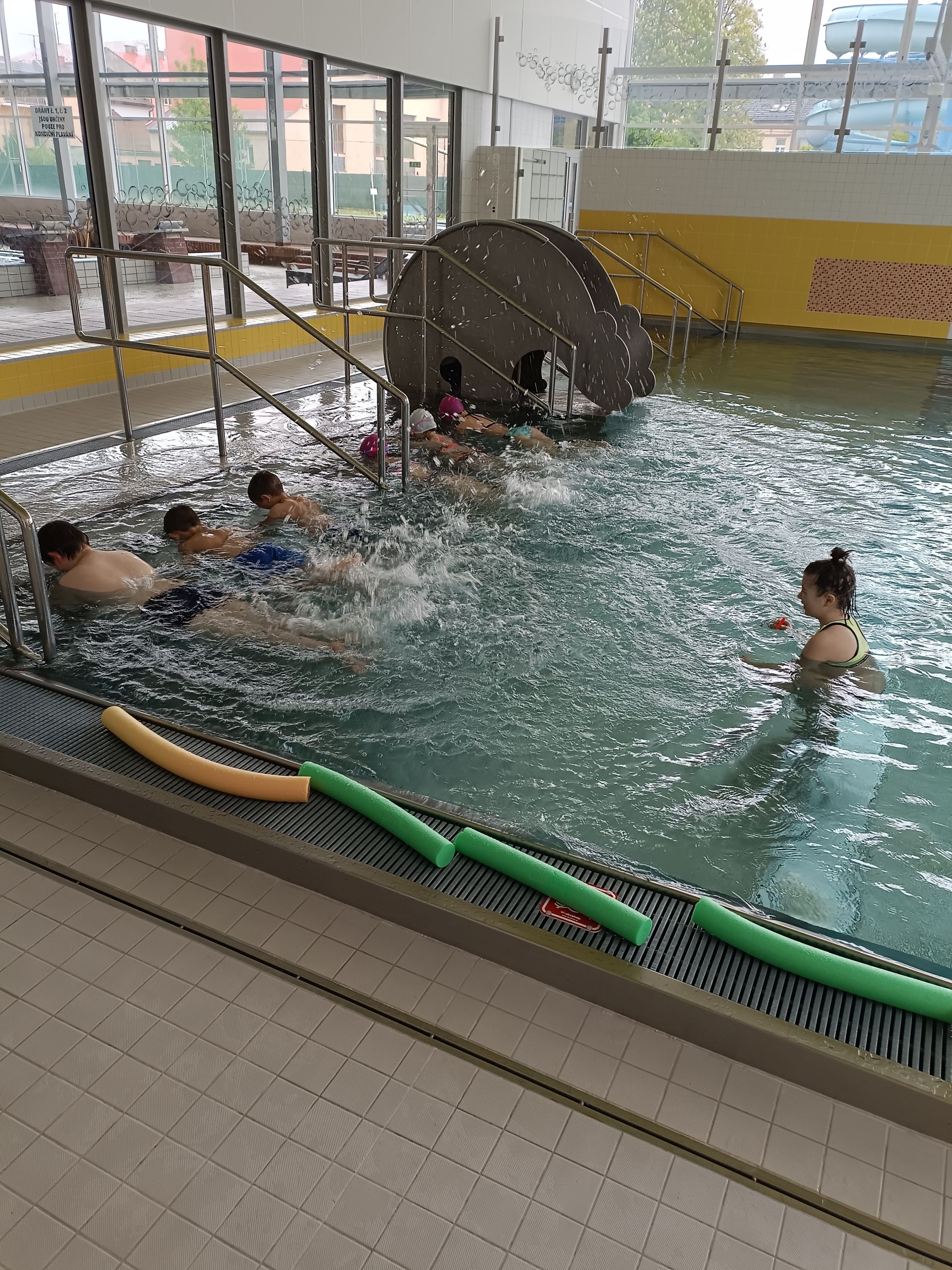 Voda a samá voda. Malí krokodýli plavou, skáčou a dovádějí. Velký bazén už zvládáme na celou délku kraulem, znakem. Skáčeme šipku a bombu. Některé děti si chtěly vyzkoušet i pozici paní učitelky. Vzaly si na starost rozplavbu. Zkoušíme různé způsoby potápění, skákání a plavání na rychlost. Hodinu plavání zakončujeme volnou zábavou, bublinky, trysky a skluzavka je odměnou za pilnou práci dětí.