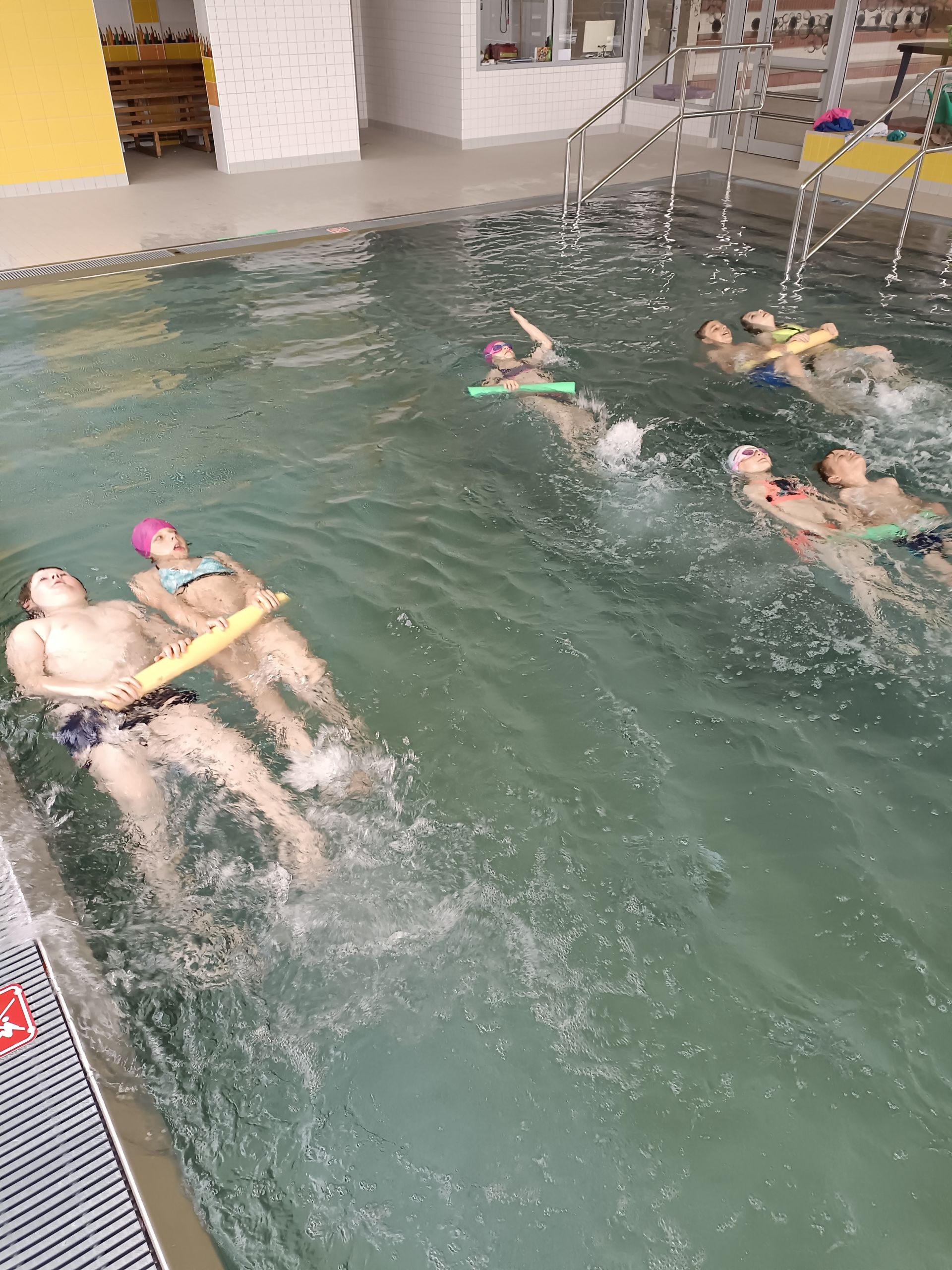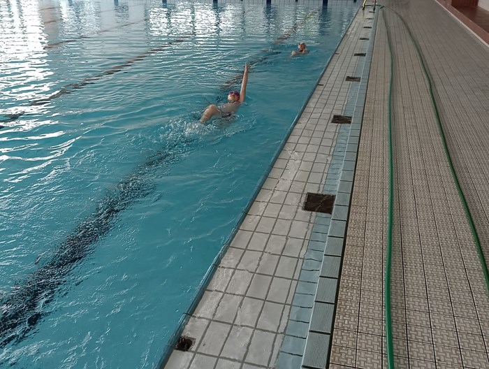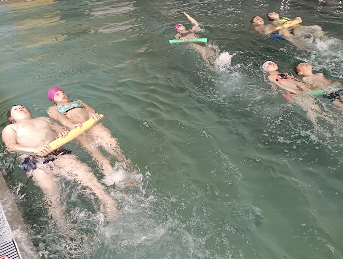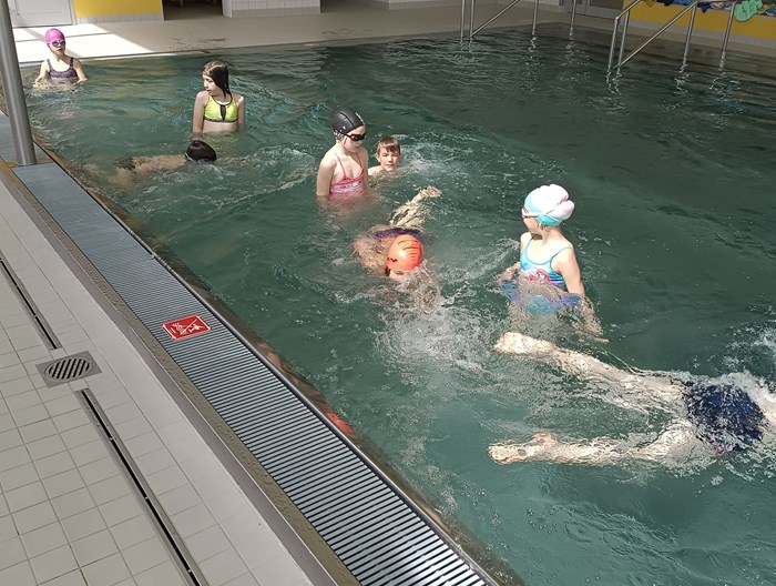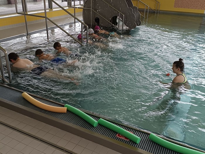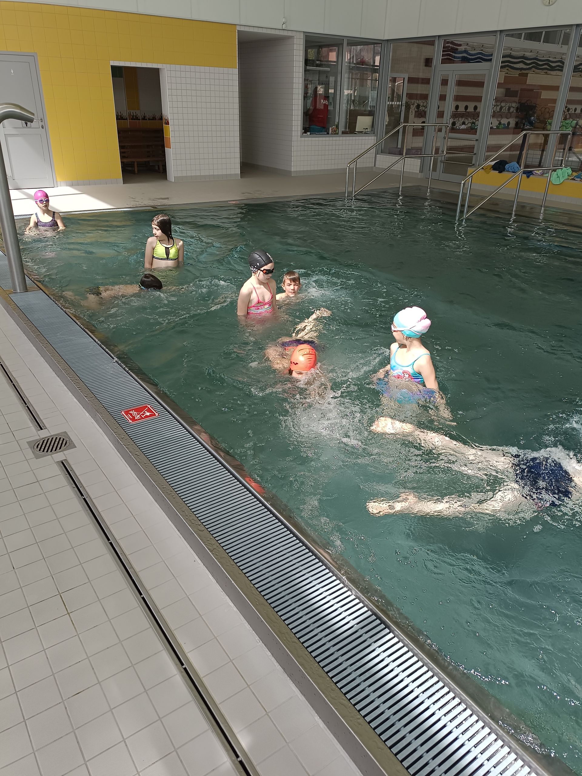 Voda a samá voda. Malí krokodýli plavou, skáčou a dovádějí. Velký bazén už zvládáme na celou délku kraulem, znakem. Skáčeme šipku a bombu. Některé děti si chtěly vyzkoušet i pozici paní učitelky. Vzaly si na starost rozplavbu. Zkoušíme různé způsoby potápění, skákání a plavání na rychlost. Hodinu plavání zakončujeme volnou zábavou, bublinky, trysky a skluzavka je odměnou za pilnou práci dětí.