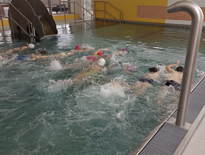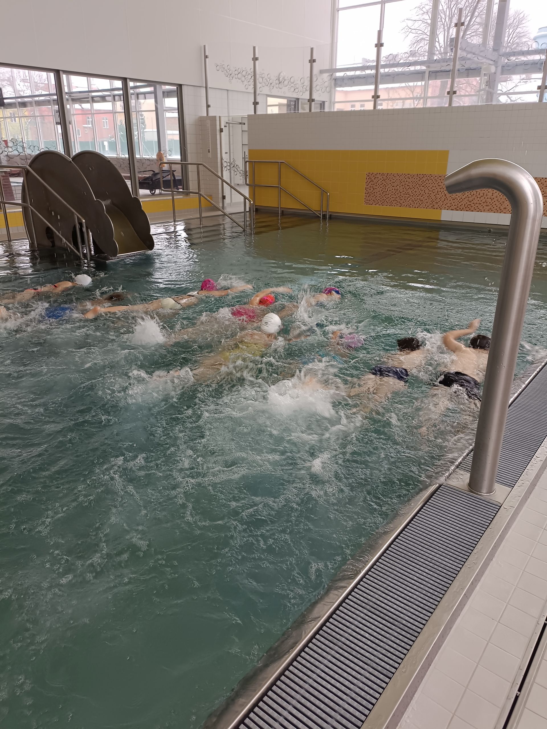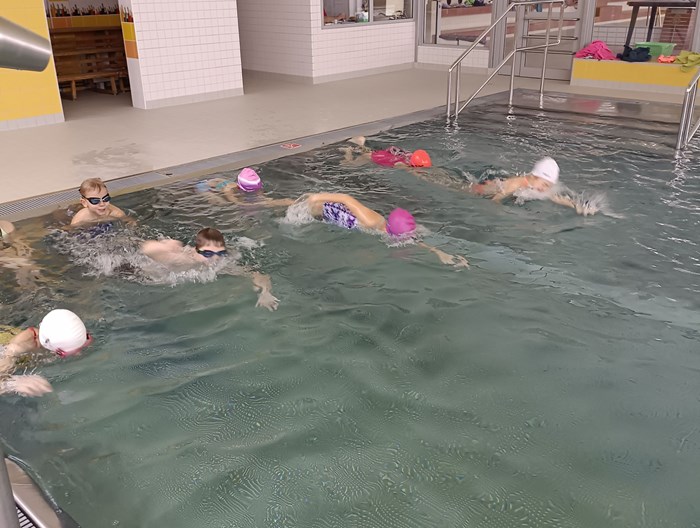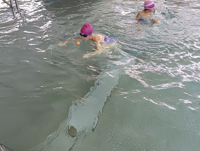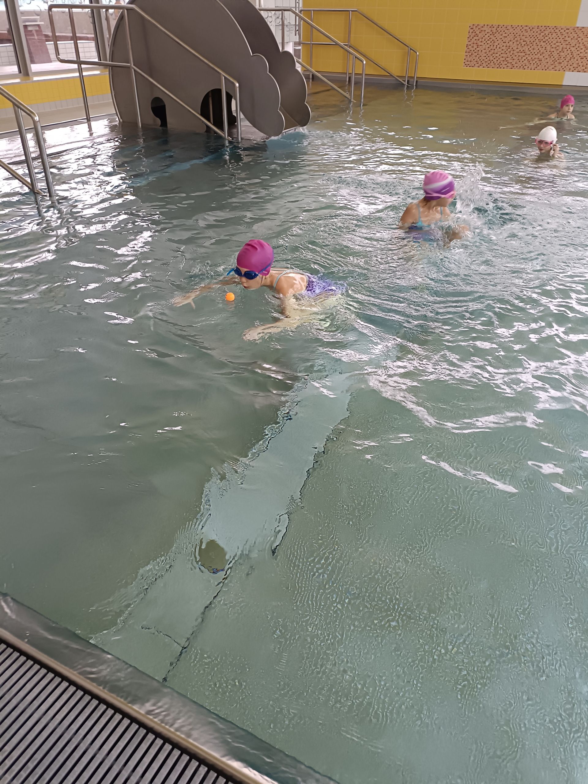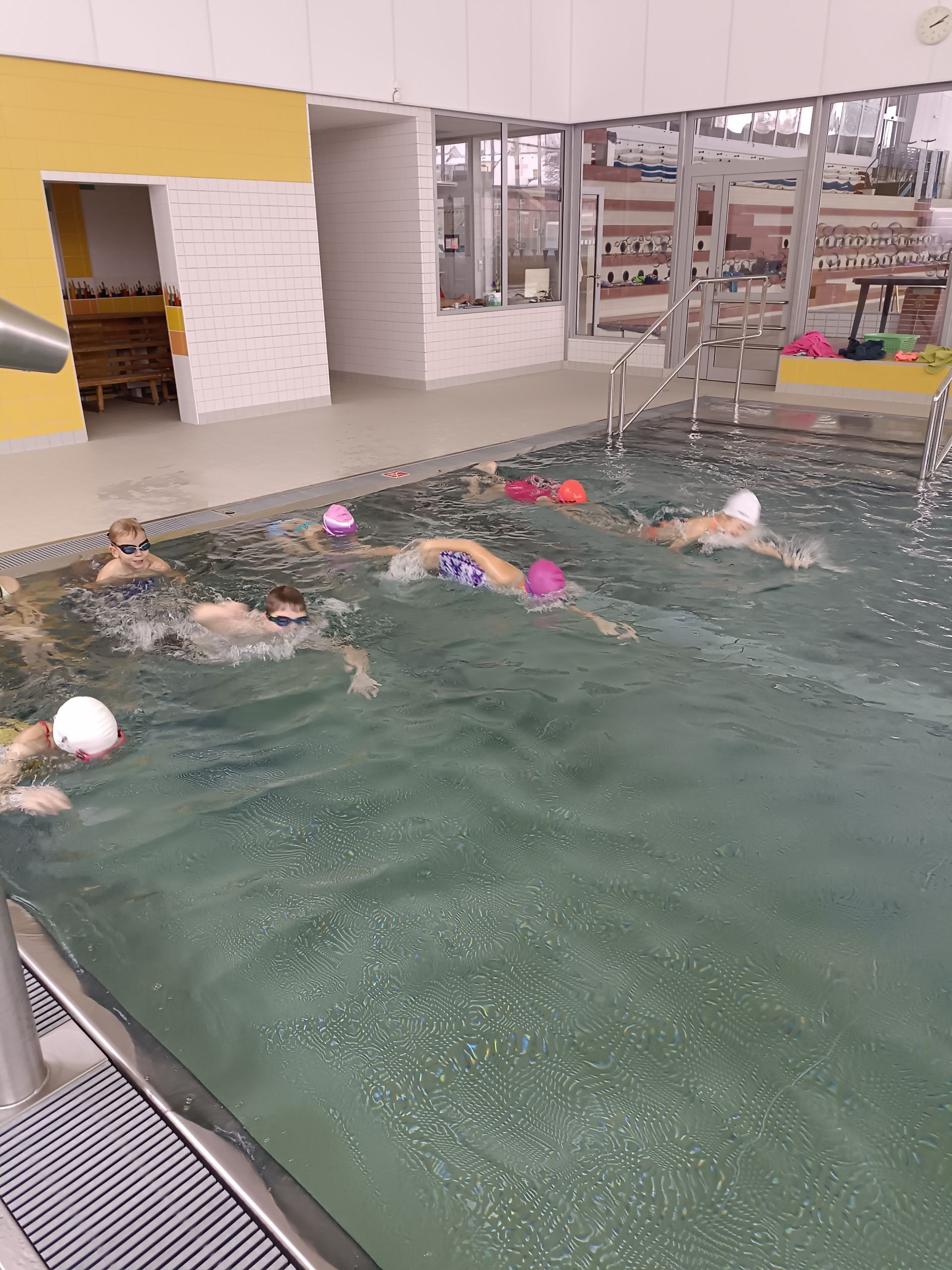 Máme se sebou 10 lekcí. Počasí si pro nás připravilo pořádnou rozcvičku cestou na vlak. Malí krokodýli se nenechali zastrašit. Přeplavat velký a malý bazén již zvládají skoro bez zastavení. Lovení a chytání rybiček ve velkém bazéně byl další z těžkých úkolů. Velká pochvala za pokroky a jejich píli.