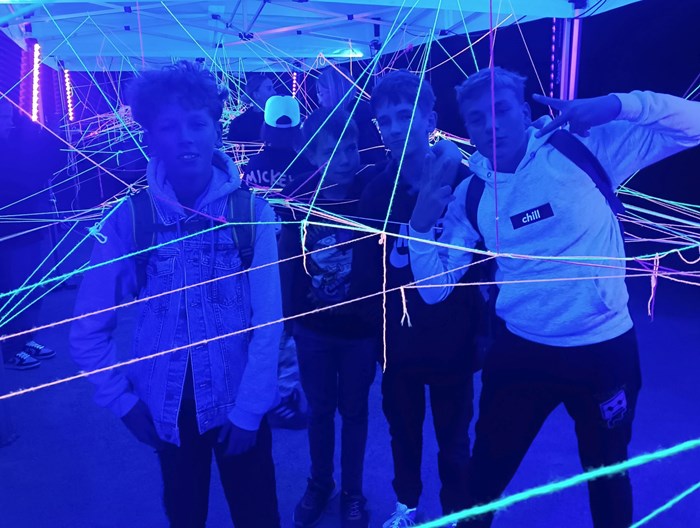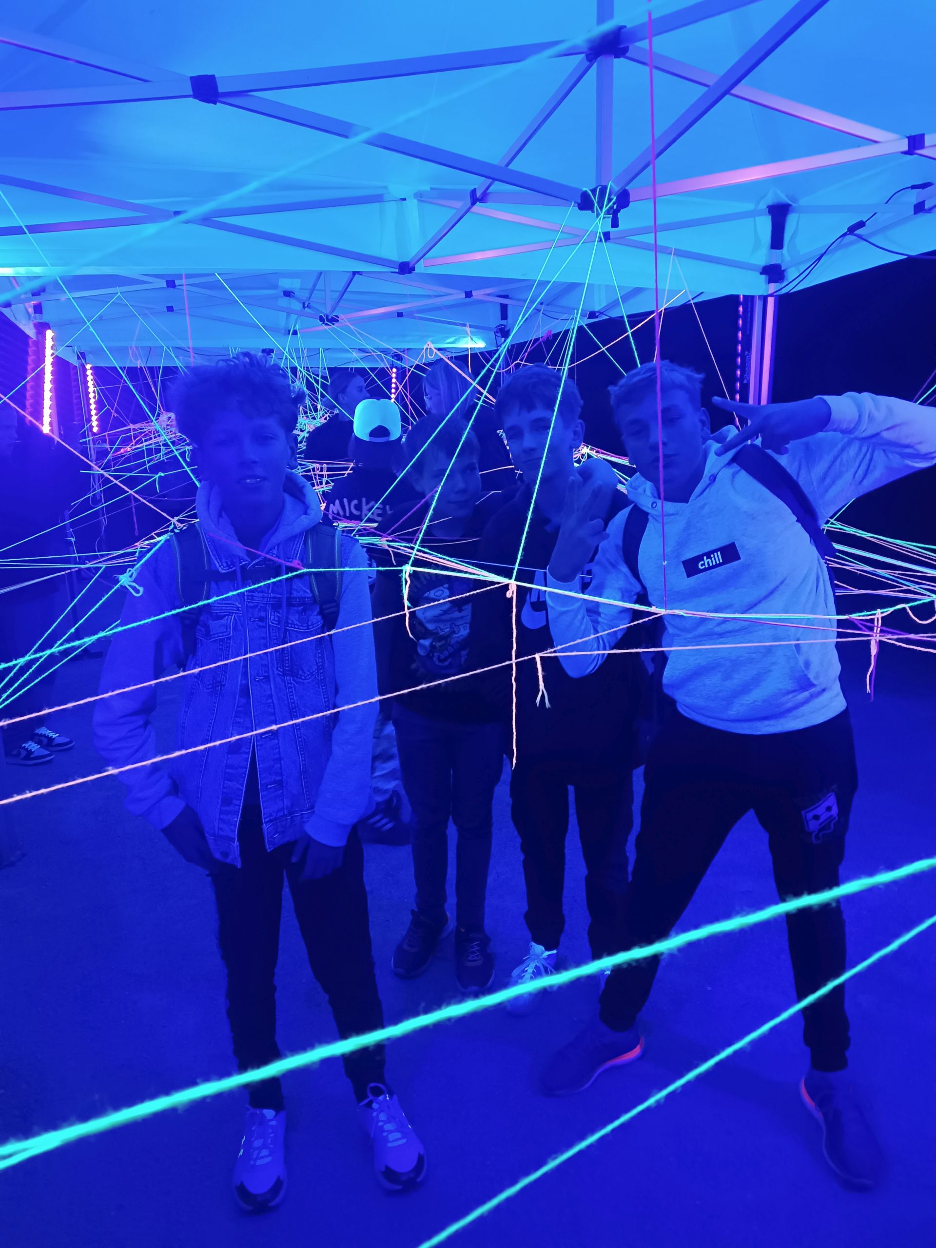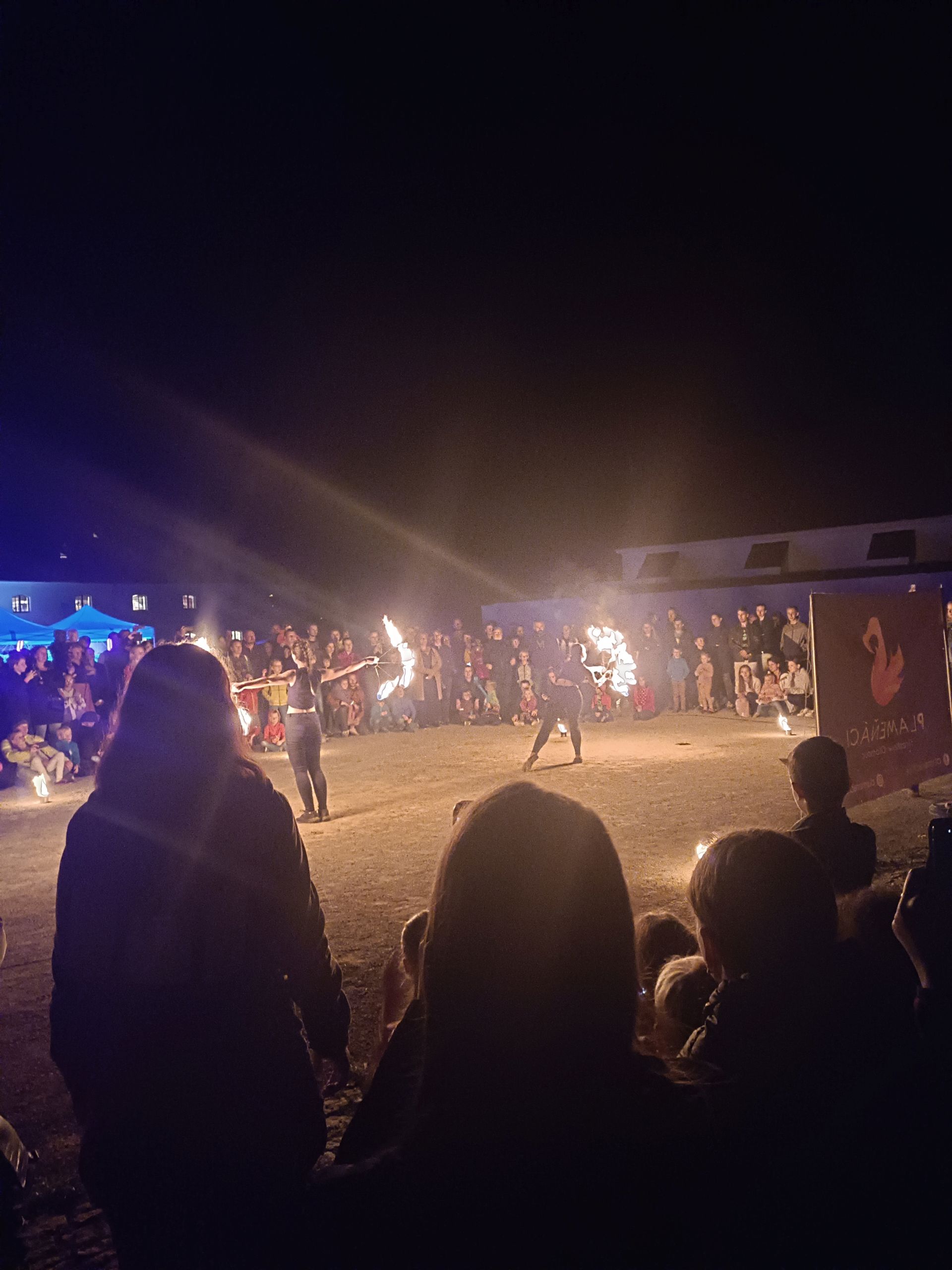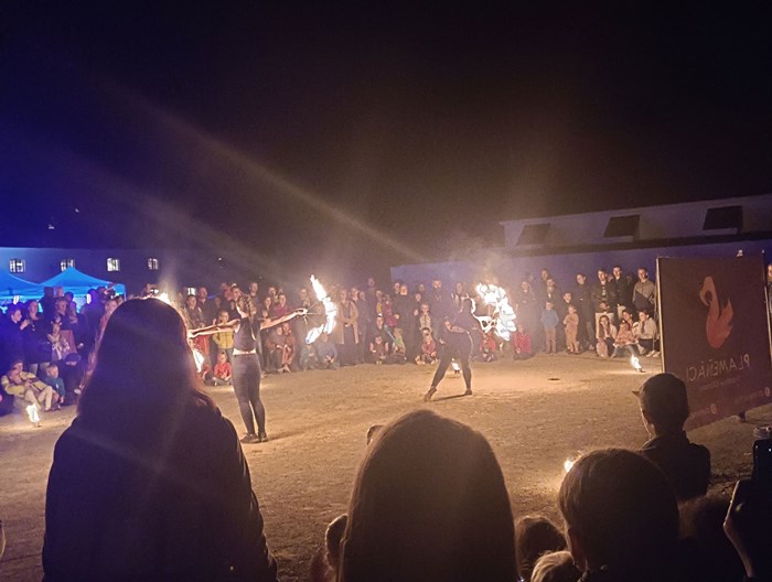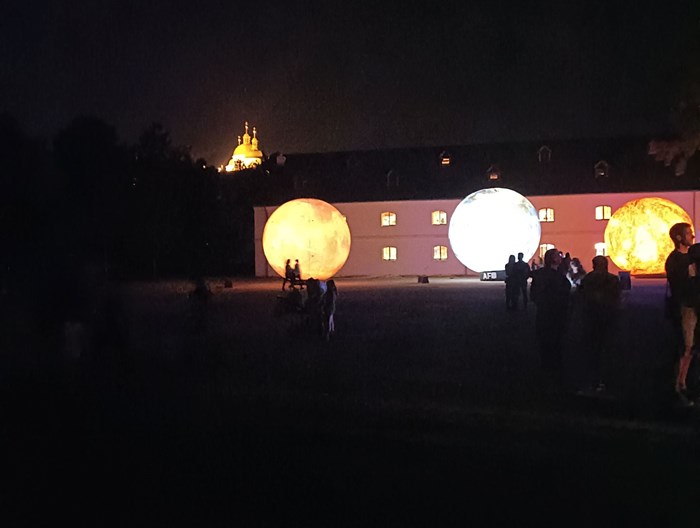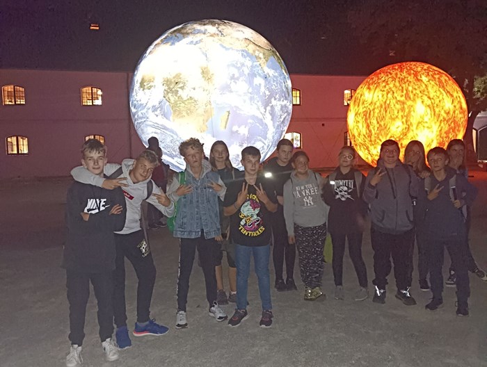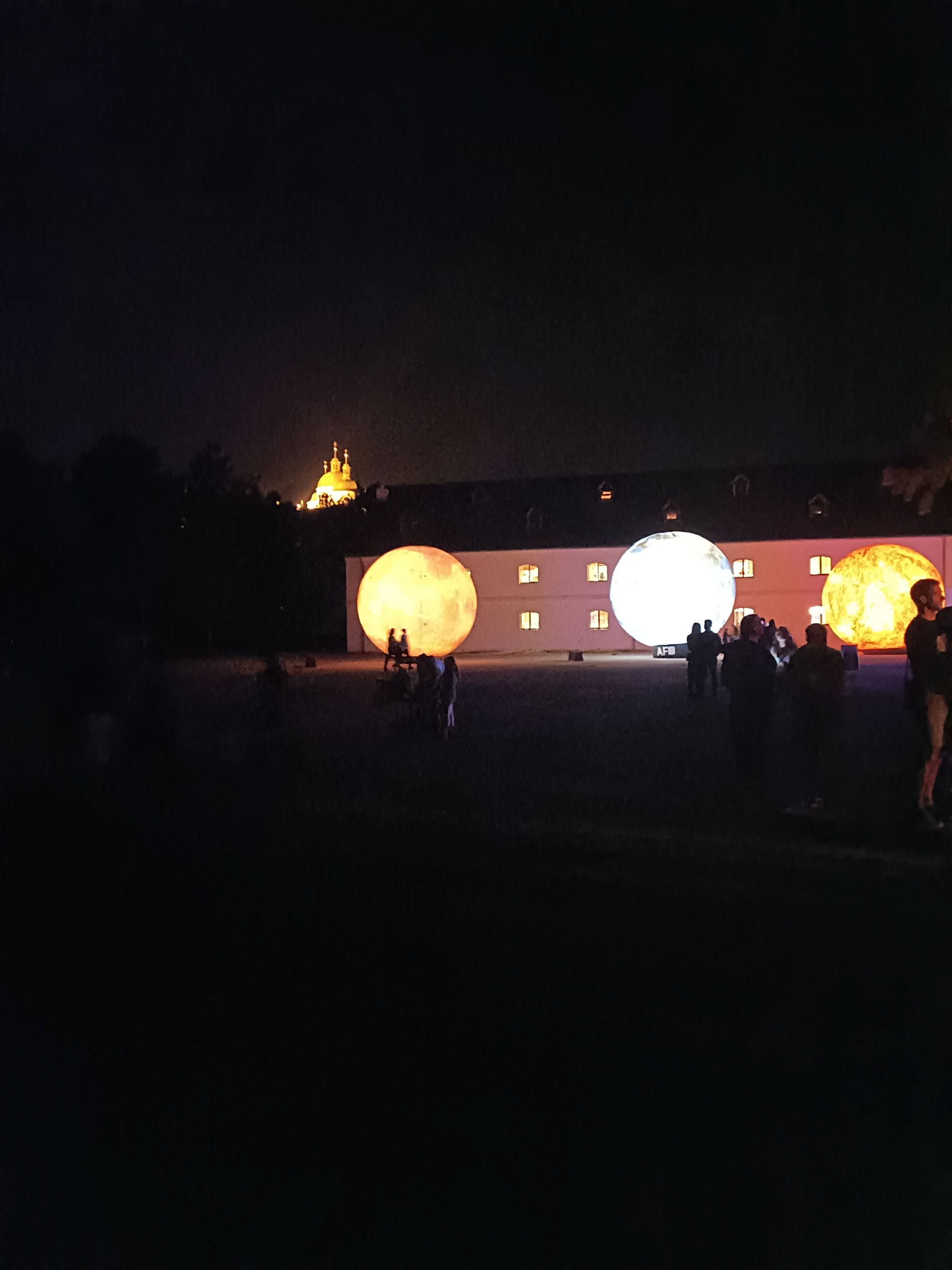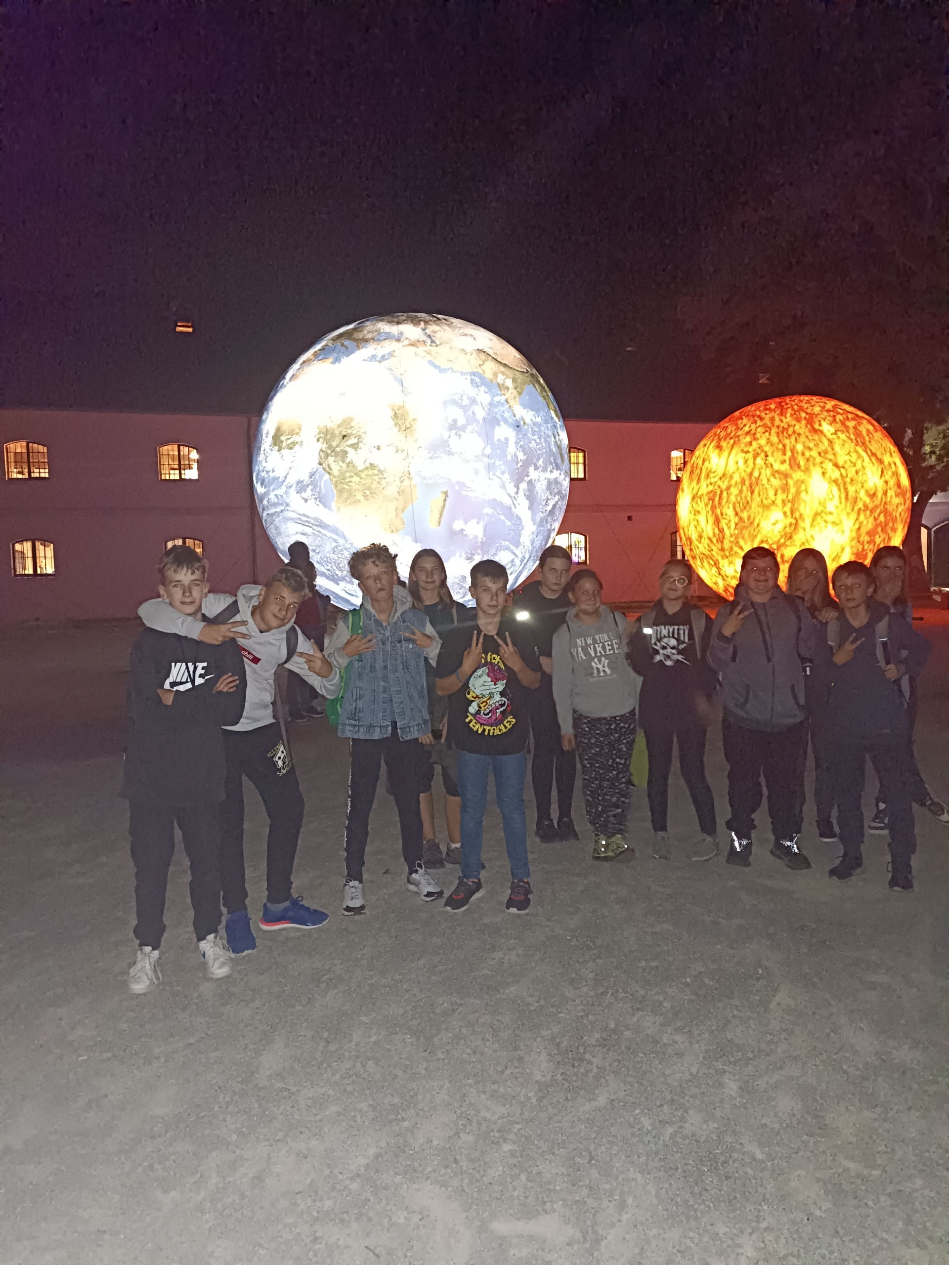Druhé zastavení se nacházelo pěší chůzí cca 15 minut od fakulty - Pevnost poznání. Z dálky byly vidět obří planety a ohnivá show. Nadživotní velikosti hub a doprovodný hudební program.