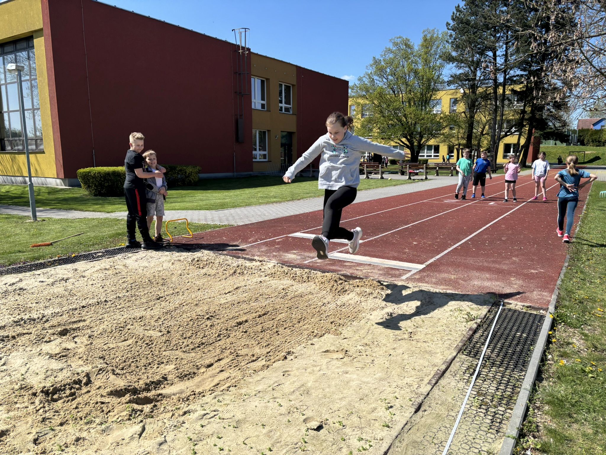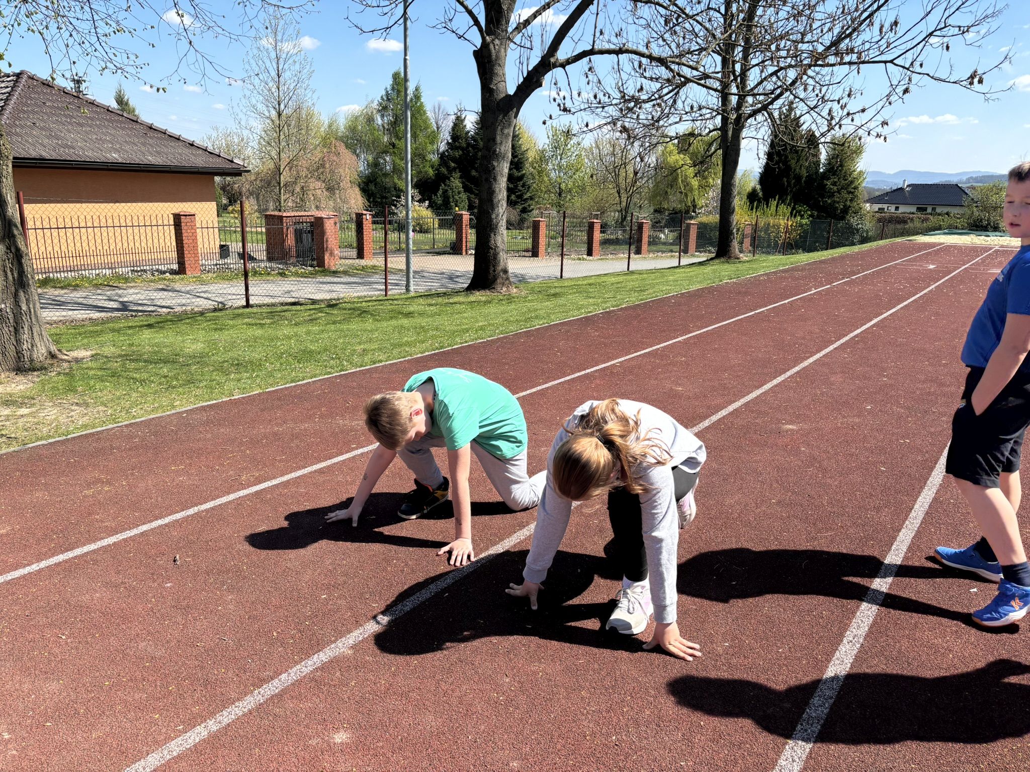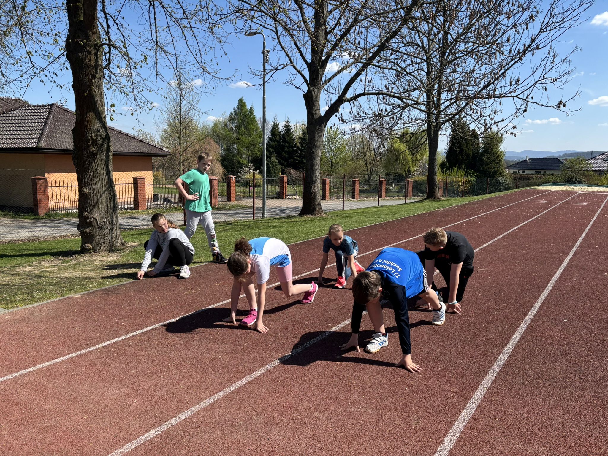 Začali jsme lehkým během na zahřátí, pokračovali běžeckou abecedou a poté sprinty. Následovala odrazová cvičení jako průprava na skok daleký, kde si děti vyzkoušely dopad do telemarku.