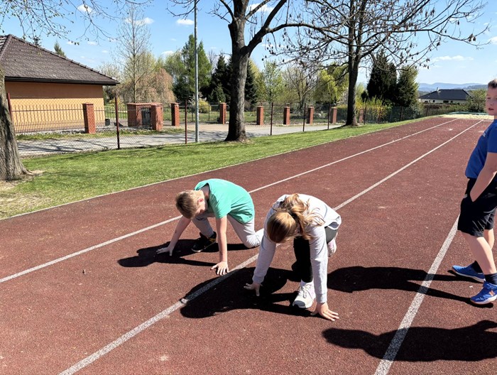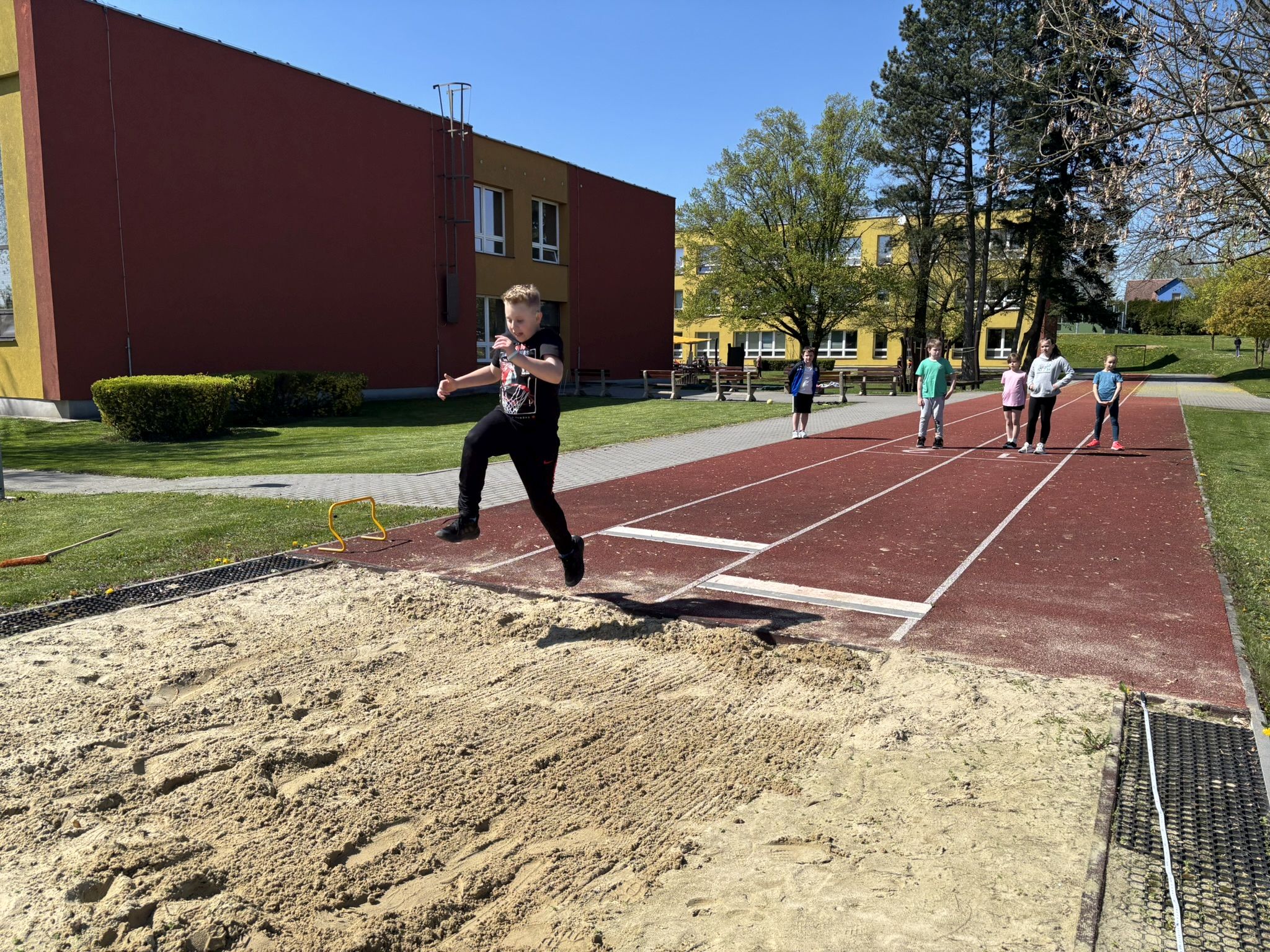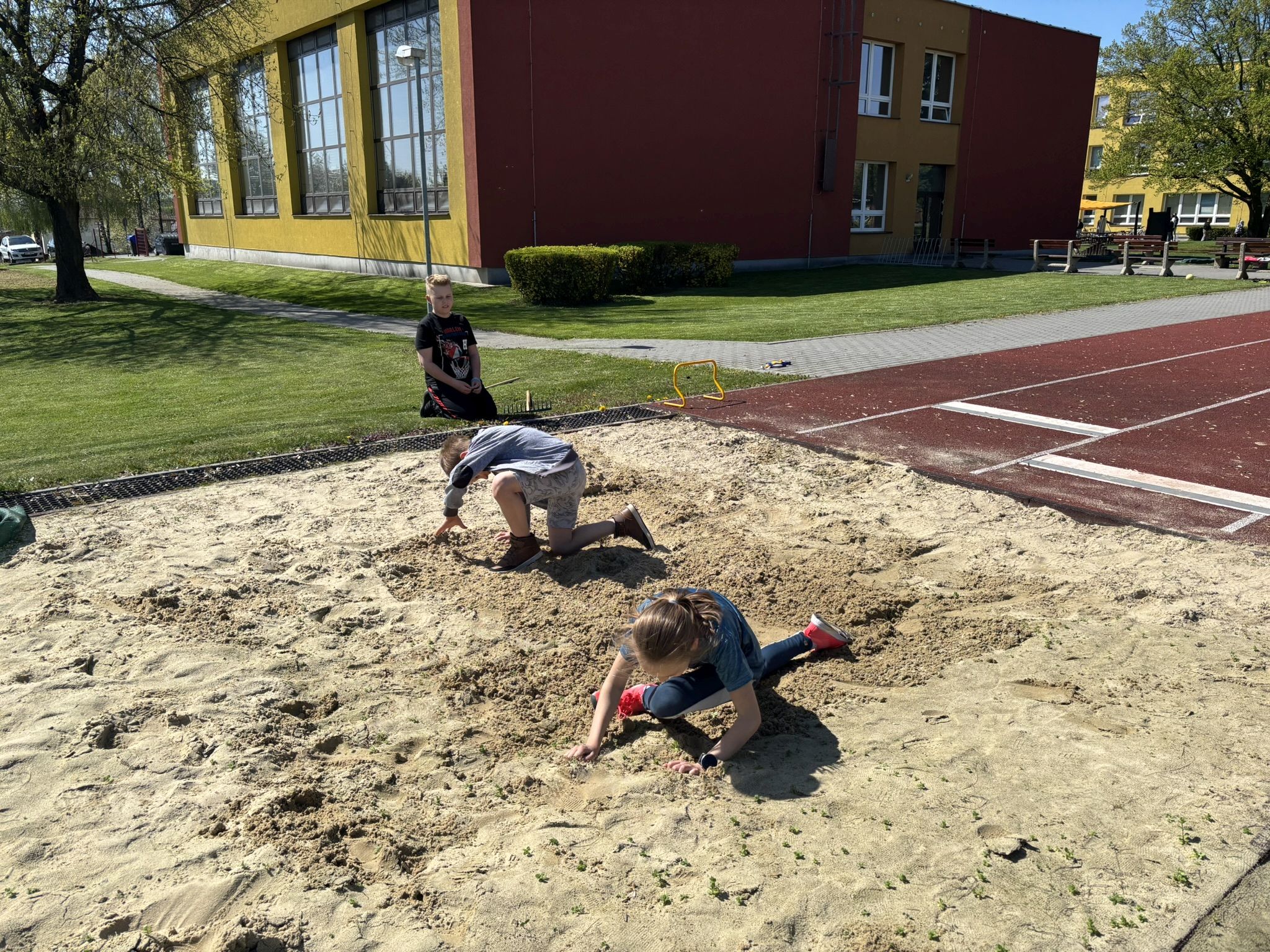 Začali jsme lehkým během na zahřátí, pokračovali běžeckou abecedou a poté sprinty. Následovala odrazová cvičení jako průprava na skok daleký, kde si děti vyzkoušely dopad do telemarku.