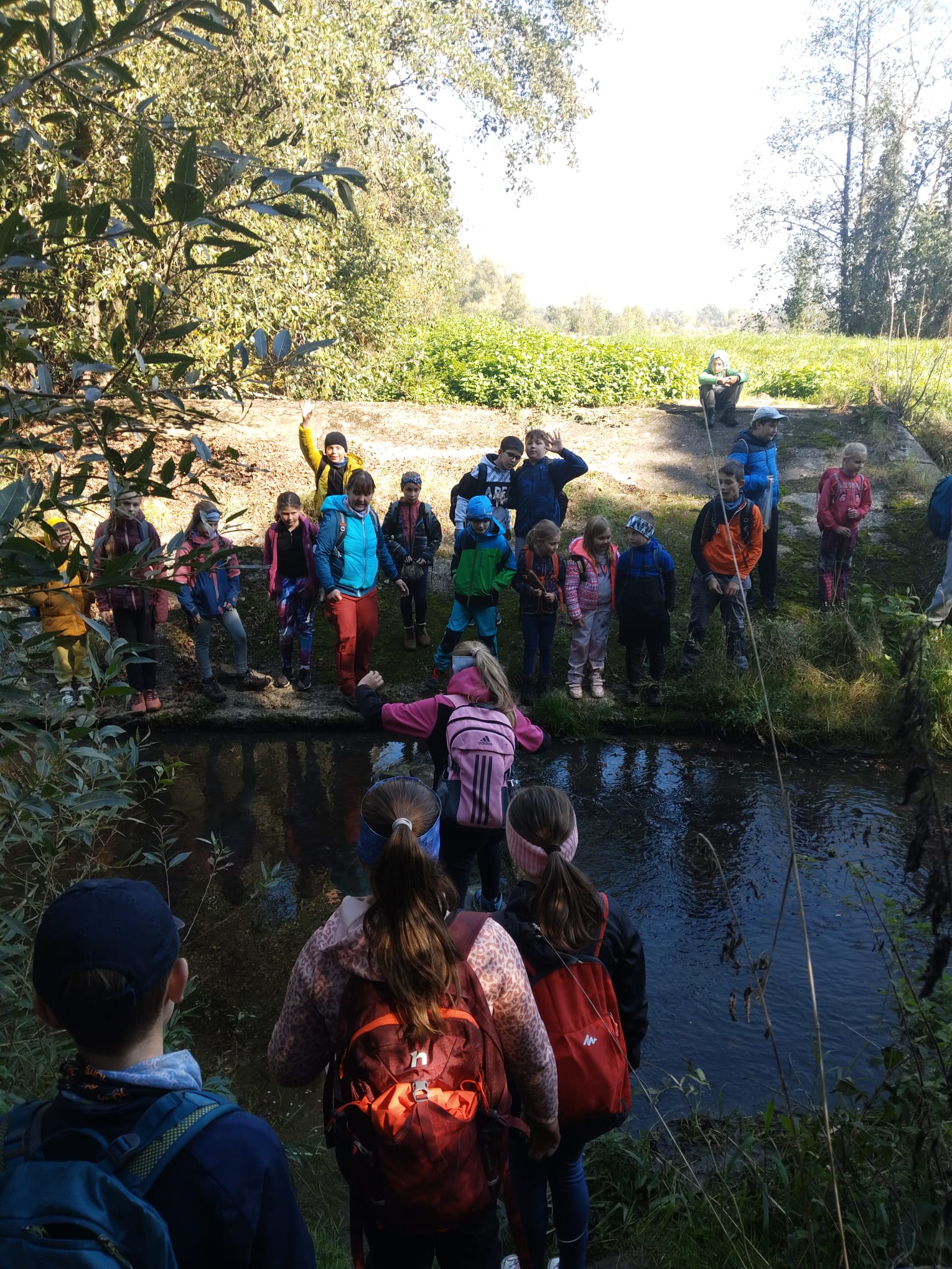 Nechybělo ani malé dobrodružství a to, když jsme museli přeskočit potok za pomoci improvizovaného mostu. Šli jsme cestou necestou, lesem i loukou, kde byla tráva tak vysoká, že dětem čouhaly jen hlavy. Také kolem rybníků, které lemovalo rákosí a všude šel slyšet zpěv ptáků.