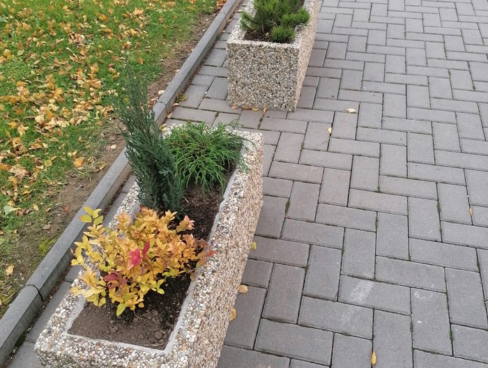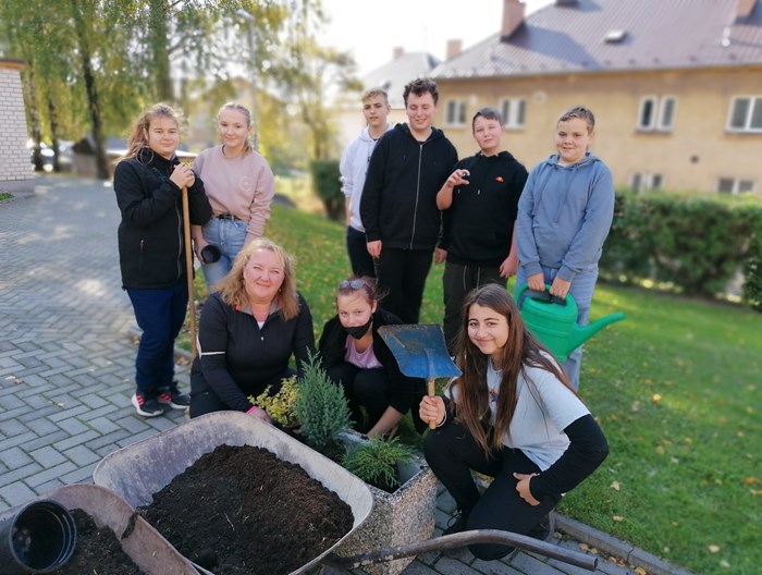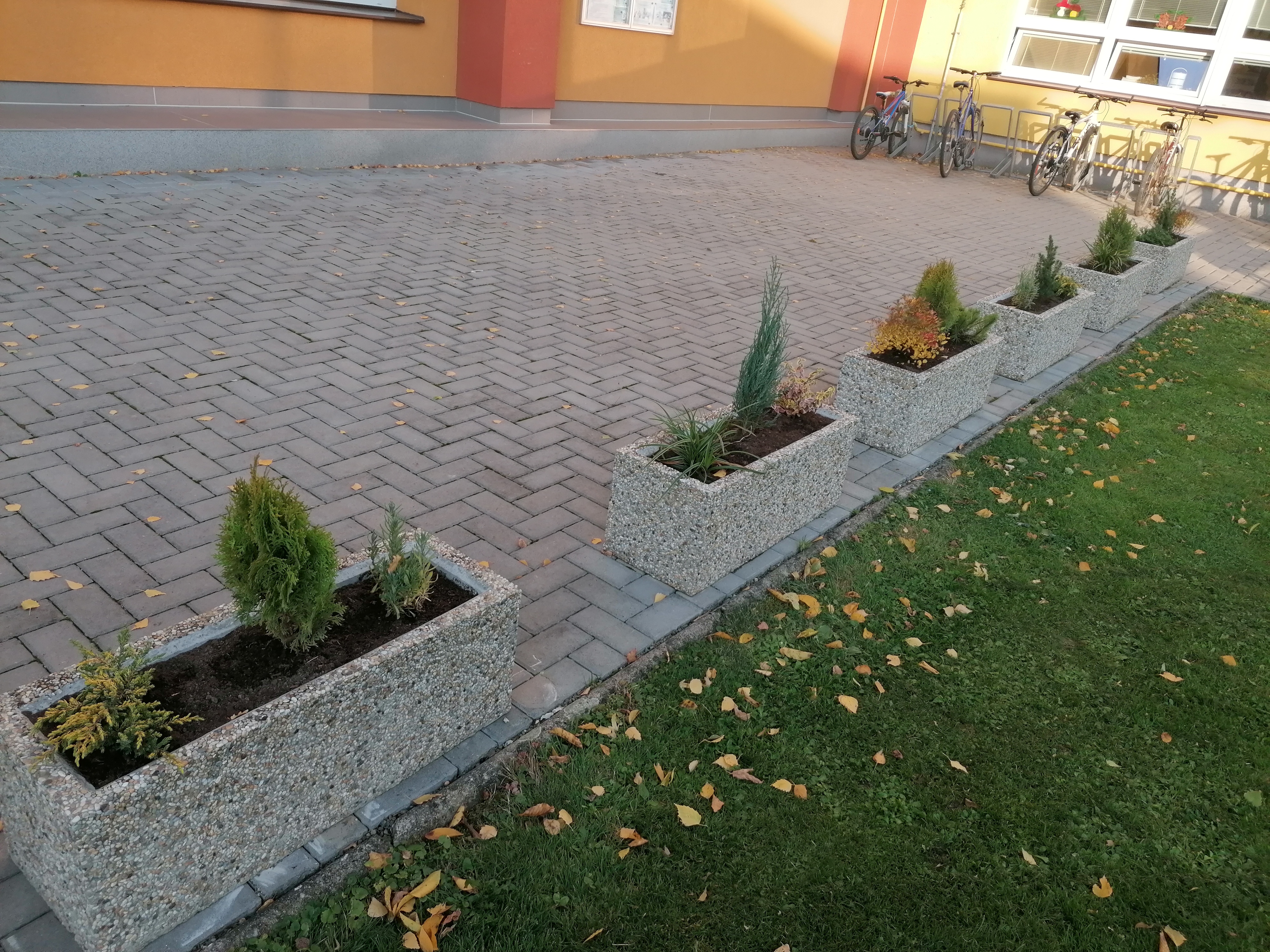 Na začátku letošního podzimu jsme se s žáky 8.třídy, v doprovodu paní učitelky, pustili do sázení venkovních truhlíků. S pomocí ochotných květinářek ze Suchdolu nad Odrou a Jerlochovic, které nám vytvořily plán výsadby, jsme osázeli jednotlivé květináče širokým spektrem rostlin, od jehličnanů přes listnaté keře až k různým ozdobným travám.