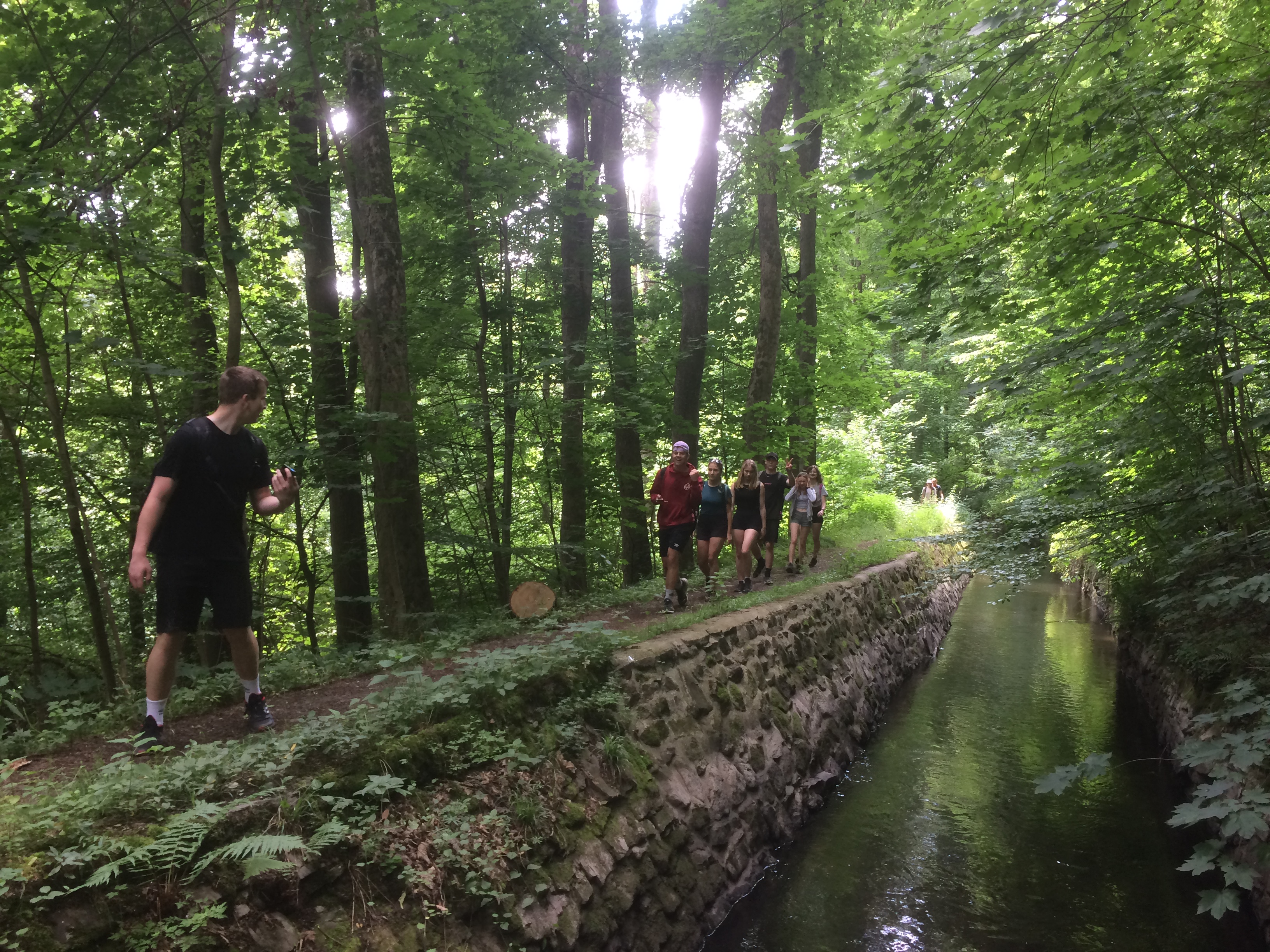 Ráno budíček 7:15, bohatá a chutná snídaně formou švédského stolu, a hygiena a balení, zatímco já fičel autem do Vítkova koblížkům pro koblížky a podobné nesmysly, co si navymýšleli. Za hodku jsem byl zpátky a po dolepení všech puchýřů provizorní zdravotní sestrou Markétou jsme vyrazili dál po červené. Prošli jsme Podhradím, pokračovali Aninným údolím a neznačenou zkratkou zafičeli do lesa. Nějakým záhadným způsobem to zase skončilo šplháním do prudkého kopce a houštinami, ale zdálo se mi, že už to nikomu nevadí. U Papírenského splavu jsme slezli na Weisshuhnův kanál a po jeho bočnici šlapali asi kilometr, mírně balancujíc mezi dvoumetrovým pádem do kanálu či pětimetrovým pádem ze srázu, všichni si ale nakonec zvolili zlatou střední cestu.