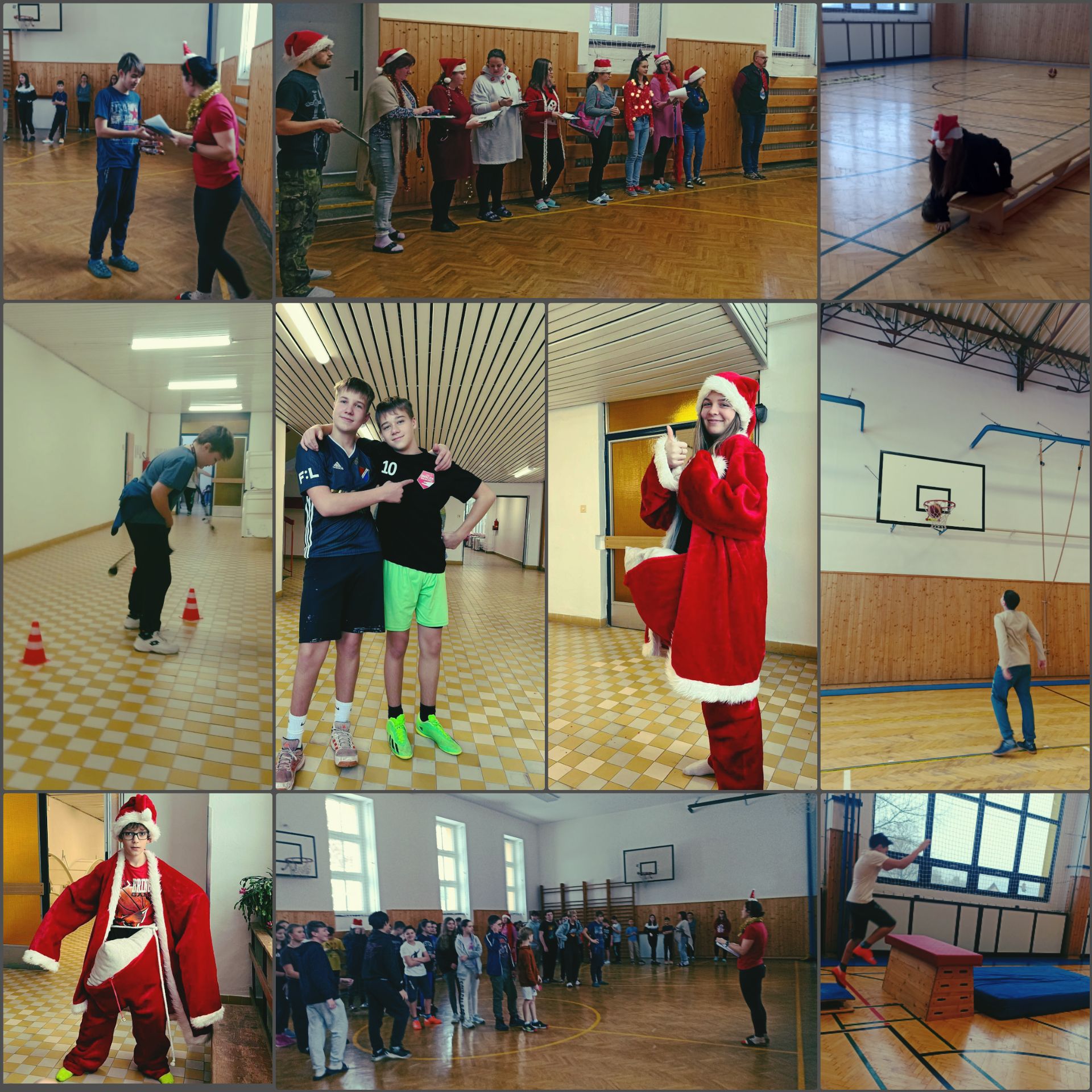 Poslední školní den roku 2022 žáci druhého stupně zakončili společným sportovním dopolednem, které se neslo ve vánočním duchu. Prostory školy se proměnily ve sportovní bojiště, které vyplnilo 12 stanovišť. Na každém stanovišti se střídali žáci z jednotlivých tříd a plnili různé disciplíny, které prověřily jejich pohybovou všestrannost - rychlost, sílu, koordinaci i vytrvalost. Po společném zahájení v tělocvičně, kde jednotlivé třídy, včetně učitelského sboru, předvedly svůj nacvičený pokřik, se den sportu rozjel naplno. A jak to všechno dopadlo? Vítězů bylo spousta. Po sečtení všech výsledků byla za každou třídu vyhodnocena nejlepší dívka a nejlepší kluk s největším počtem bodů a zároveň se hodnotil nejlepší výkon dívky, kluka v každé disciplíně. Pro vítěze byla připravena drobná odměna a diplom.