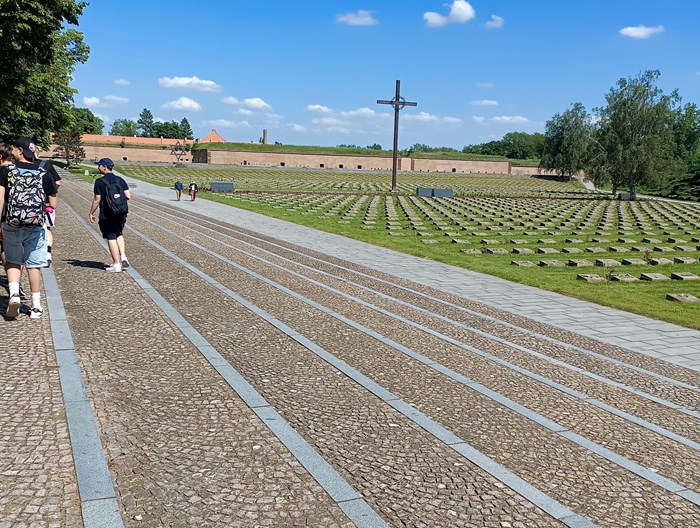 Ve čtvrtek jsme ranním vlakem vyrazili do matičky Prahy. Procházkou jsme došli na Václavské náměstí, kde byl menší rozchod na občerstvení. Odpoledním vlakem jsme se přesunuli do Terezína. Od vlakového nádraží až po Terezín jsme šli cestou, kterou museli absolvovat vězni. Před návštěvou expozice nám pan učitel sdělil něco o historii náhrobků před památníkem a k pravidlům průběhu celé exkurze. Poté nás čekal pan průvodce, který velmi živě vyprávěl o dění v tomto památníku. Mohli jsme si vyzkoušet cely, úplnou tmu a vměstnání 50 lidí do místnosti s jedním okýnkem. Nebylo to příjemné, ale člověk si tam uvědomil, co zažívali lidé, kteří tam byli vězněni. Po skončení prohlídky jsme se přesunuli na náměstí Terezína, kde jsme dostali menší rozchod před odjezdem na ubytování. Náročný den jsme zakončili „vykoupením“ nejbližšího obchodu.