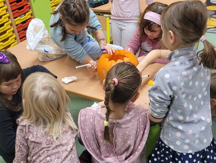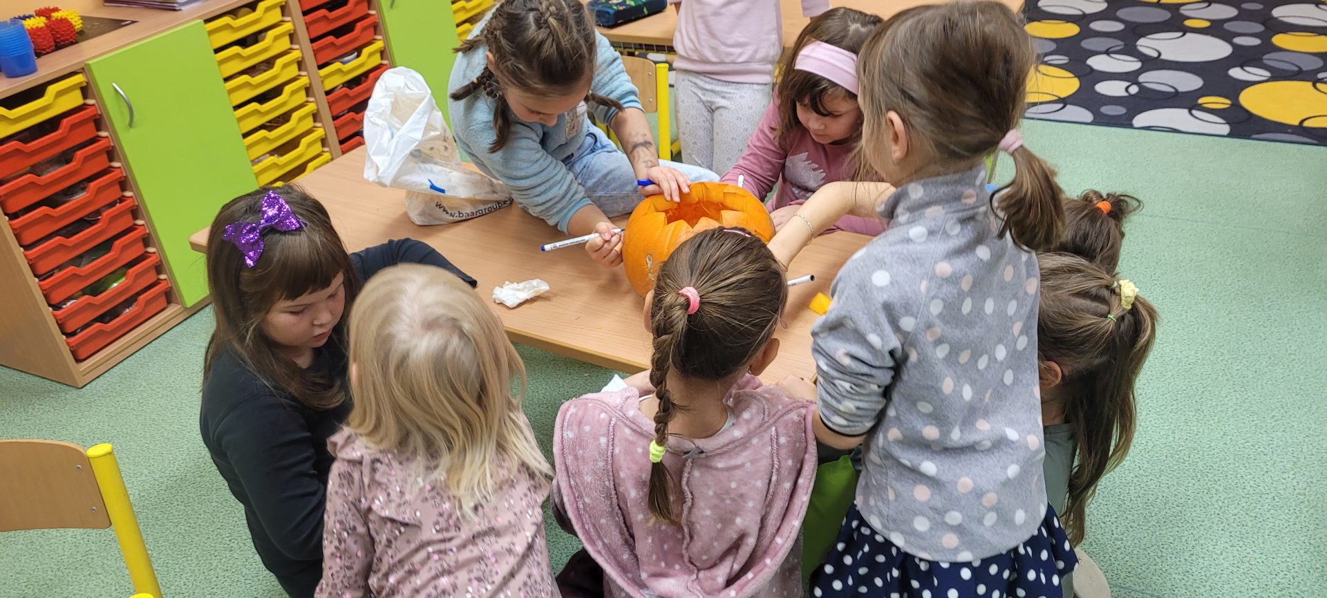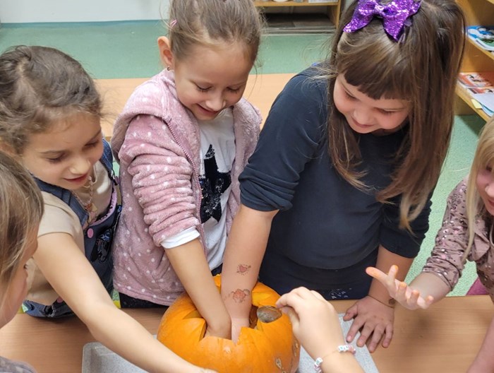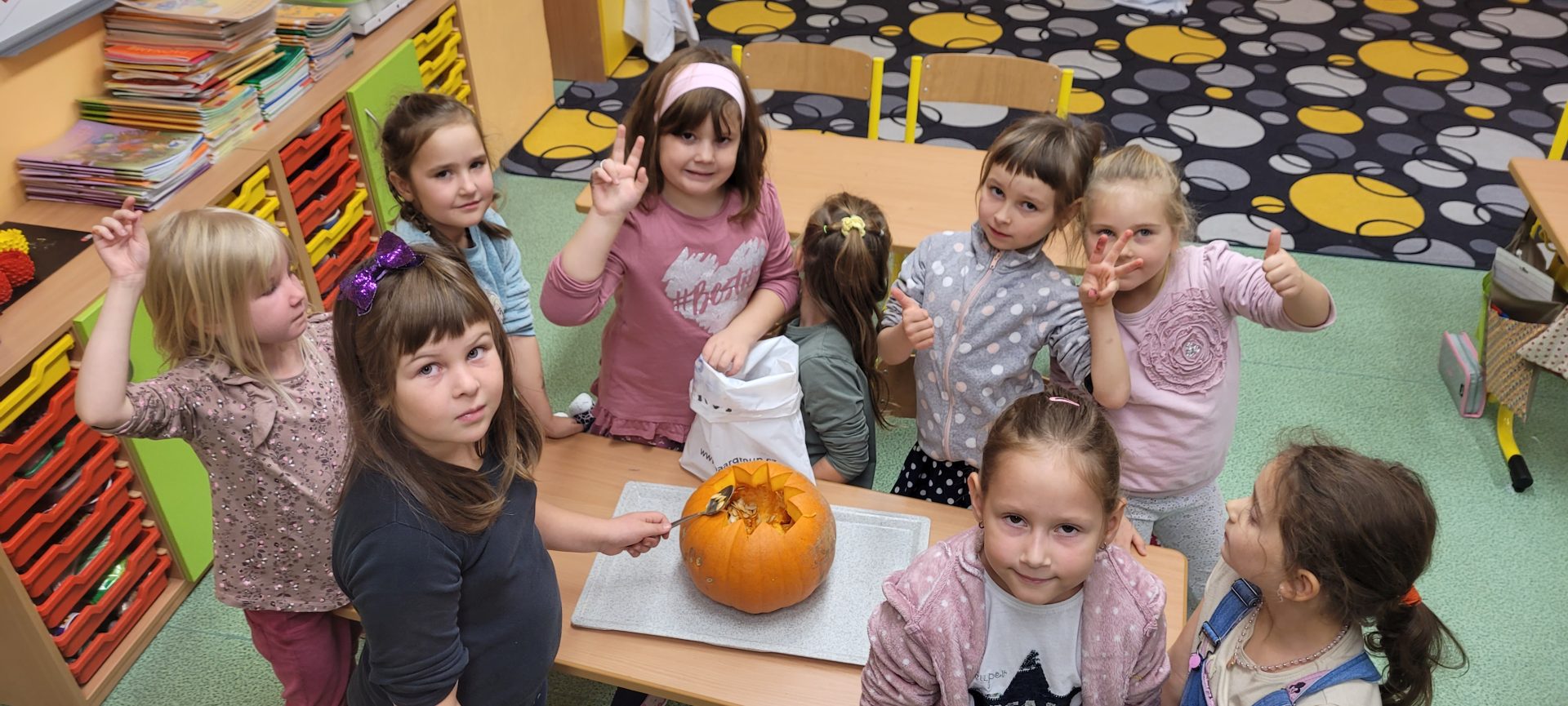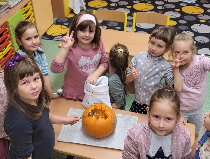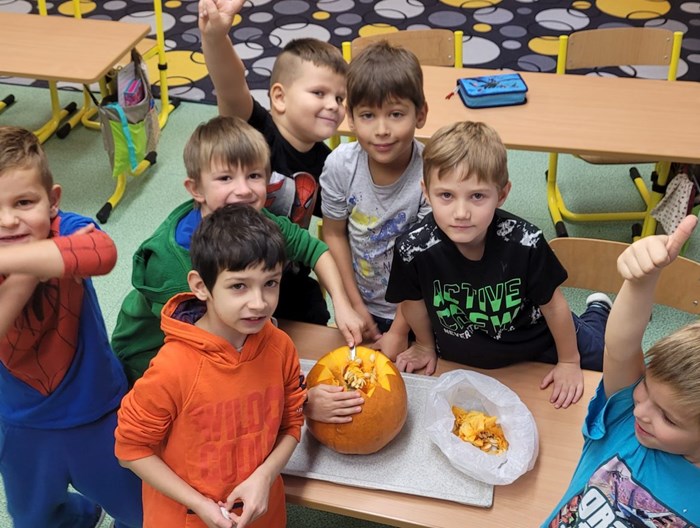 Po podzimních prázdninách si děti z 1.B zpříjemnily začátek nového týdne projektovým Halloweenským vyučováním. V českém jazyce vymotaly pavoučka z pavučinového bludiště a správně doplnily písmenka do křížovek, v matematice porovnaly množství strašidelných věcí a zkusily si některé sečíst. Pak následovalo dlabání dýně a výroba papírových duchů. Došlo i na sladkosti.
