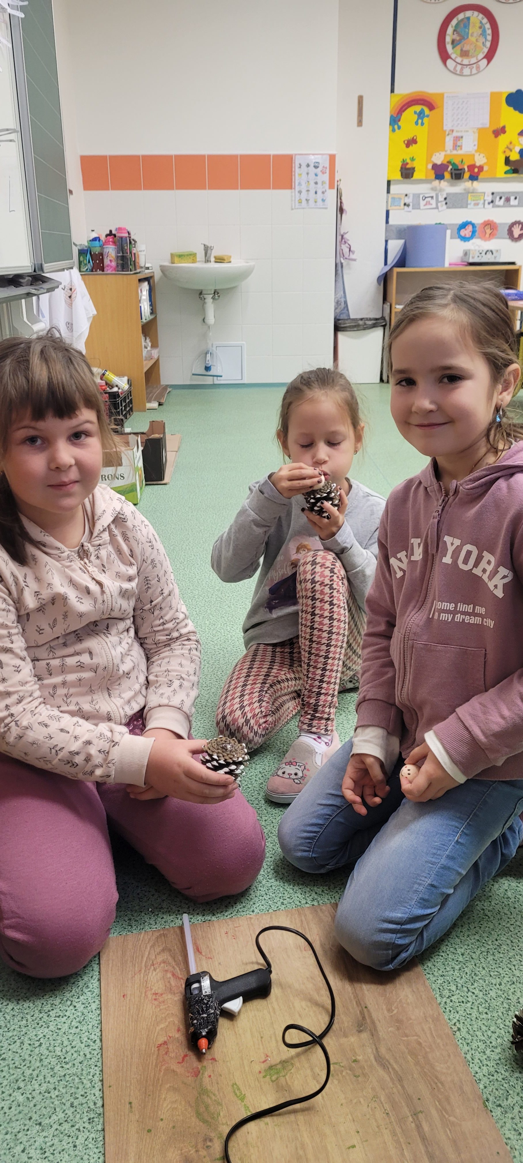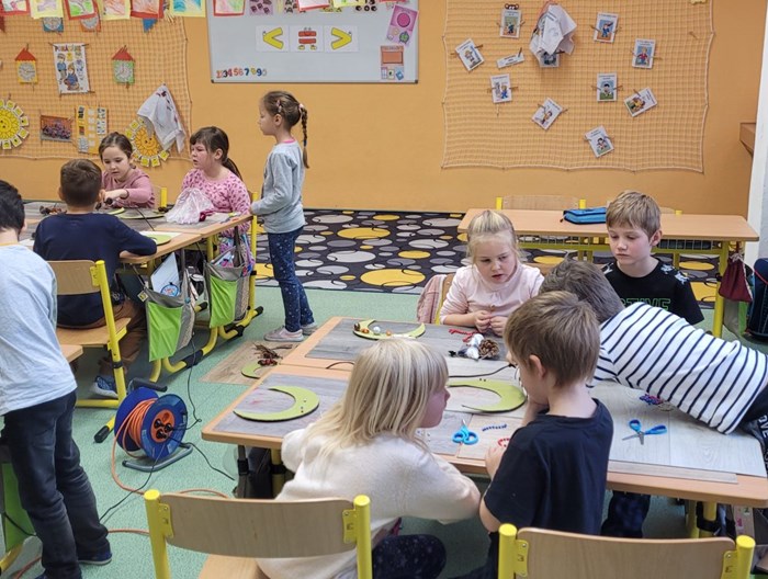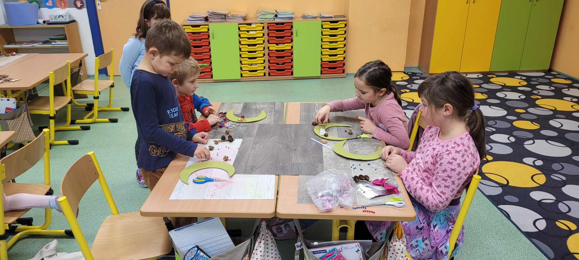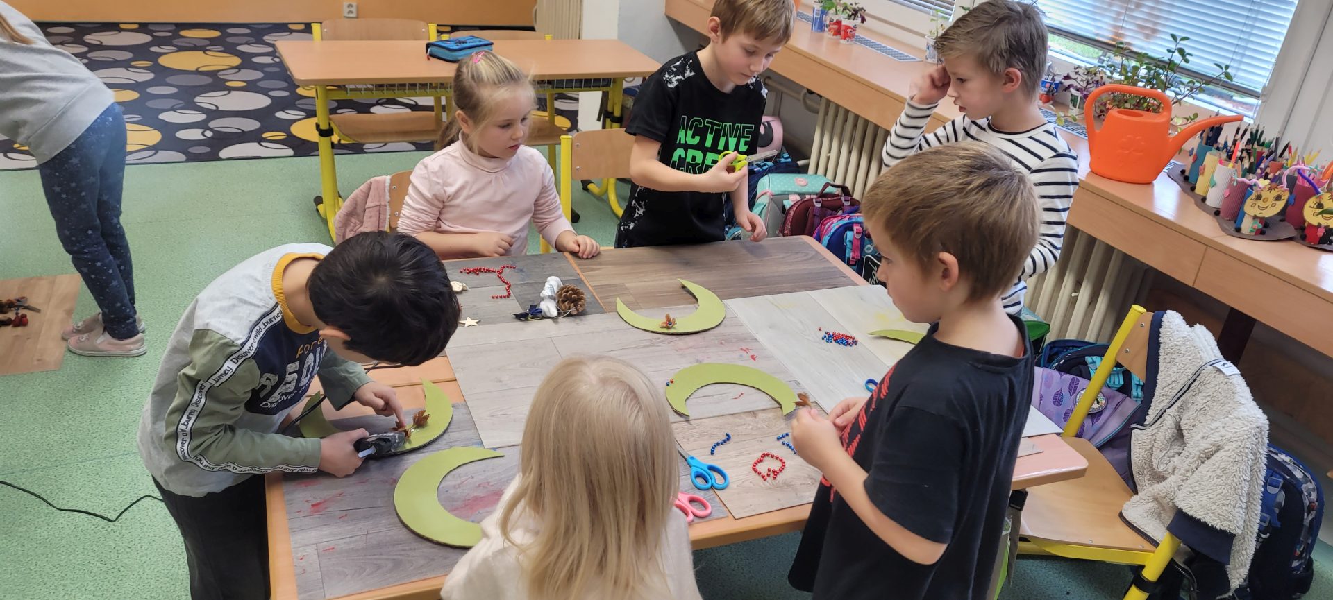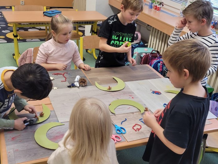 Děti z 1.B finišují s přípravou na jarmark. Stojánky na svíčky již mají nabarveny, hotov je i měsíčkový závěs na dveře, při kterém si někteří poprvé vyzkoušeli práci s tavnou pistolí. Skřítci mají na hlavách zimní čepice a i cukroví, při kterém pomáhaly maminky, je již upečeno. Je tedy vlastně hotovo. Tak se přijďte podívat.