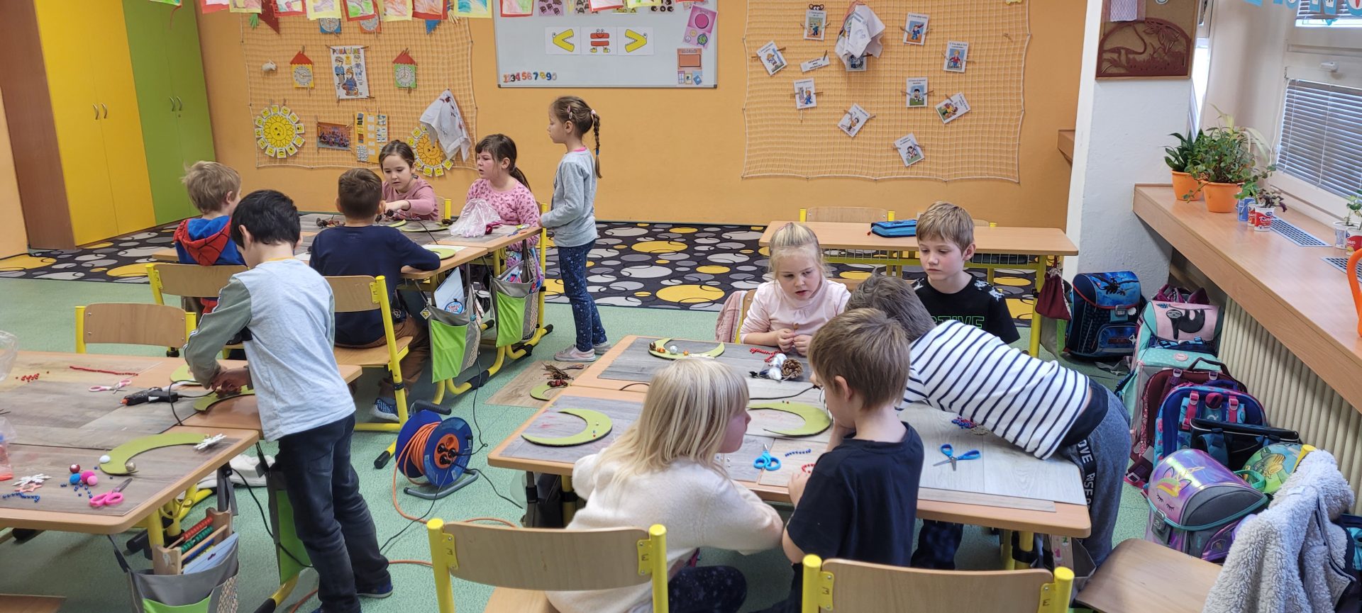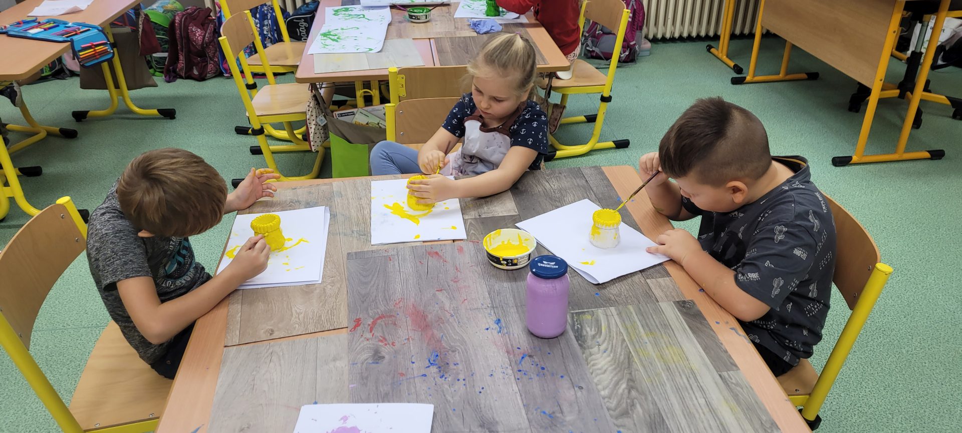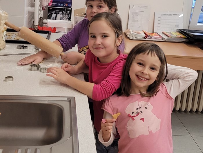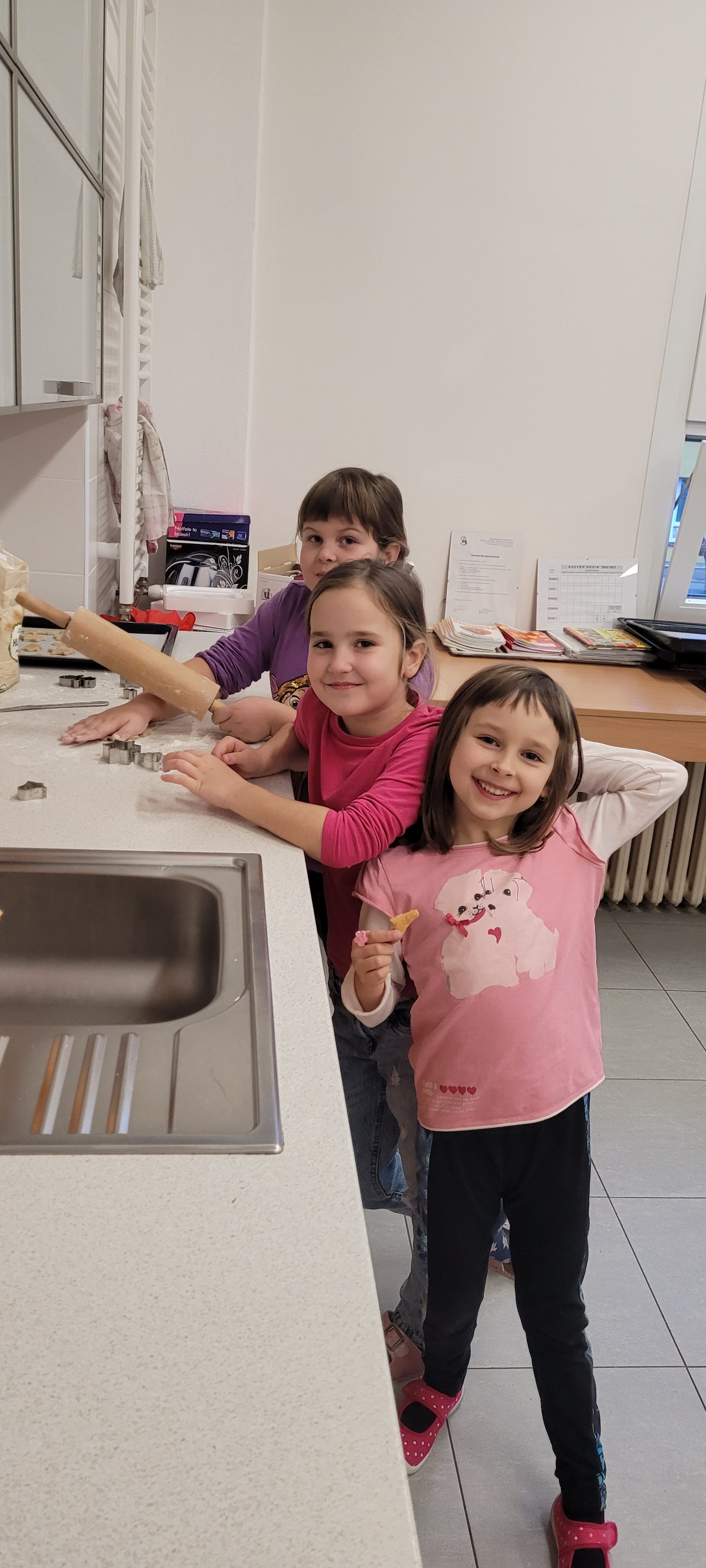Děti z 1.B finišují s přípravou na jarmark. Stojánky na svíčky již mají nabarveny, hotov je i měsíčkový závěs na dveře, při kterém si někteří poprvé vyzkoušeli práci s tavnou pistolí. Skřítci mají na hlavách zimní čepice a i cukroví, při kterém pomáhaly maminky, je již upečeno. Je tedy vlastně hotovo. Tak se přijďte podívat.