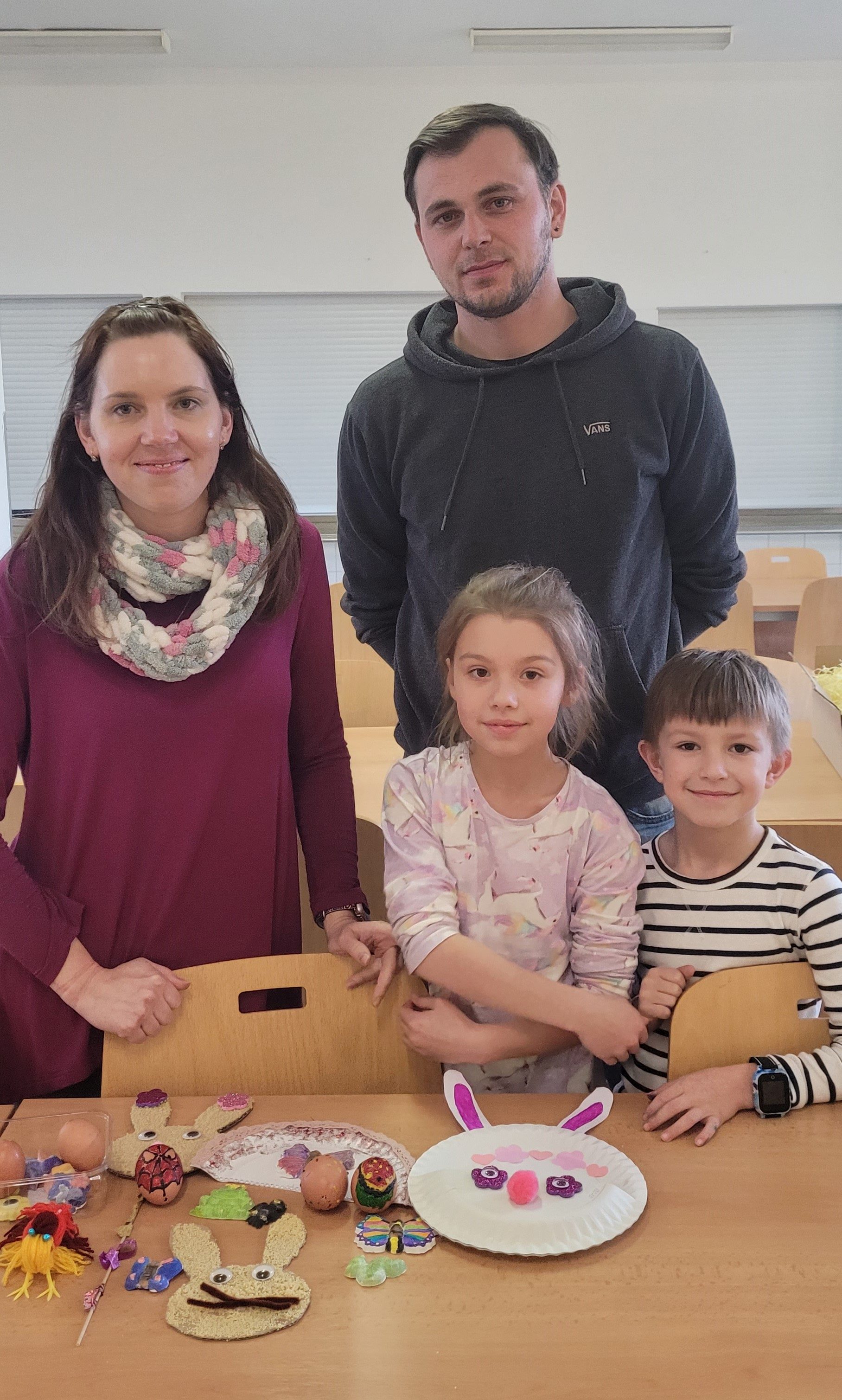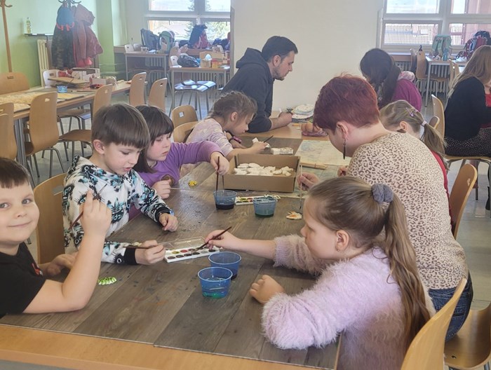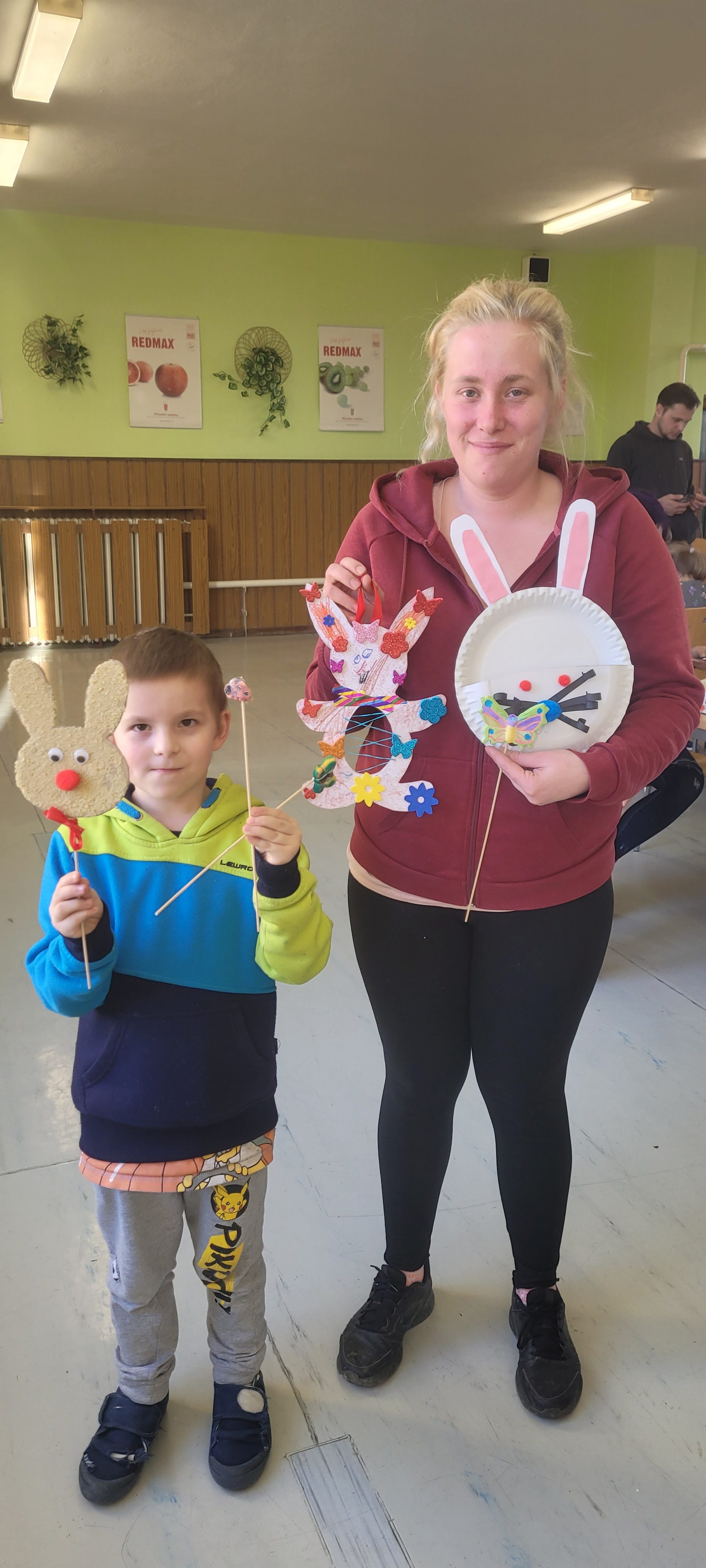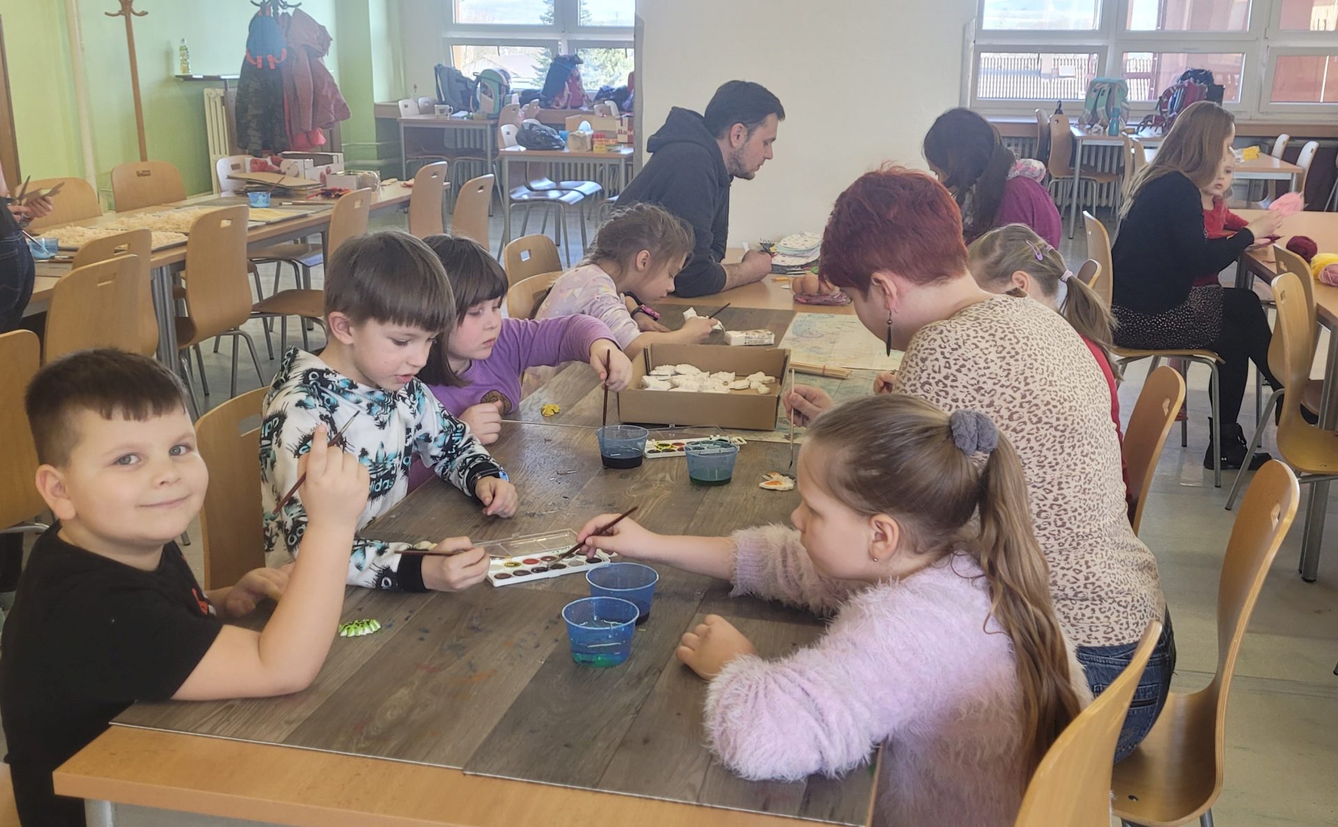 V předvelikonoční čas pozvali prvňáci své rodiče do školy na jarní dílnu. Chtěli si užít společného tvoření s dospěláky a nazdobit si své pokojíčky. V jídelně byla pro všechny nachystaná tvořící místa, kde si mohli podle vzoru zhotovit jarní dekorace nebo si vymyslet dekorace své. Malování vajíček voskem a zdobení sádrových odlitků šlo všem a i zajíčci z kuskusu či pilin se líbili.