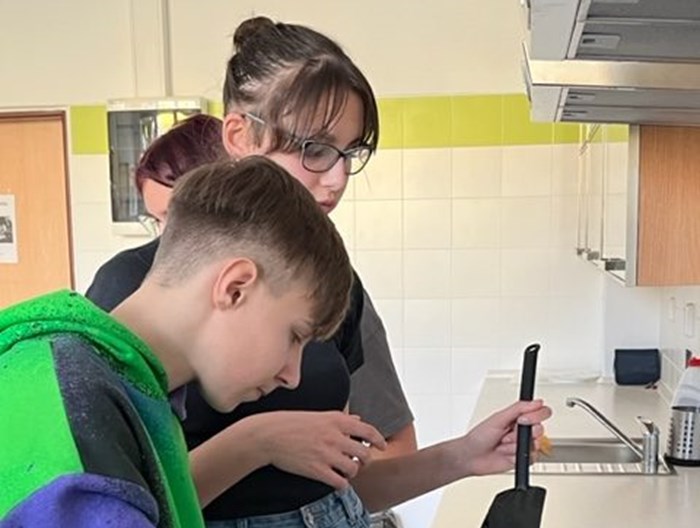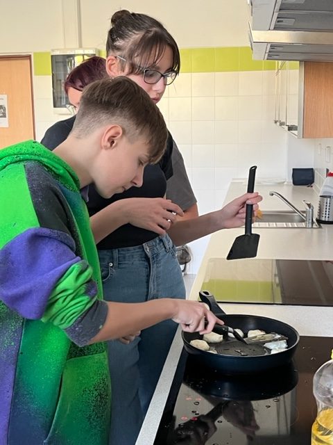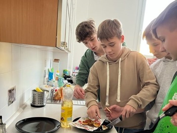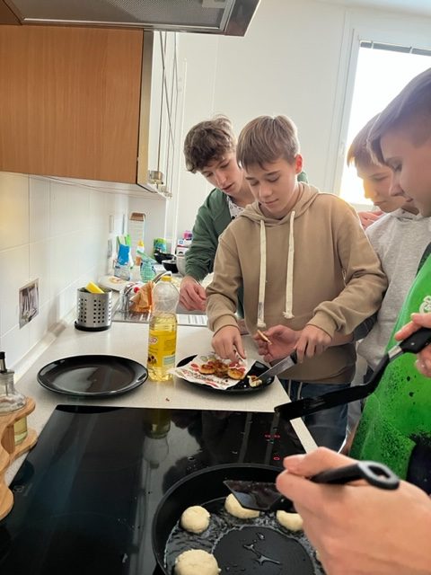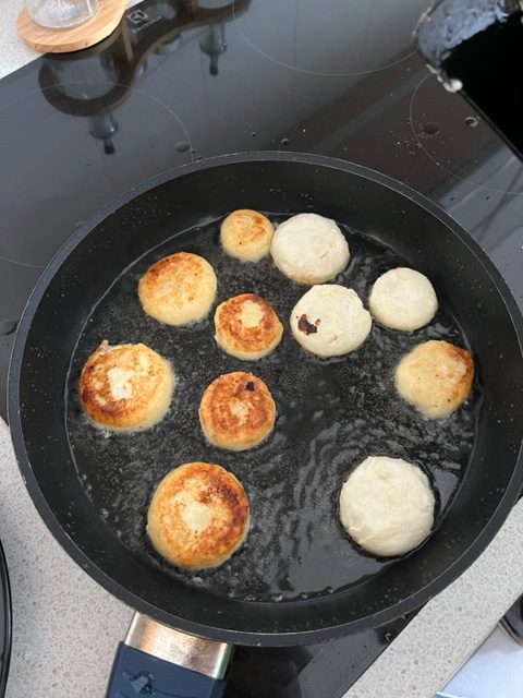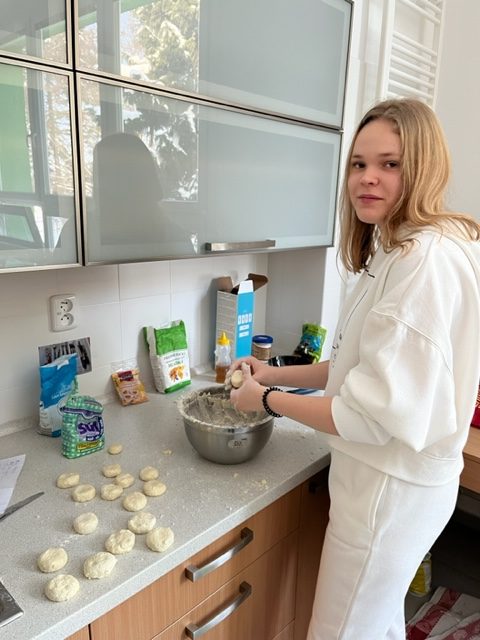 Dnešní poslední předvánoční hodina ruského jazyka byla tak trošku jiná. V IX. třídě právě probíráme téma vaření, a tak jsme se všichni společně domluvili, že si v naší cvičné kuchyni připravíme něco z ukrajinské kuchyně. Zadání bylo následovné: ať je to chutné a snadno připravitelné. Nakonec vyhrál pokrm zvaný Syrníky. Zde přidávám recept od „strýčka GOOGLA“: 250 g měkkého tvarohu ve vaničce, 70 g hladké mouky, 1 vejce velikosti M (55 g), 30 g cukru (2 lžíce), 1 lžička kypřicího prášku do pečiva, špetka soli, troška vody. Syrníky jsou něco jako naše lívance. Pochází z Ukrajiny, ale podobné najdete i v Polsku nebo Rusku. Dají se připravit sladké i slané. Naši spolužáci Anna a Denis se do přípravy pokrmu vrhli s vyhrnutými rukávy. Vše šlo hladce, a práce nám šla společně od ruky. Hodinu jsme si užili a „Syrníky“ nám moc chutnaly.