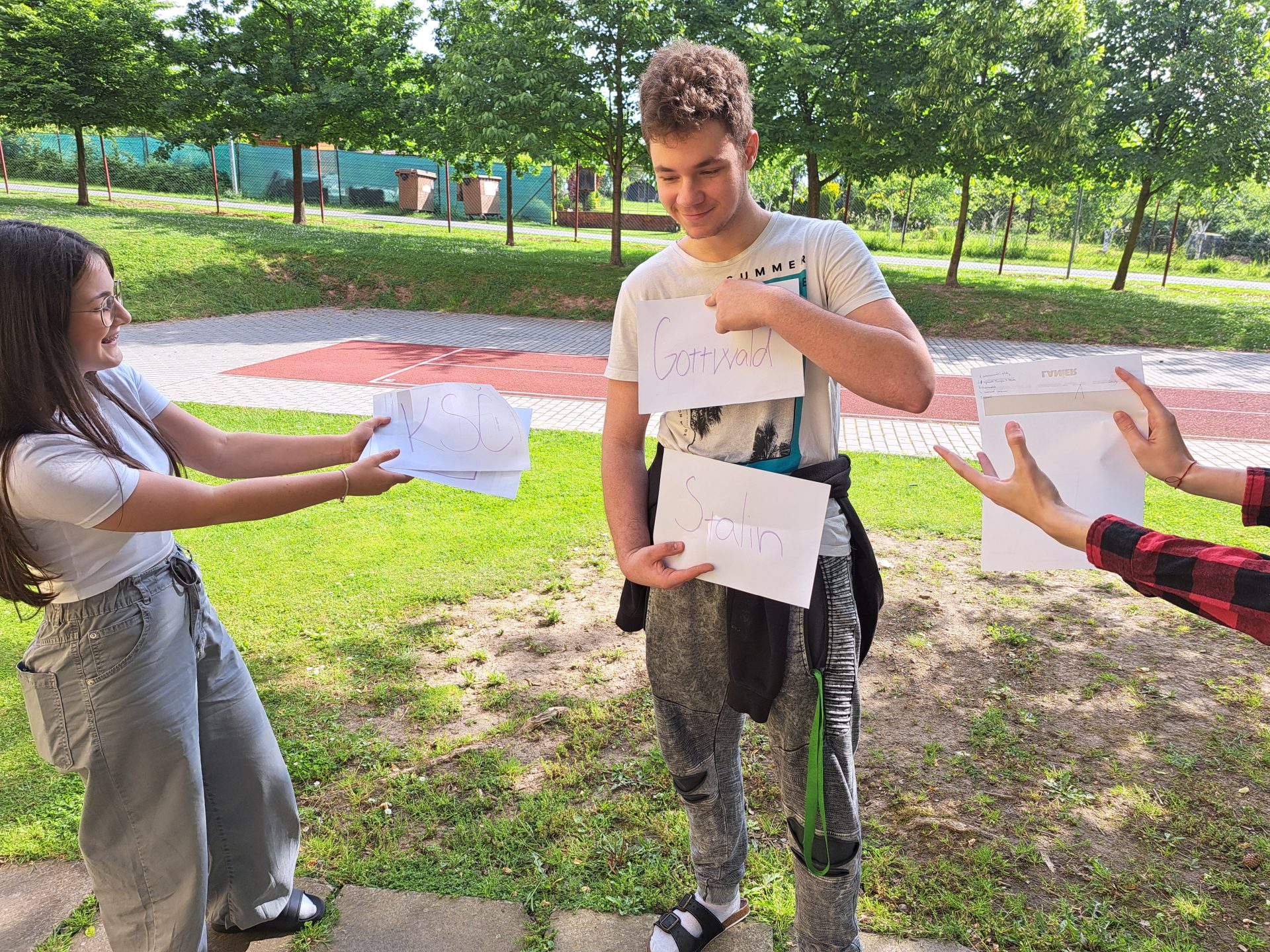 Jakmile byly všechny skupiny hotové, ptali se nás učitelé na otázky, poté herci hráli scénky a my hádali co zobrazují, no a nakonec nám komunisté/cenzoři podali svoji verzi historie.