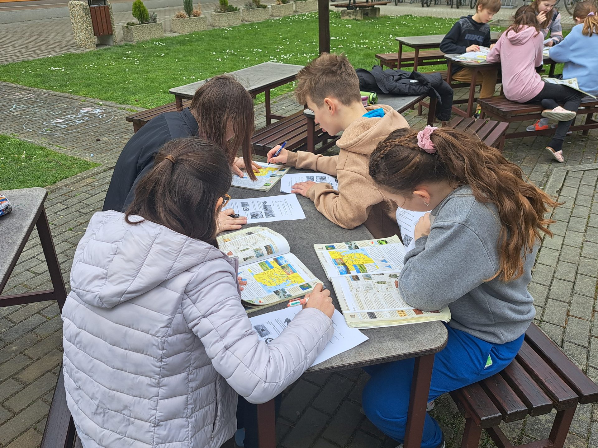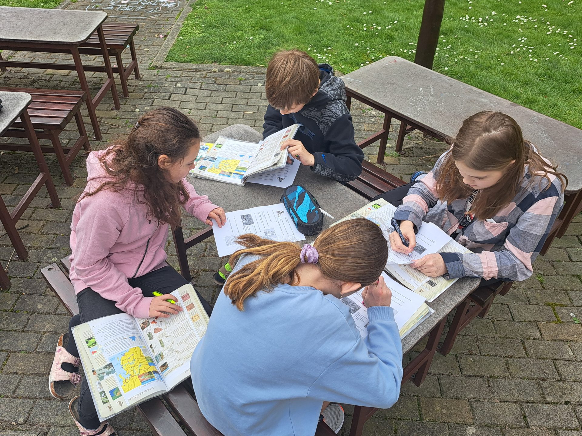 Jednu slunečnou středu jsme se měli seznámit se Starověkou Čínou, proto jsme přesunuli výuku na školní zahradu a ve skupinkách pátrali v učebnici po odpovědích z pracovního listu.