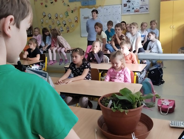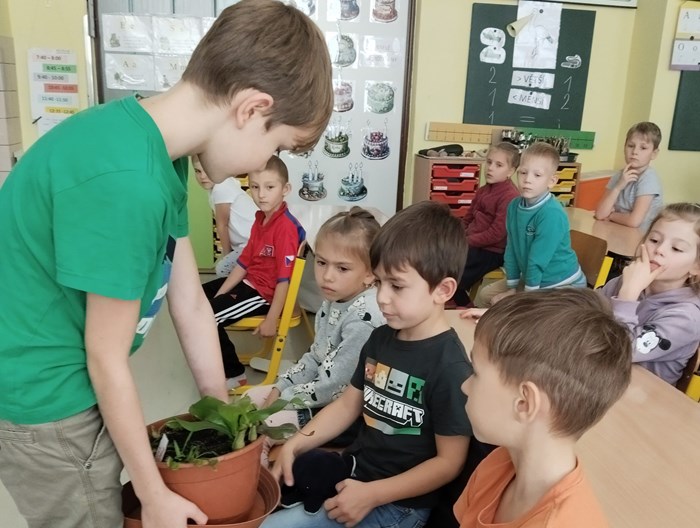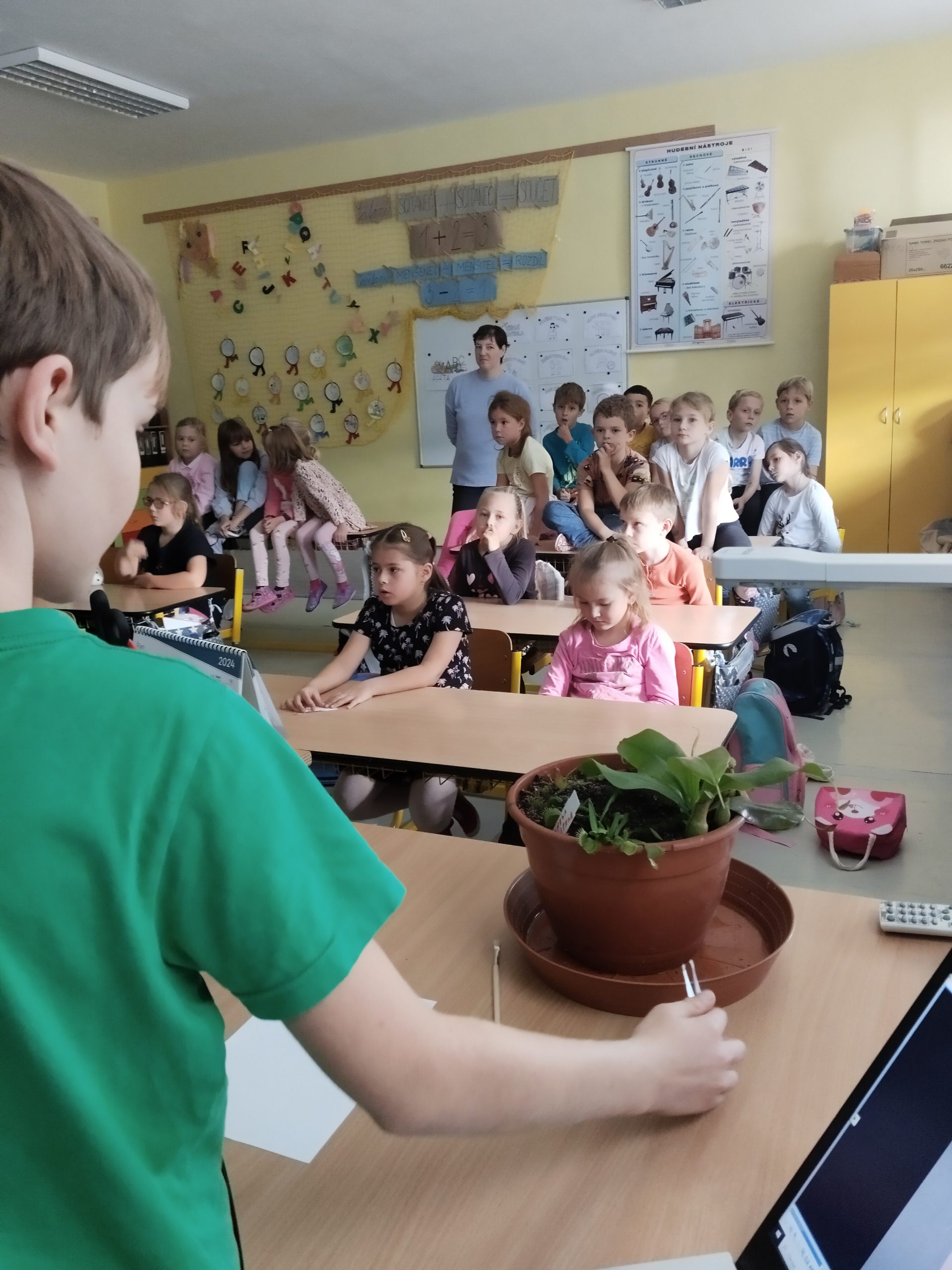 S paní učitelkou Buksovou jsme se dohodli, že bych mohl 1. A i 1. B popovídat o svém koníčku pěstování masožravých rostlin. Moje povídání začalo ukázkou z filmu „Adéla ještě nevečeřela“. Pak jsem jim začal povídat, jak je to s masožravkami doopravdy. Představil jsem jim svou láčkovku, rosnatku i mucholapku. Paní učitelka mi celou dobu pomáhala s technikou, aby si je děti mohly prohlédnout zblízka. Nakonec měli děti i plno dotazů, na které jsem se snažil odpovědět. Měl jsem z toho povznášející pocit.