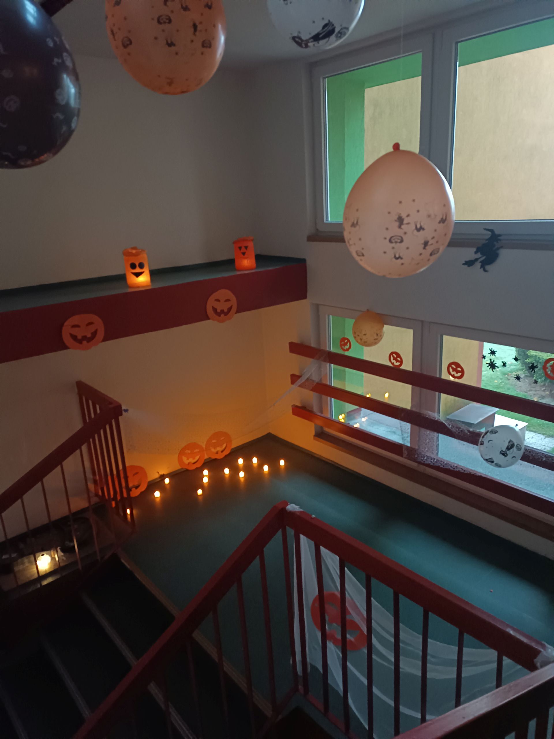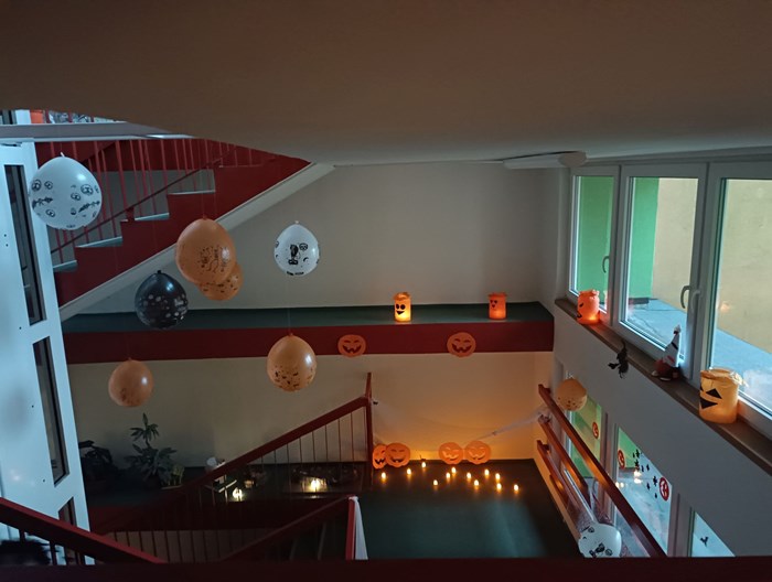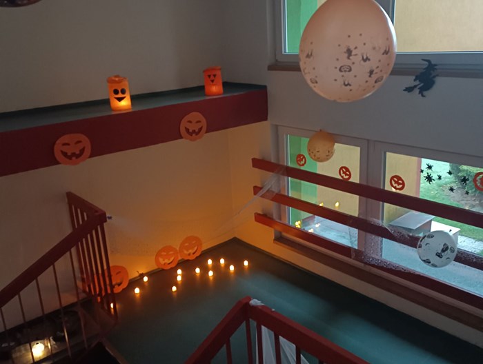 Naše škola se rozhodla připojit k oslavám Halloweenu výzdobou schodiště, která navodí tu správnou podzimní a strašidelnou atmosféru. Žáci se také zapojili do výzdoby. Vytvořili jsme pavučiny z nití, zavěsili balónky s motivem Halloween. Černé kočky, strašidelné čarodějnice a další dekorace dotvářejí atmosféru, která nás provázela při každém kroku.