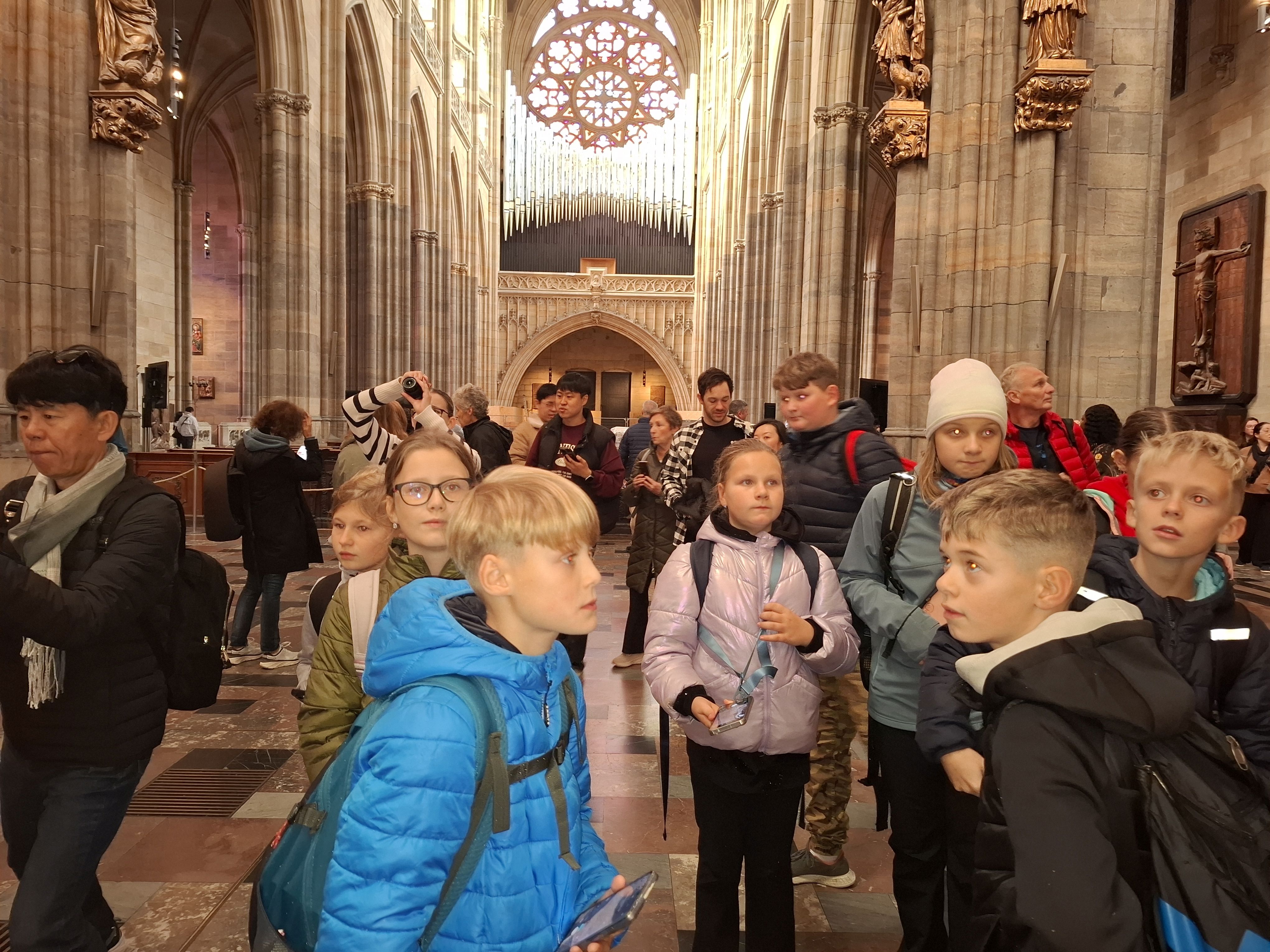 Na pražském hlavním nádraží nás přivítala milá paní průvodkyně a společně jsme se vydali objevovat krásy Prahy. Metrem a tramvají jsme se dopravili na Hradčany, kde jsme obdivovali Chrám sv. Víta, Královský palác a známou Zlatou uličku. Nechyběla ani procházka po Karlově mostě a zastávka u slavného orloje, který nás svým představením nezklamal. A pak přišlo něco opravdu speciálního - návštěva Muzea fantastických iluzí. Ocitli jsme se uprostřed optických klamů a trikových obrazů, které nás bavily, překvapovaly a občas i pěkně zmátly.